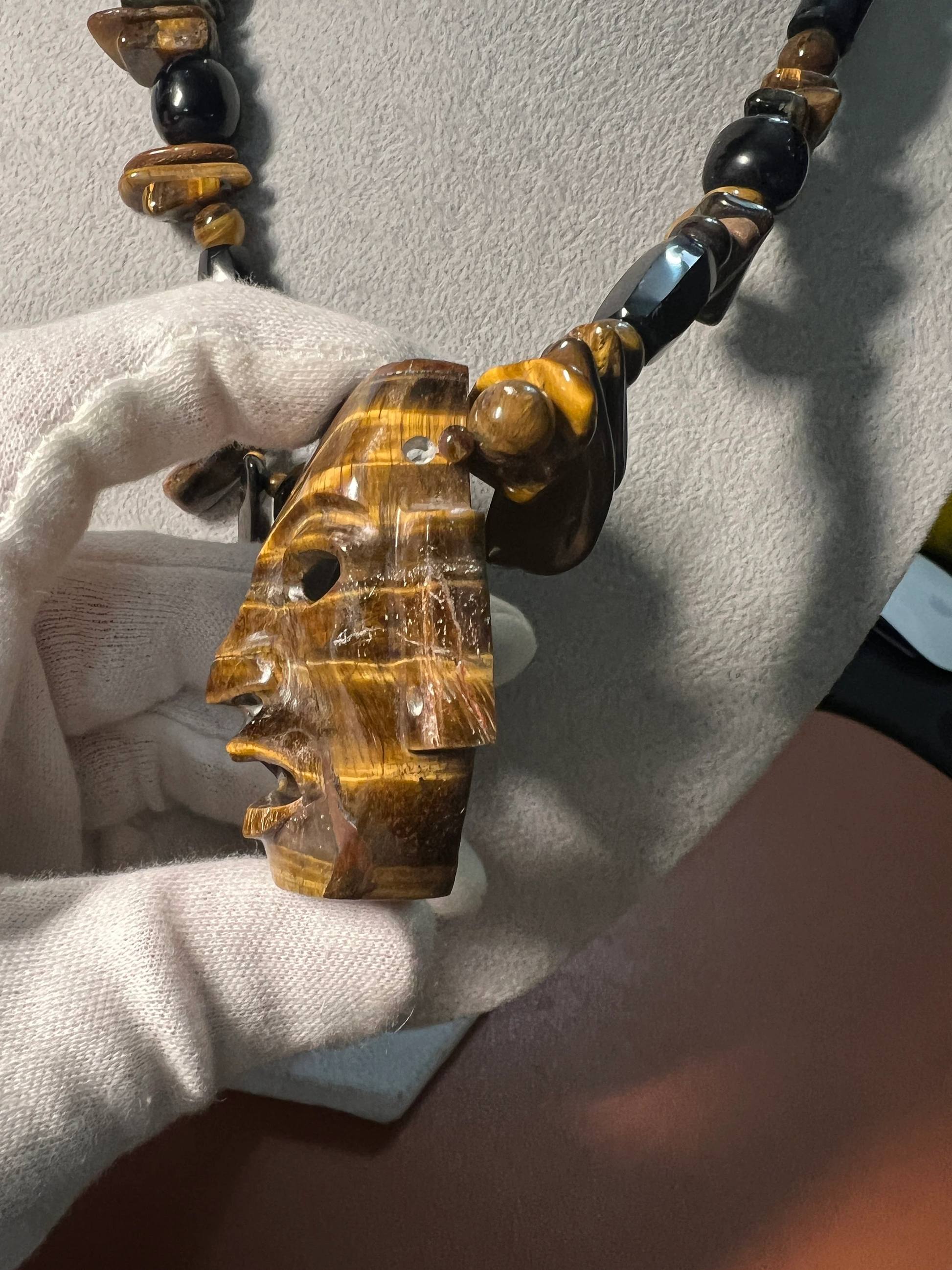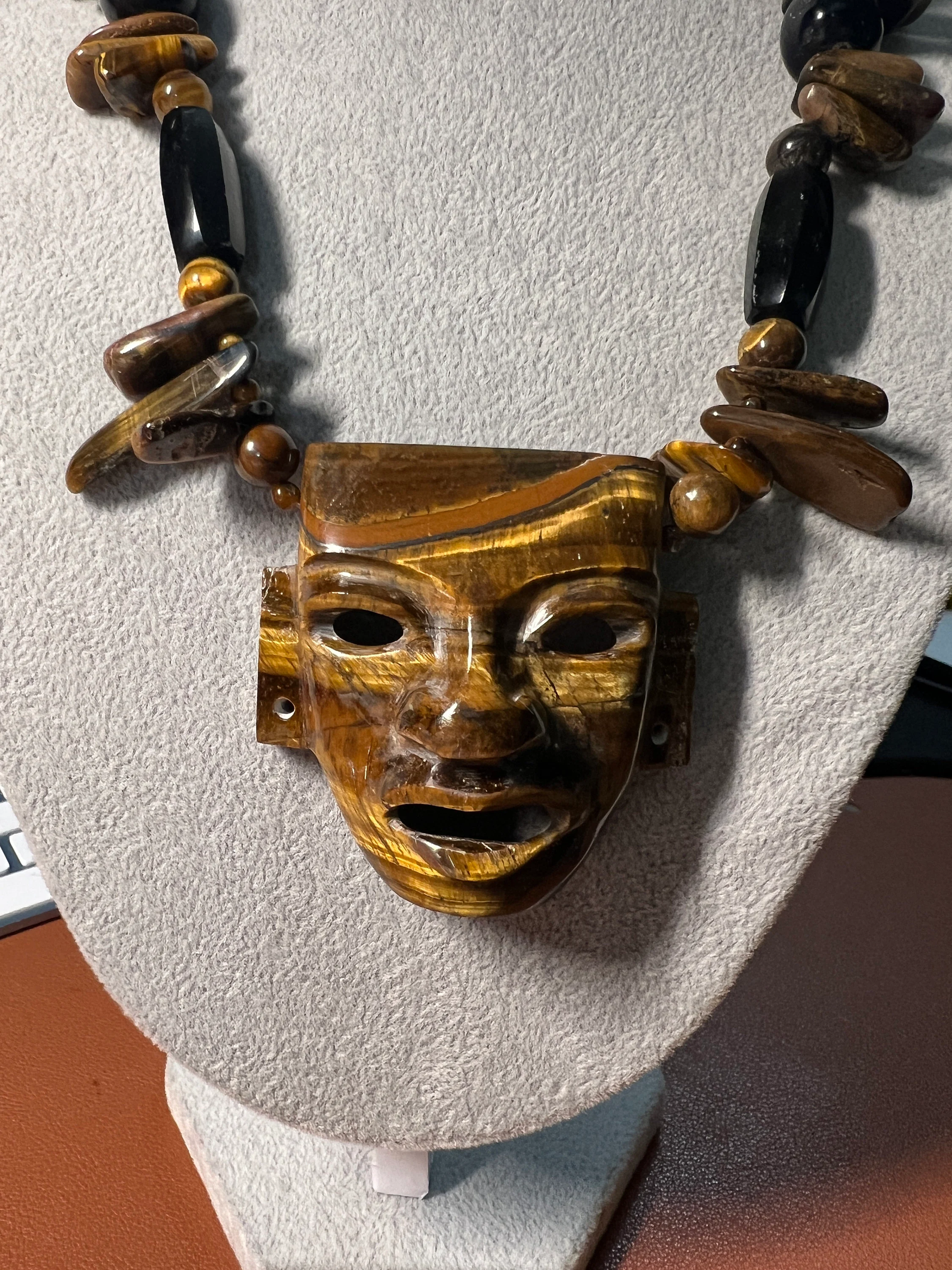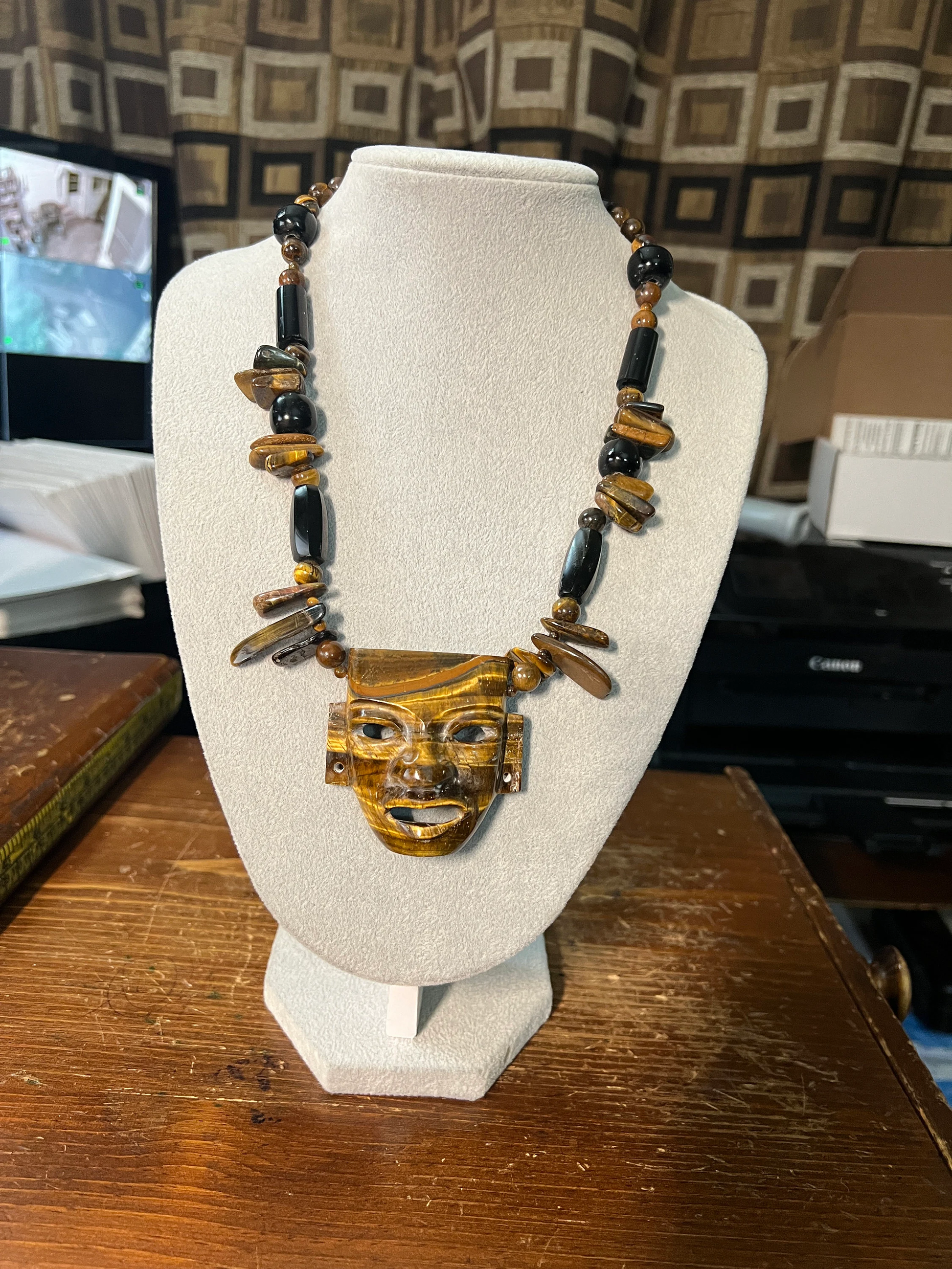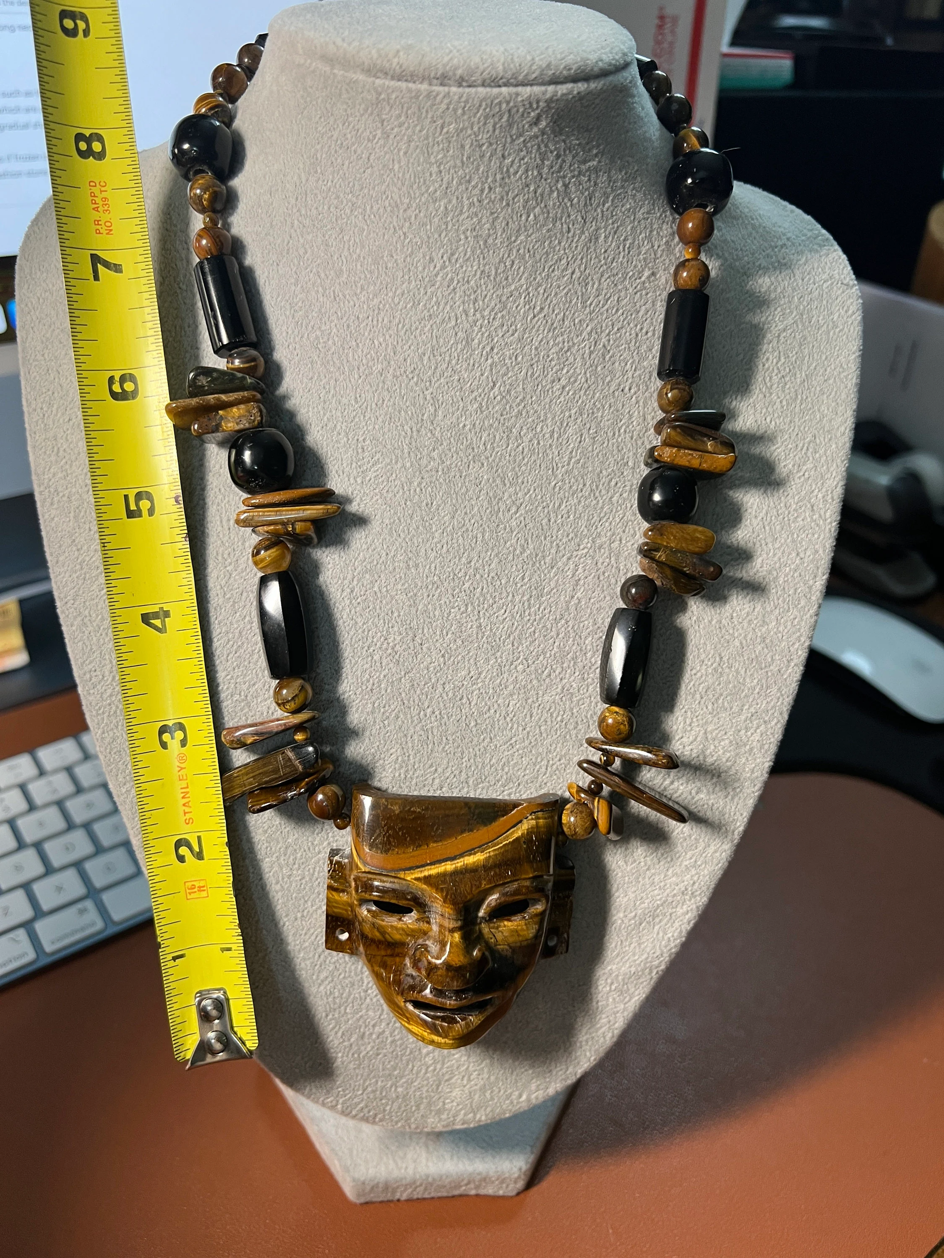 Large Teotihuacan Face Mask Tiger Eye Stone Pendant Necklace, 20" long necklace.