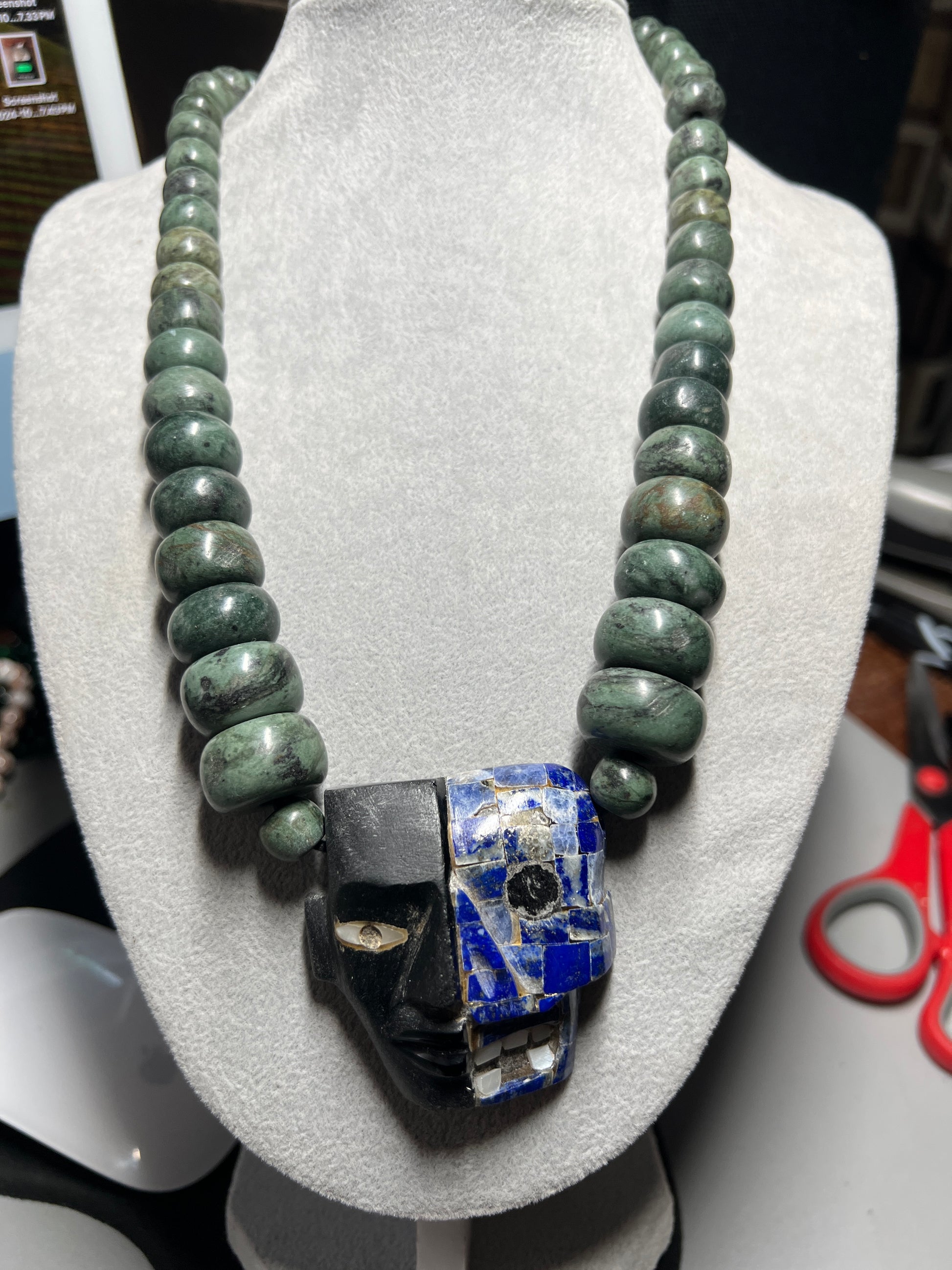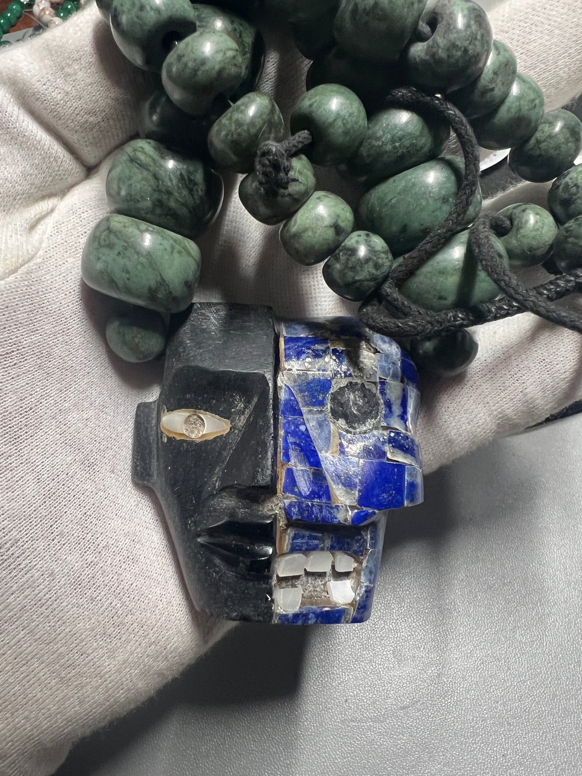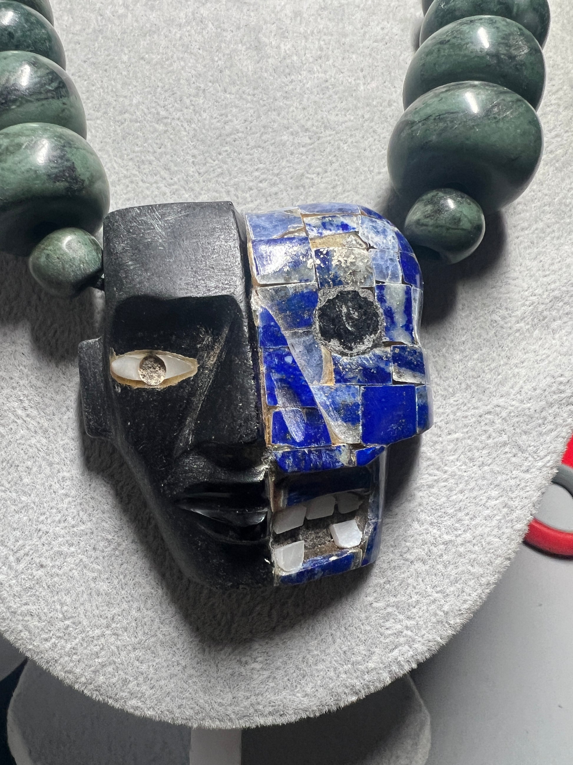 Life and Death Mayan Aztec Mask Pendant Necklace, Obsidian, Blue Soladite, Mother of Pearl