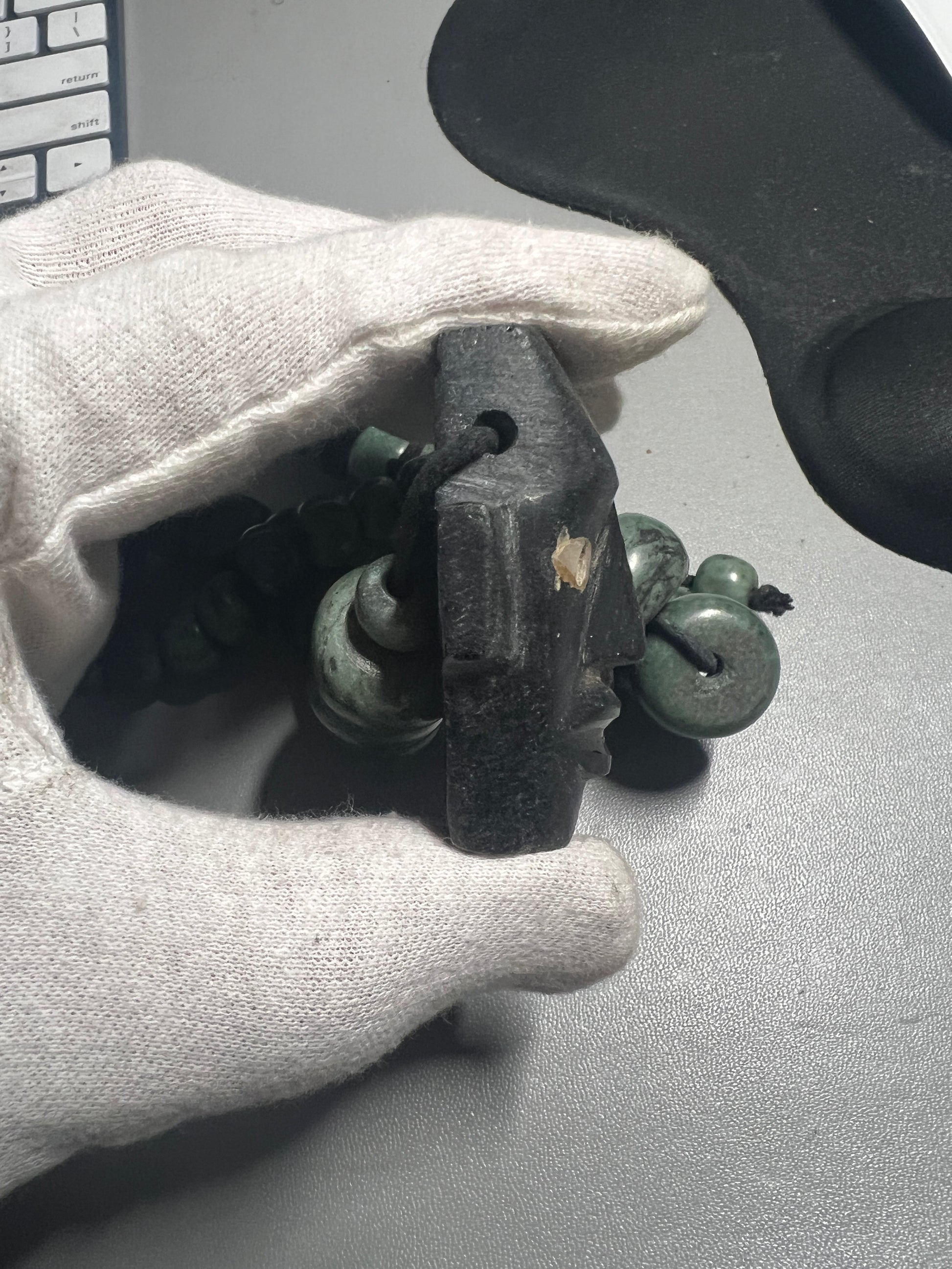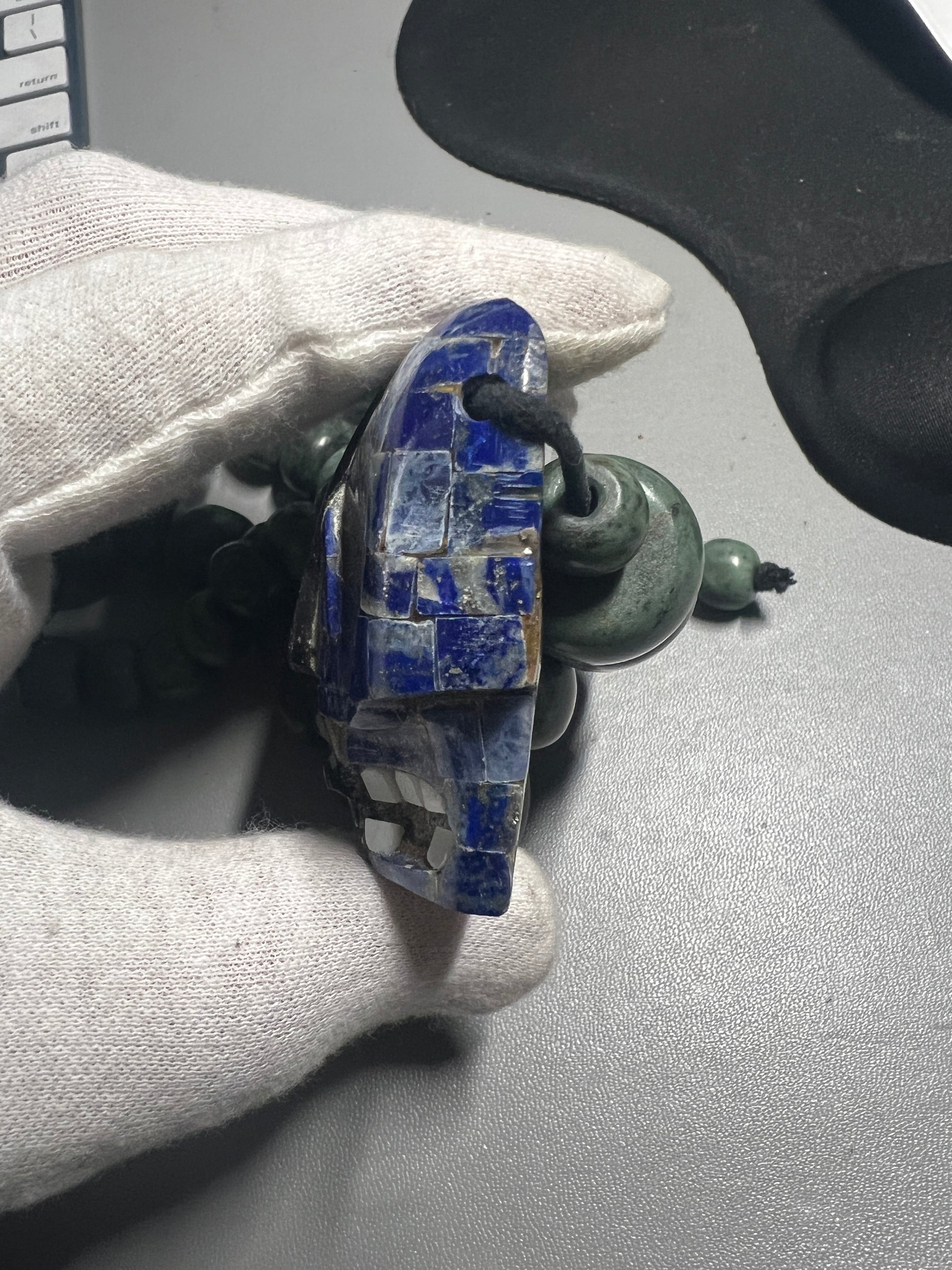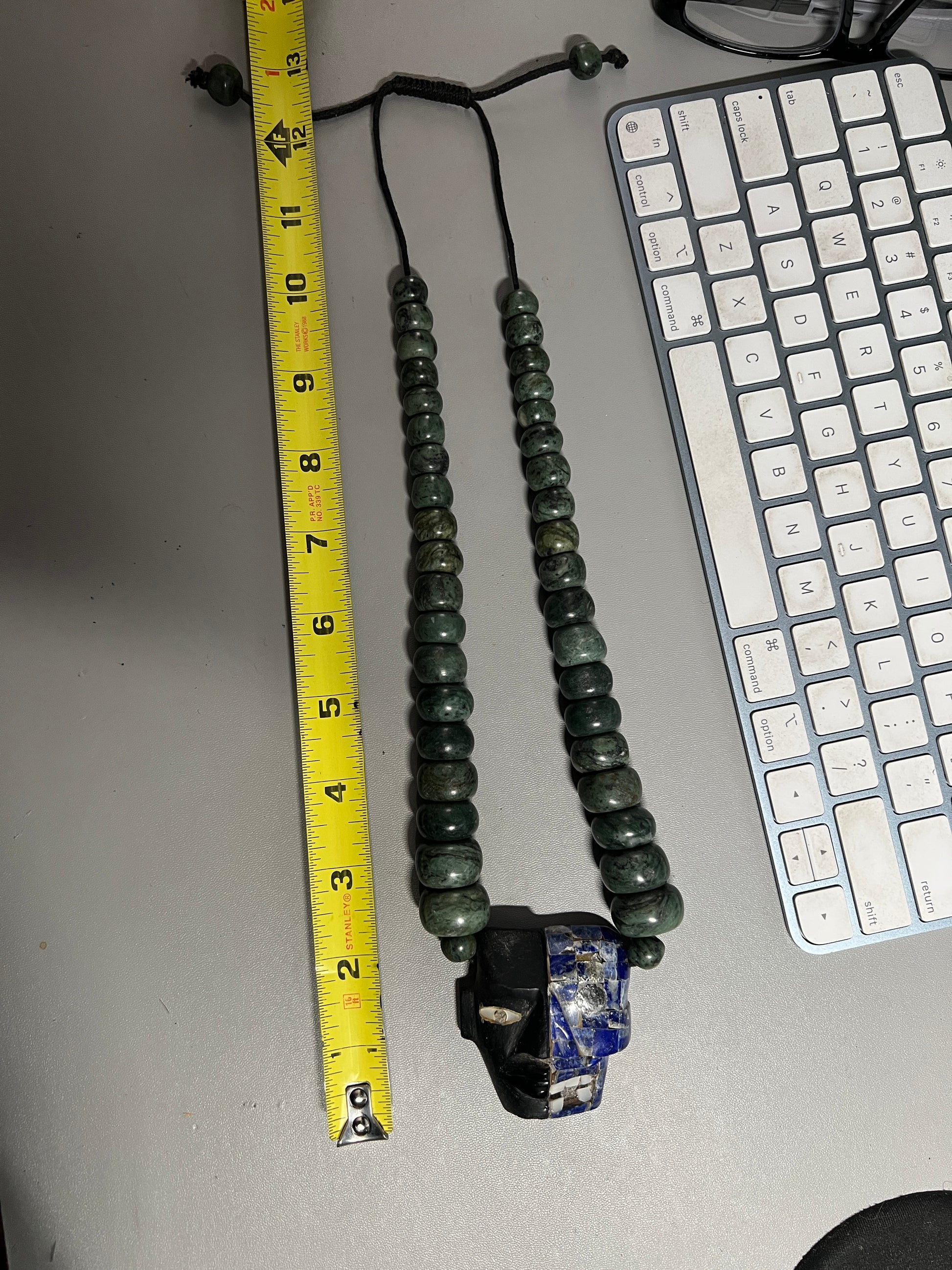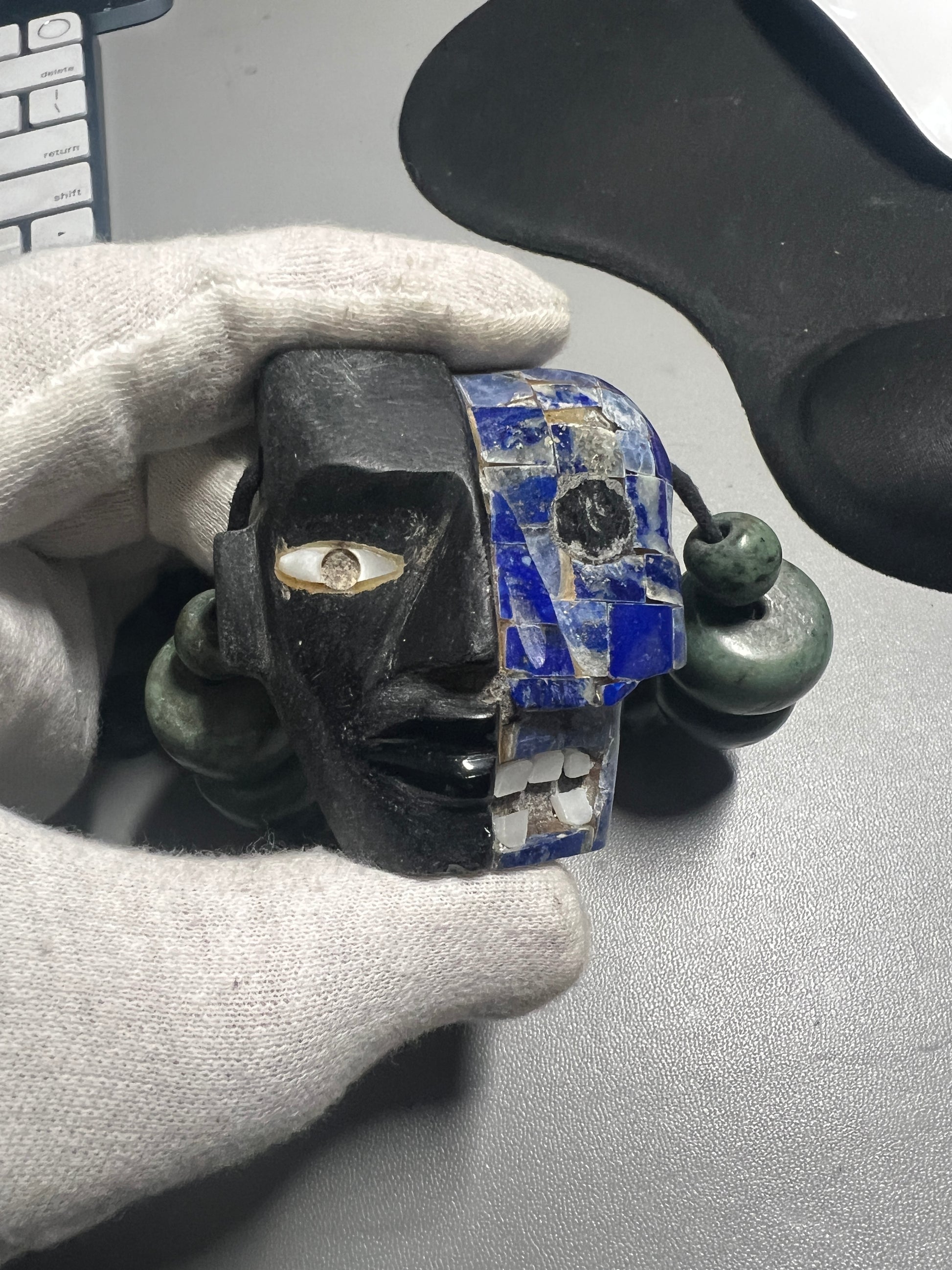 Life and Death Mayan Aztec Mask Pendant Necklace, Obsidian, Blue Soladite, Mother of Pearl