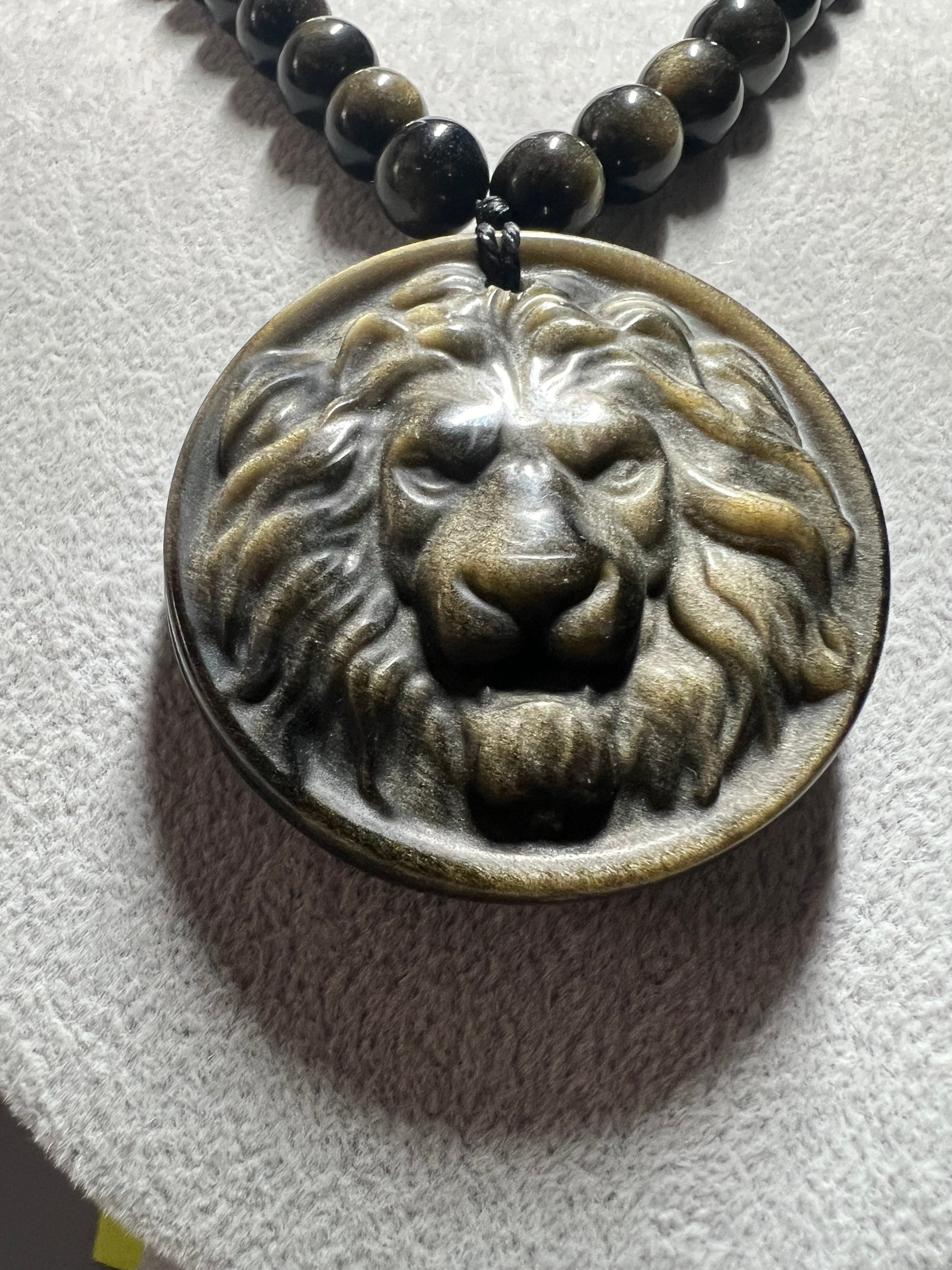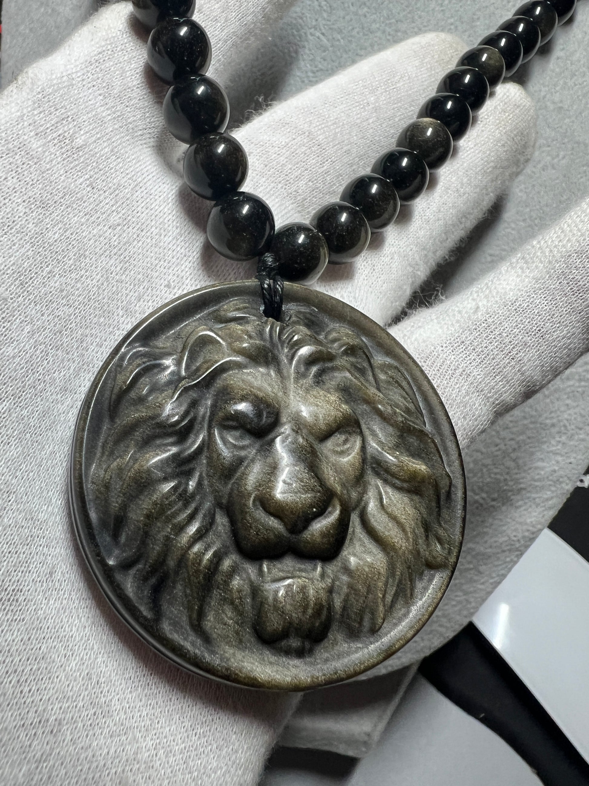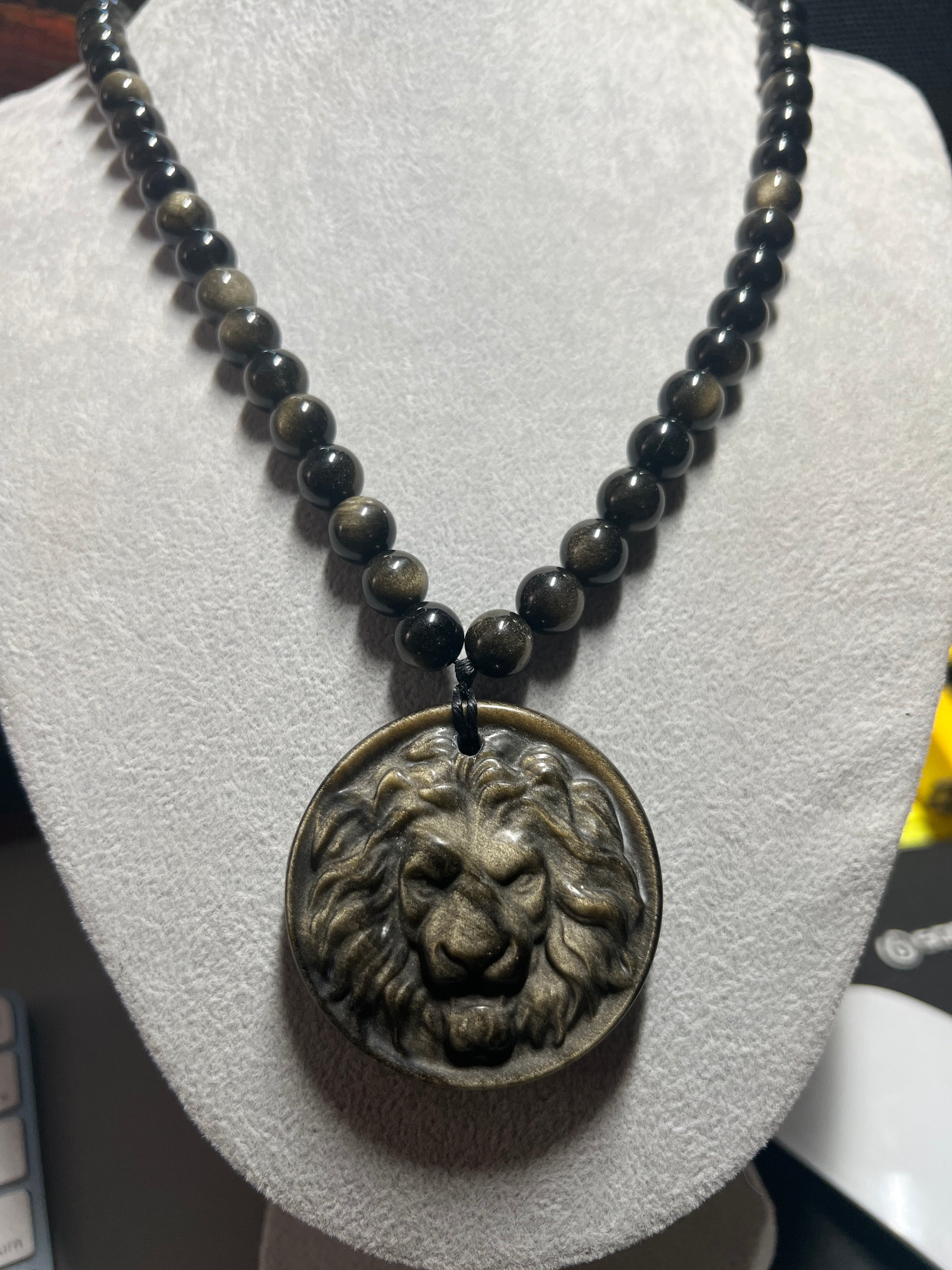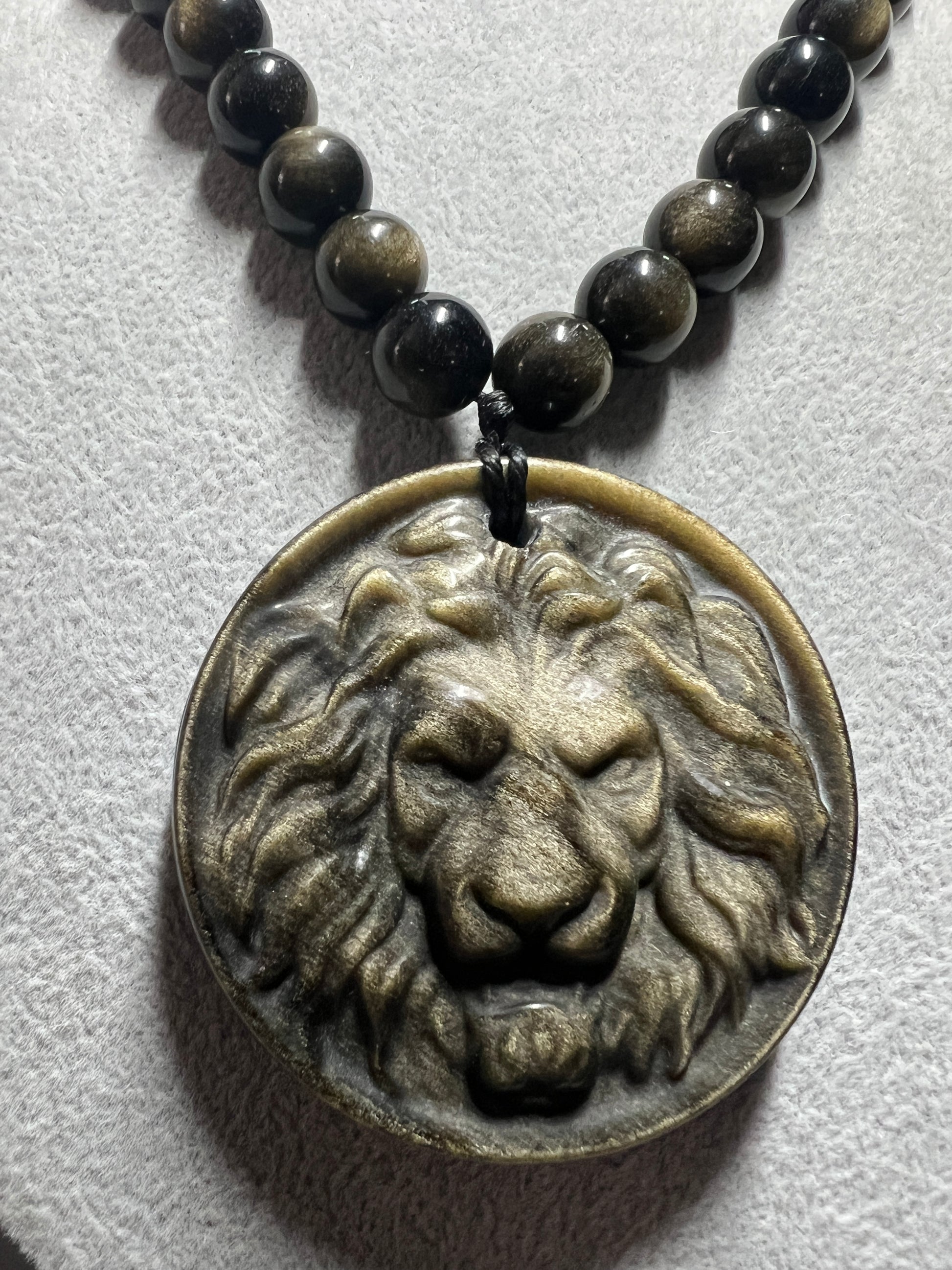 Lion Gold Obsidian Pendant Beaded Necklace, Lions, King of Jungle, Rare, Unique (#16)