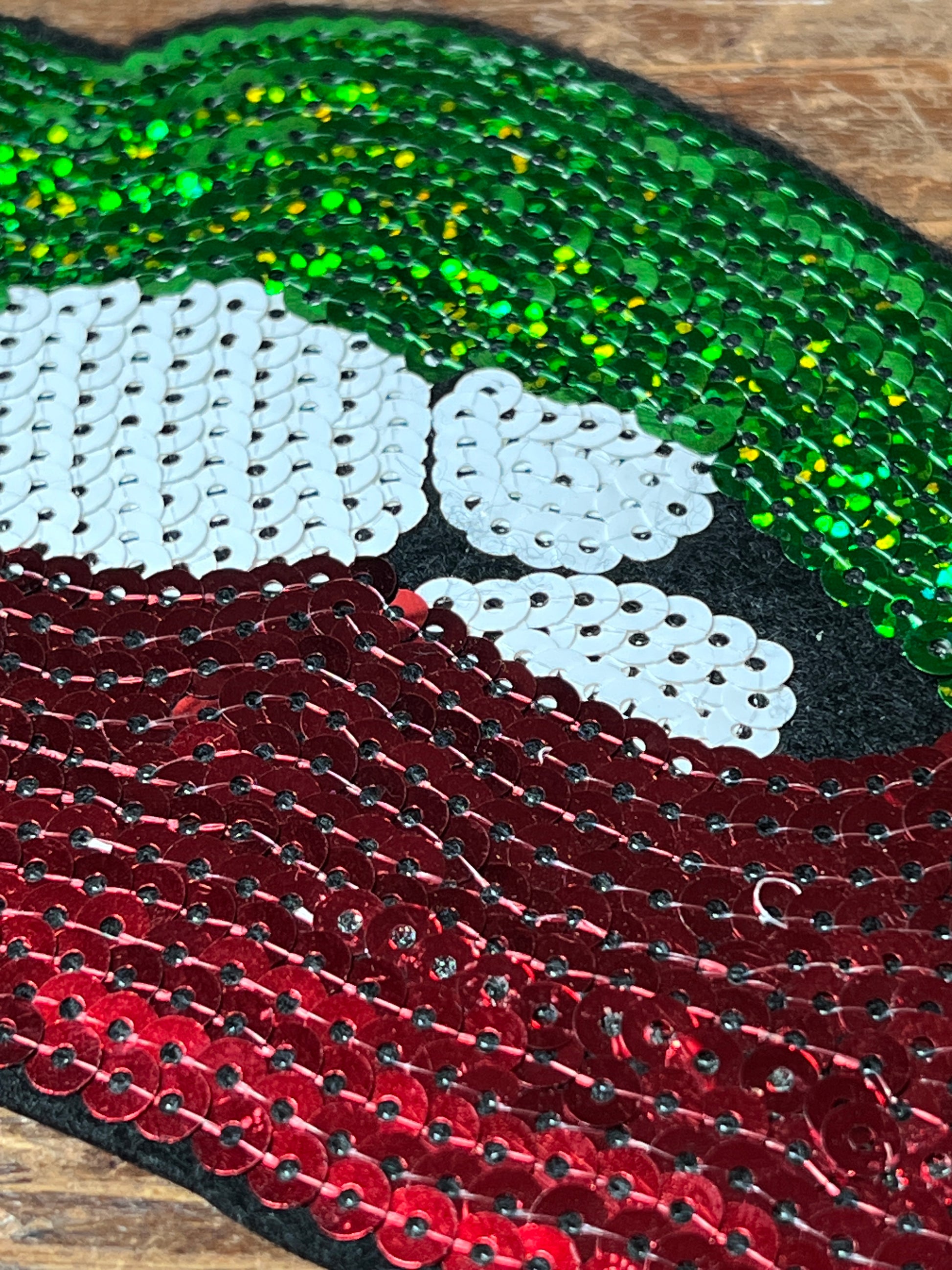 The "Mexican Kiss Bite" iron-on patch features a design of sexy lips adorned with sequins, creating a glamorous and eye-catching embellishment. With a large size of 9 inches, this patch is sure to make a statement when added to clothing or accessories. The patch is themed around the Mexican Flag's colors and is 100% made in Mexico, adding a touch of cultural flair to any project. Perfect for adding a touch of sparkle and personality to your sewing or crafting creations.