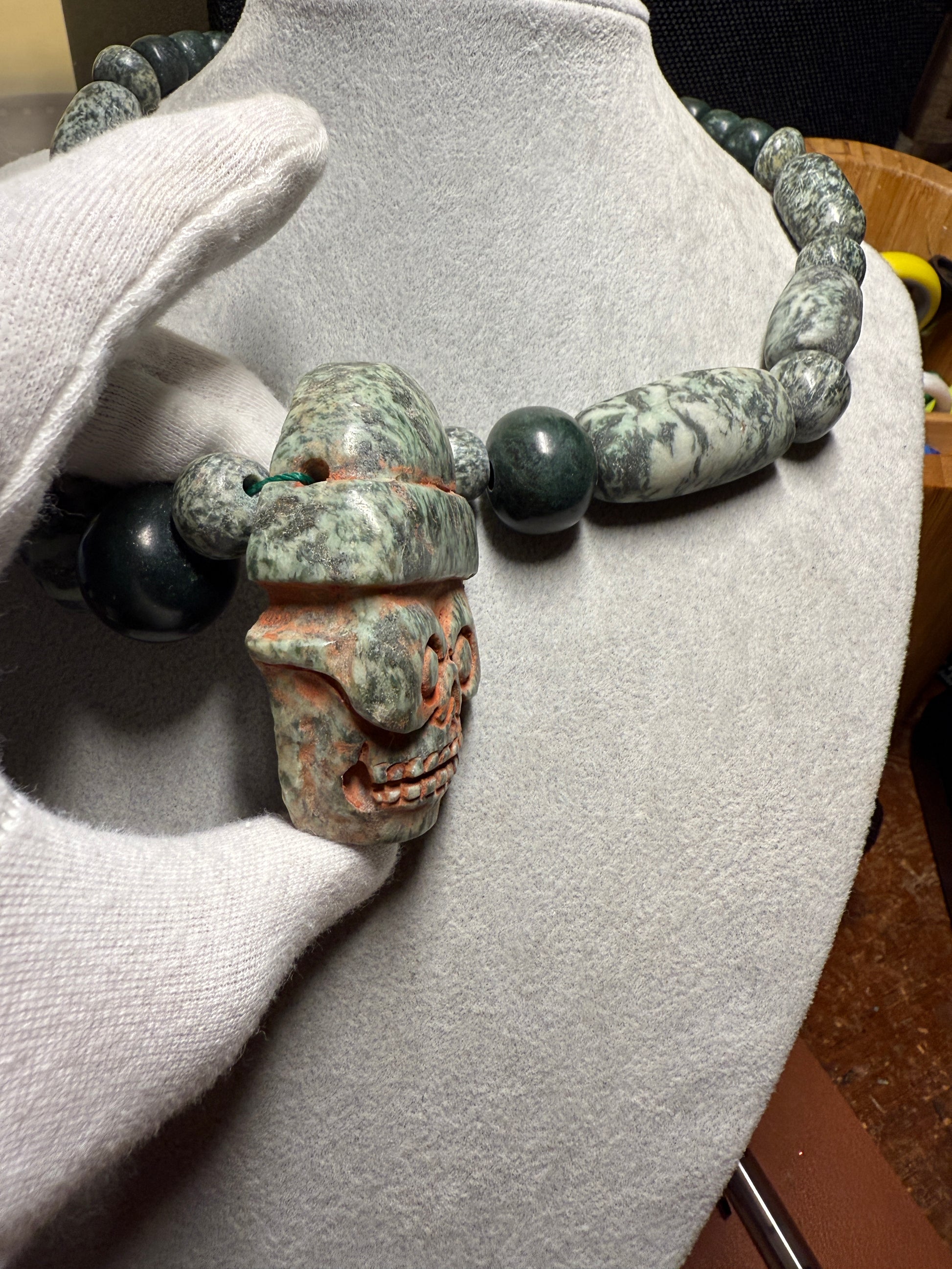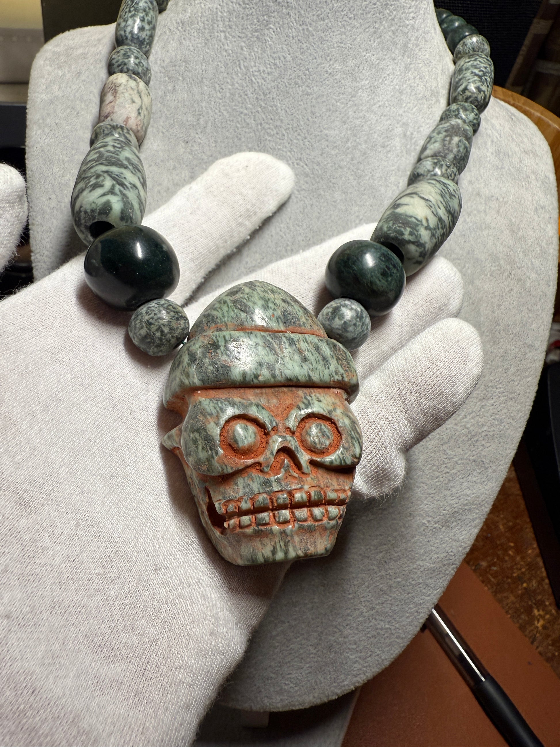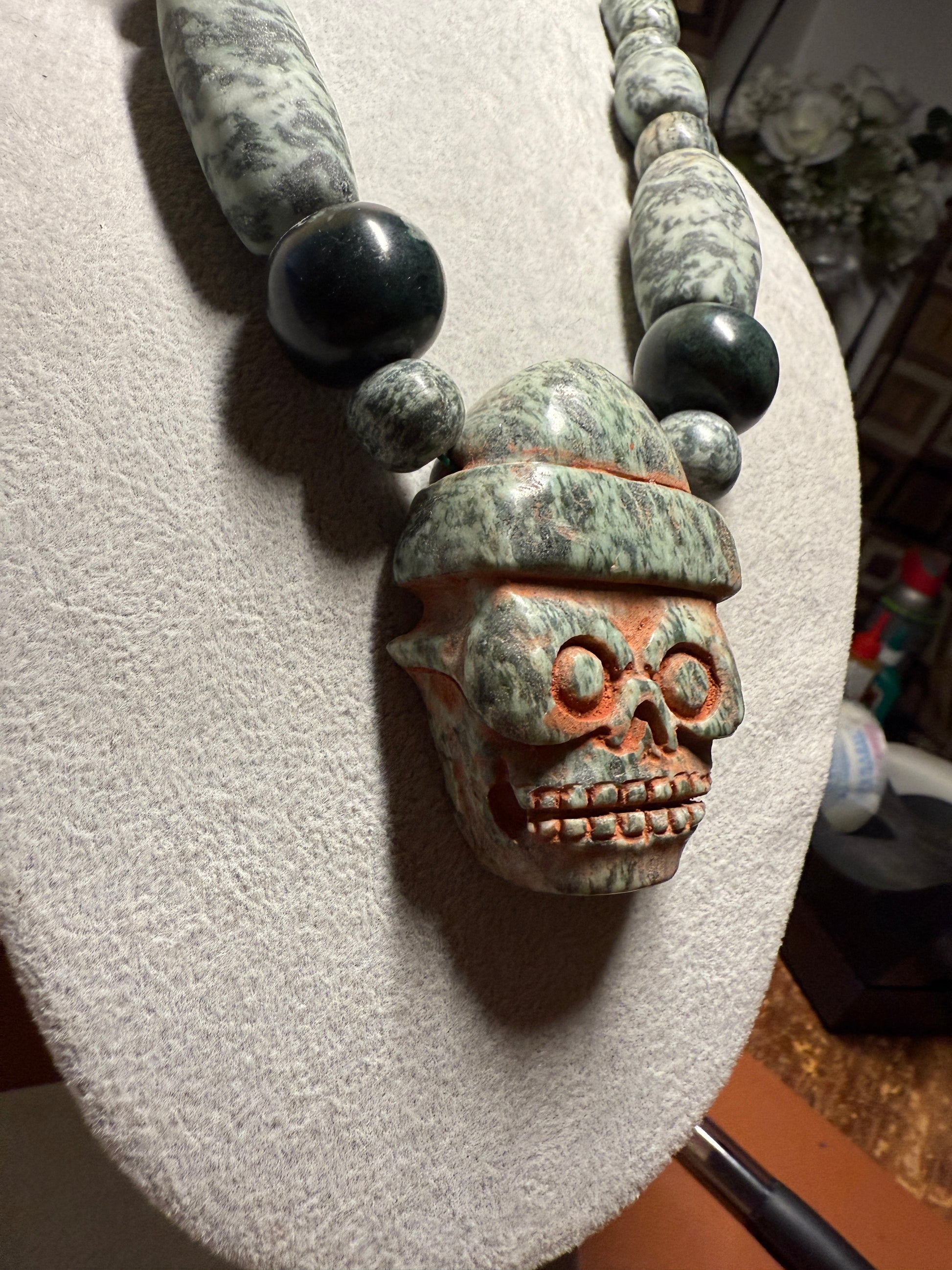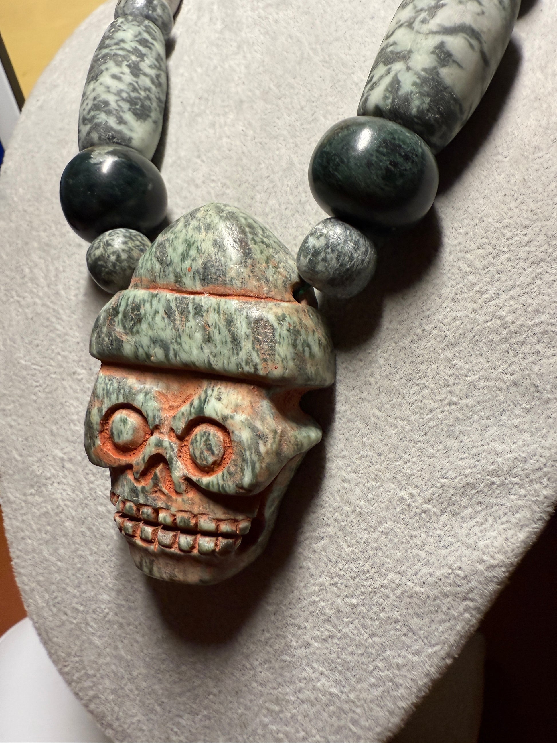 Embrace the mystique of ancient Mexico with the Mictlantecuhtli Granite Aztec Death Lord Necklace. This piece is a stunning blend of cultural iconography and modern style, featuring a striking green granite stone that captures the essence of the Aztec underworld. The granite and Guatemalan marble beaded necklace, meticulously crafted, represents the god of death, Mictlantecuhtli, and is sure to make a statement. With its unique design, this necklace is a bold accessory that adds a touch of indigenous flair to any outfit. Whether you're a collector of unique jewelry or seeking a standout piece, the intricate beadwork and the pendant's significance offer a rare glimpse into the rich tapestry of Mexican heritage. Adjustable.