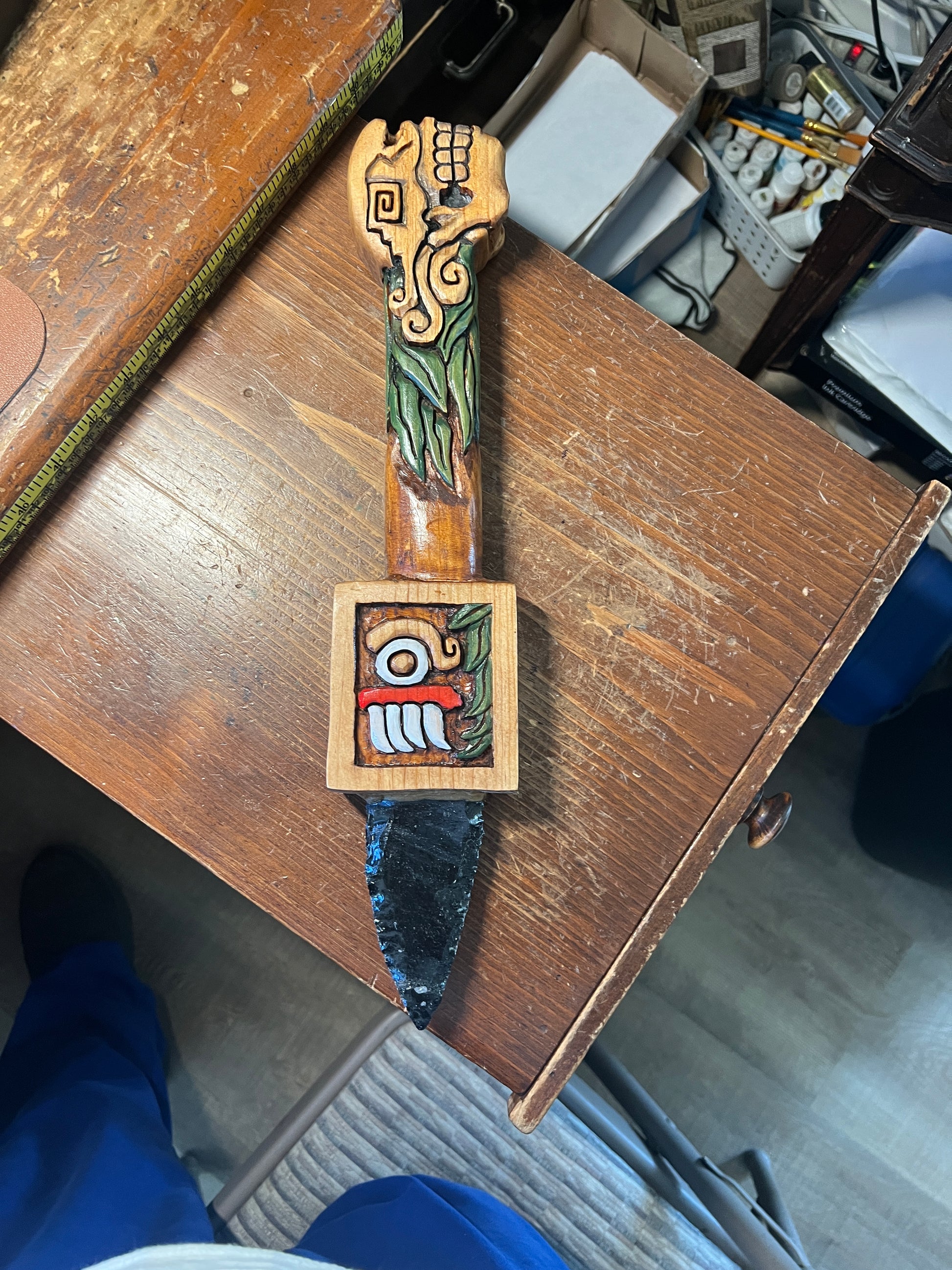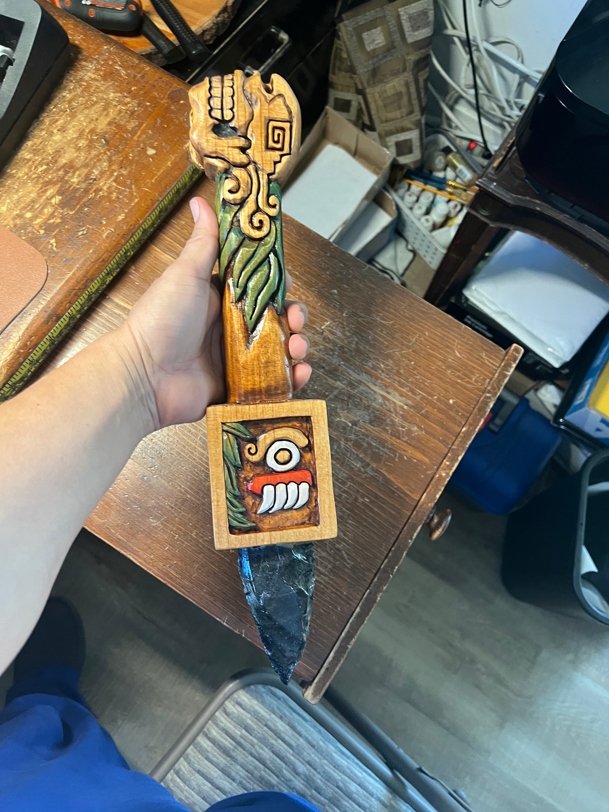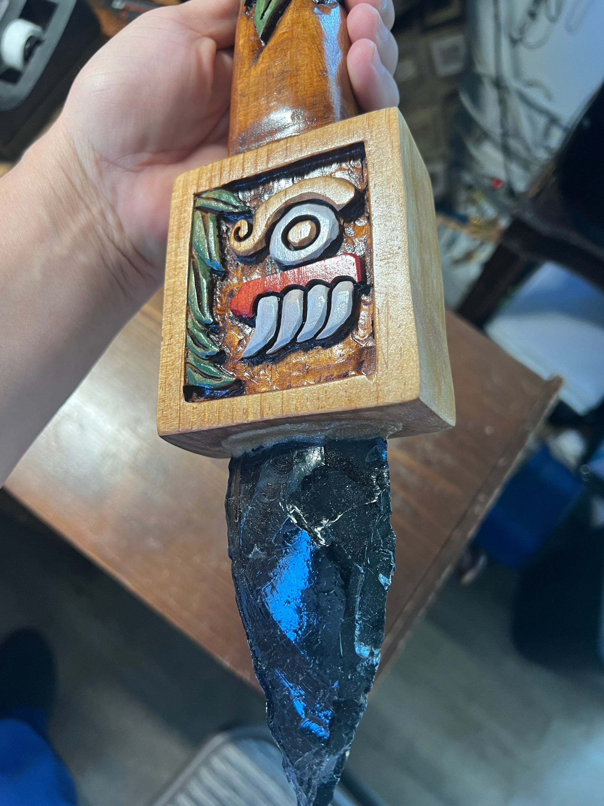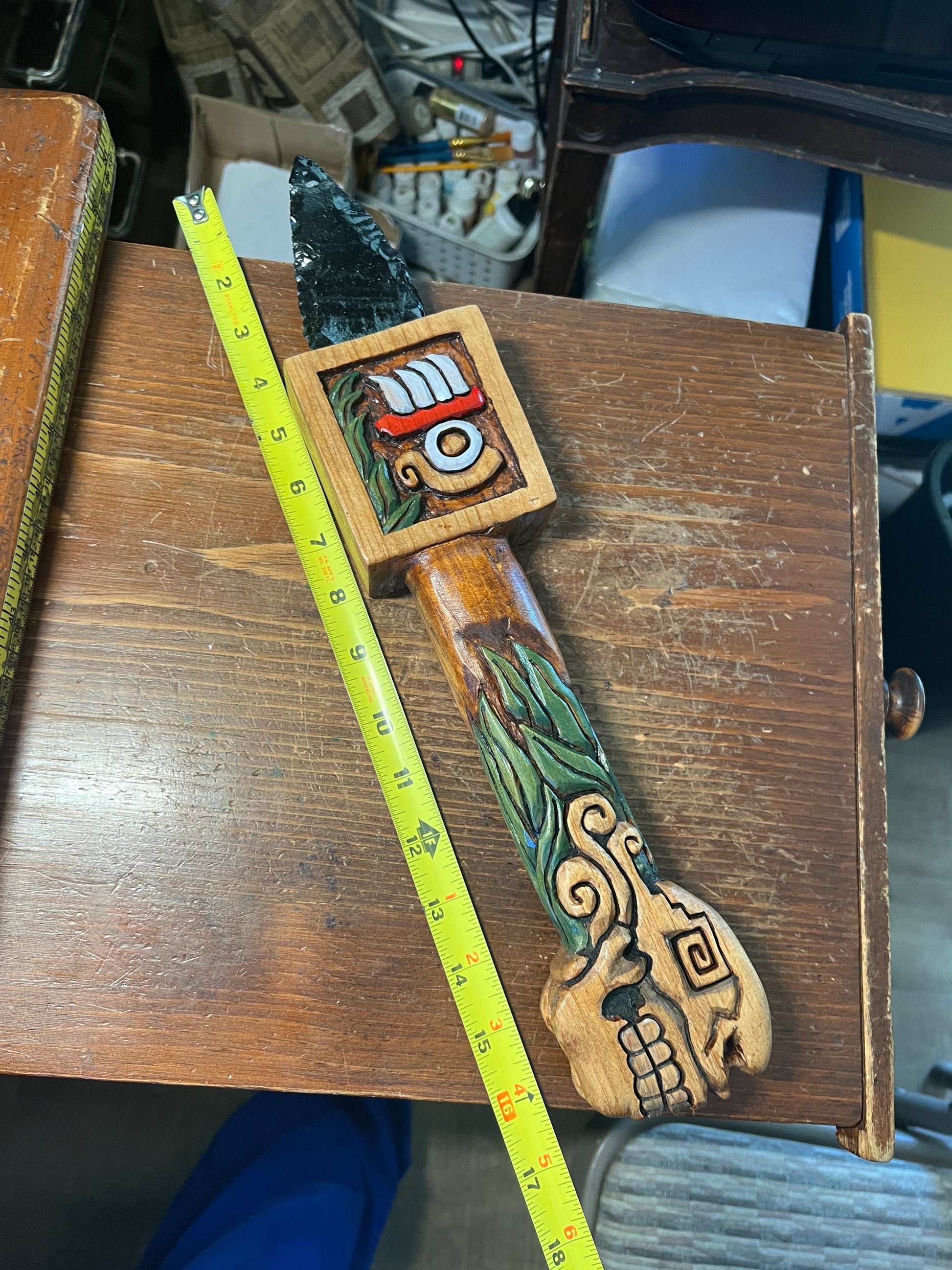 Mictlantecuitli Tlaloc Wood Obsidian Sacrificial Dagger, Aztec Dagger, Skull Daga, 17" Long, Deep Carved Wood