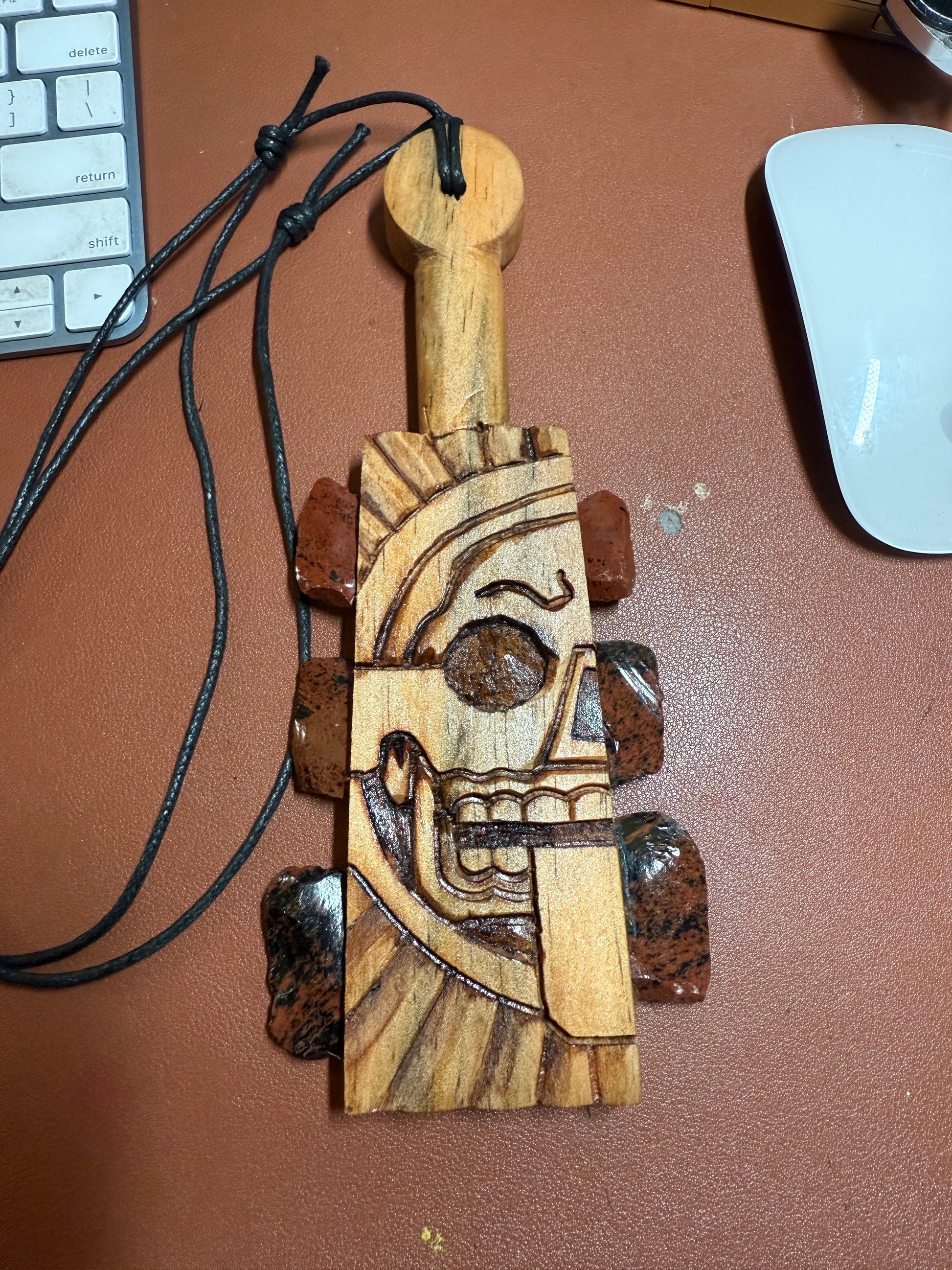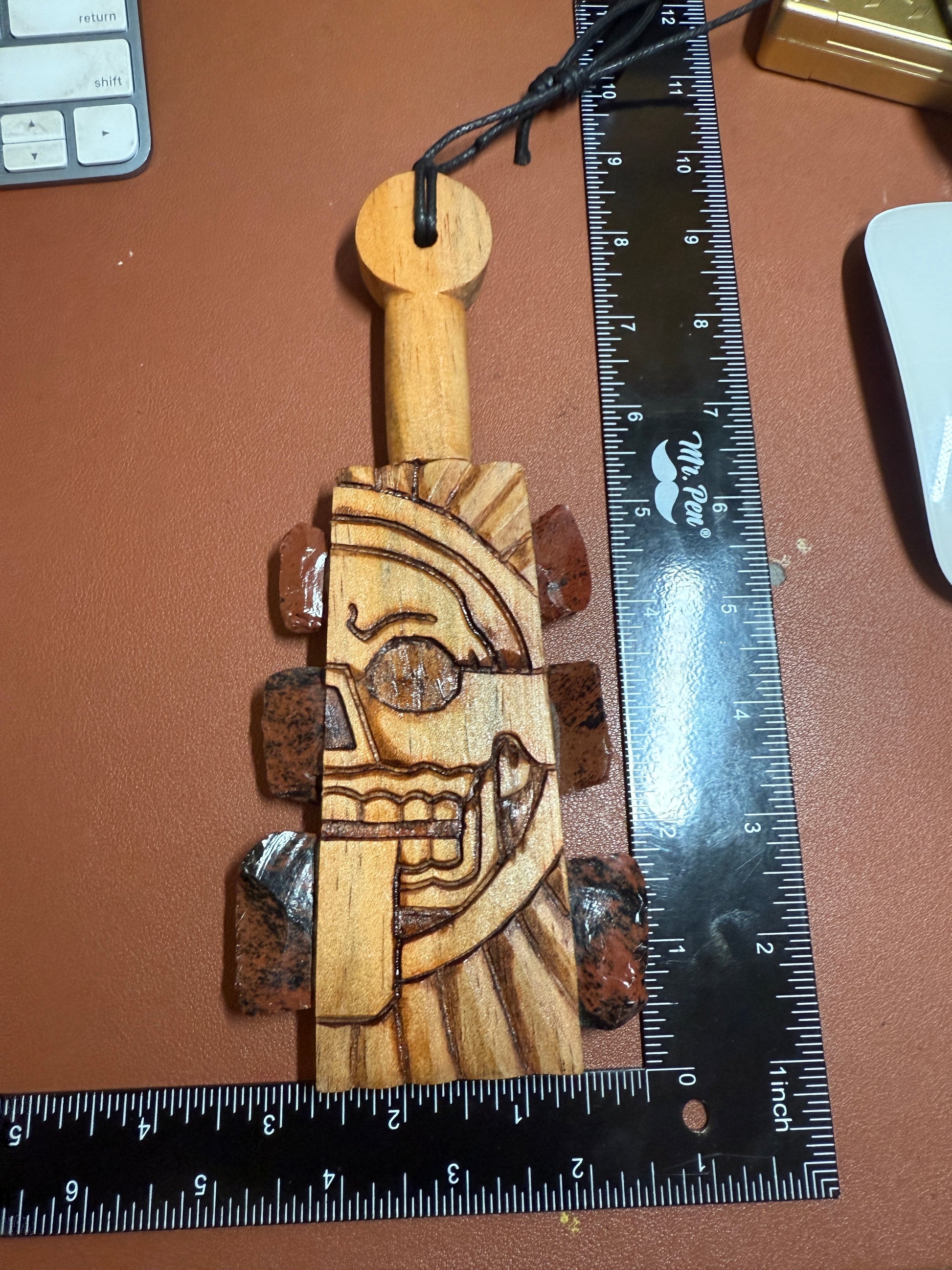 Mini Macuahuitl Azteca Necklace, Piedra de Muerte, Stone of Death, Mictlantecuhtli, Carved, Obsidian Blades, Hangable Art handmade 8 1/4in. (21cm)