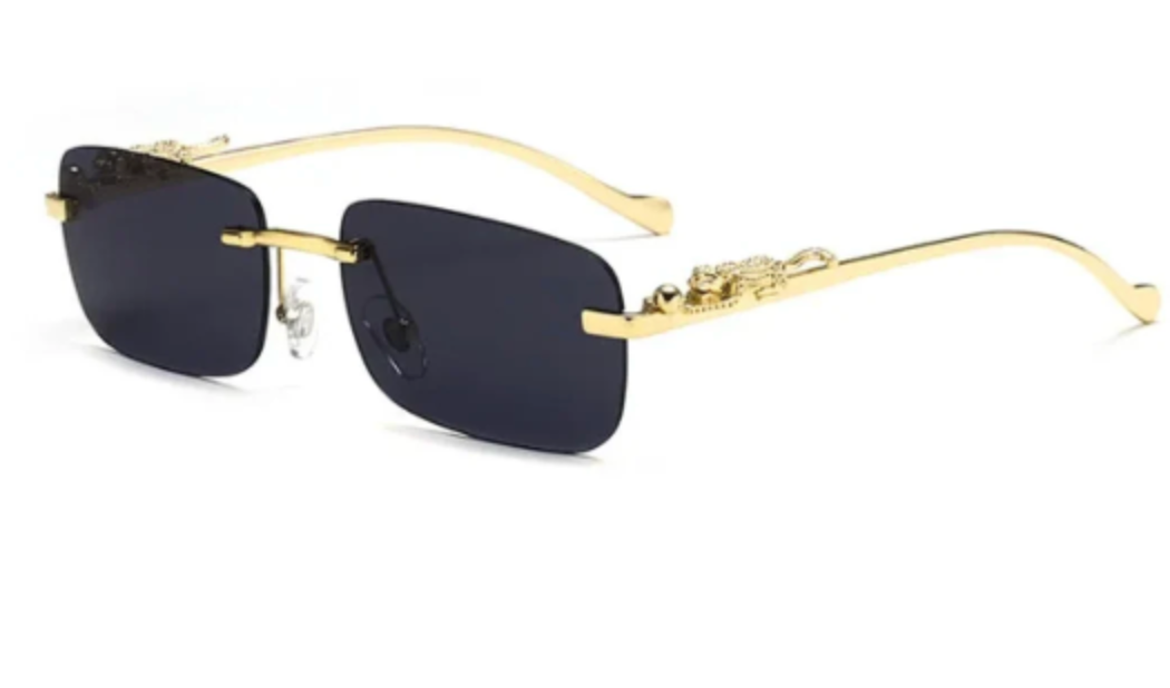 New Retro Rimless JAGUAR Sunglasses For Men AND Women Punk Fashion Glasses Vintage Shades, Cool, Black Lenses, Gold Tone arms and jaguars
