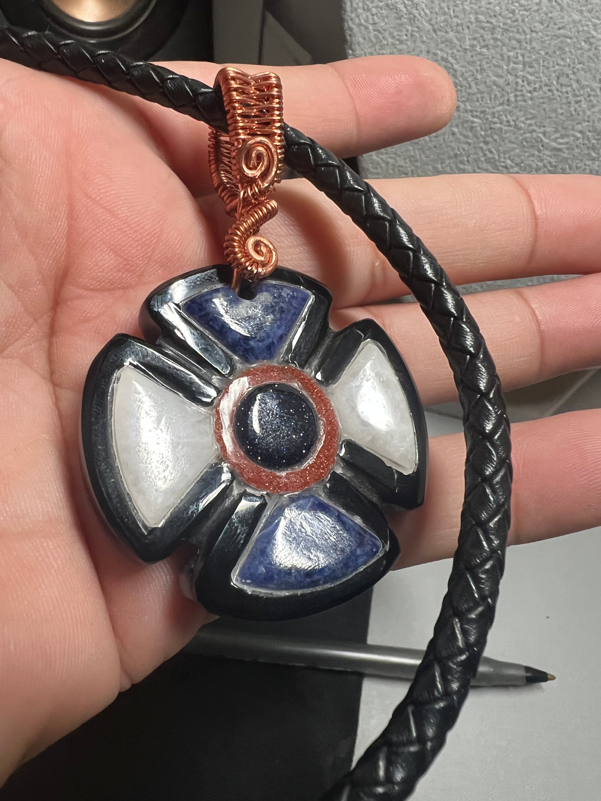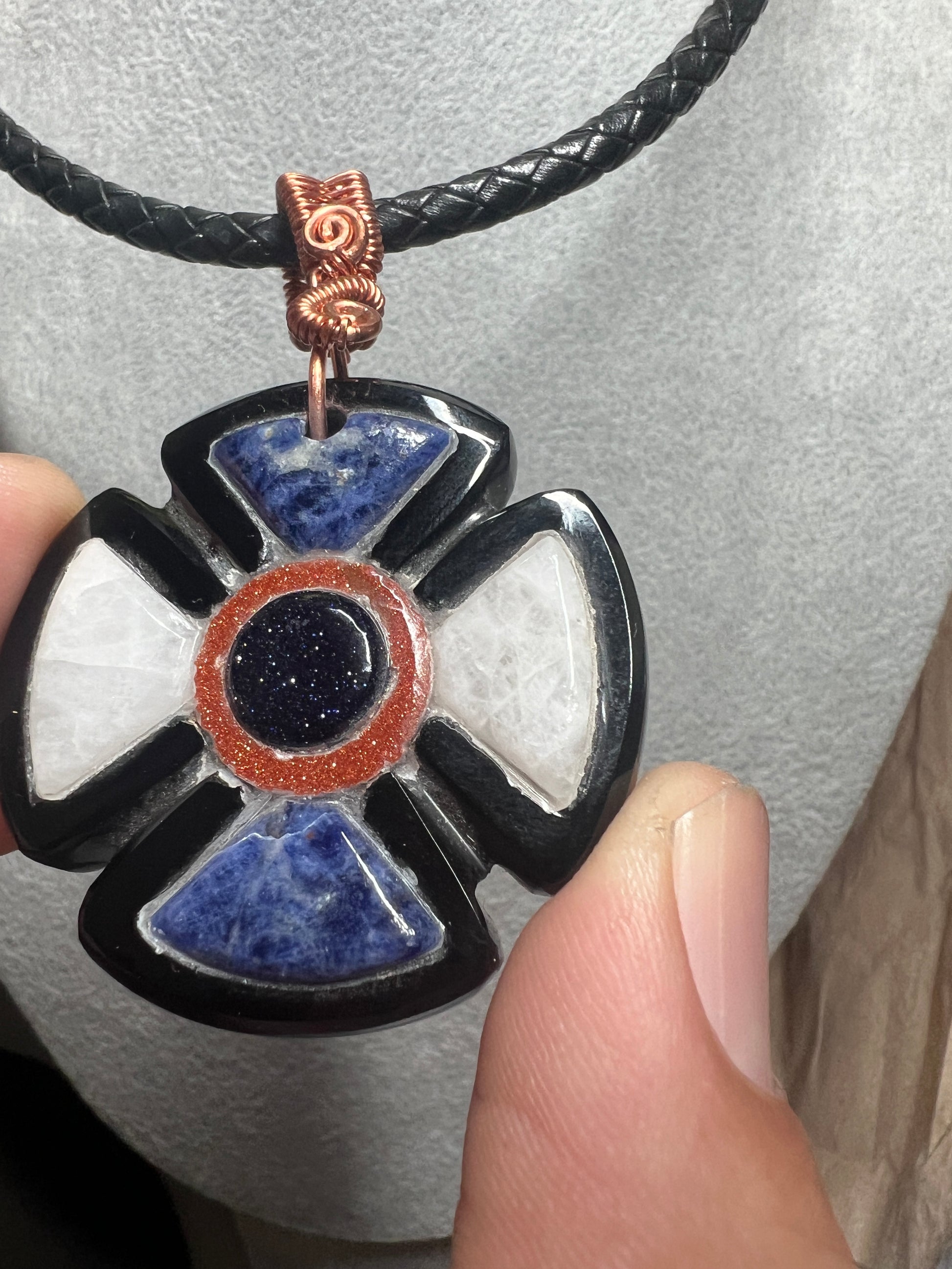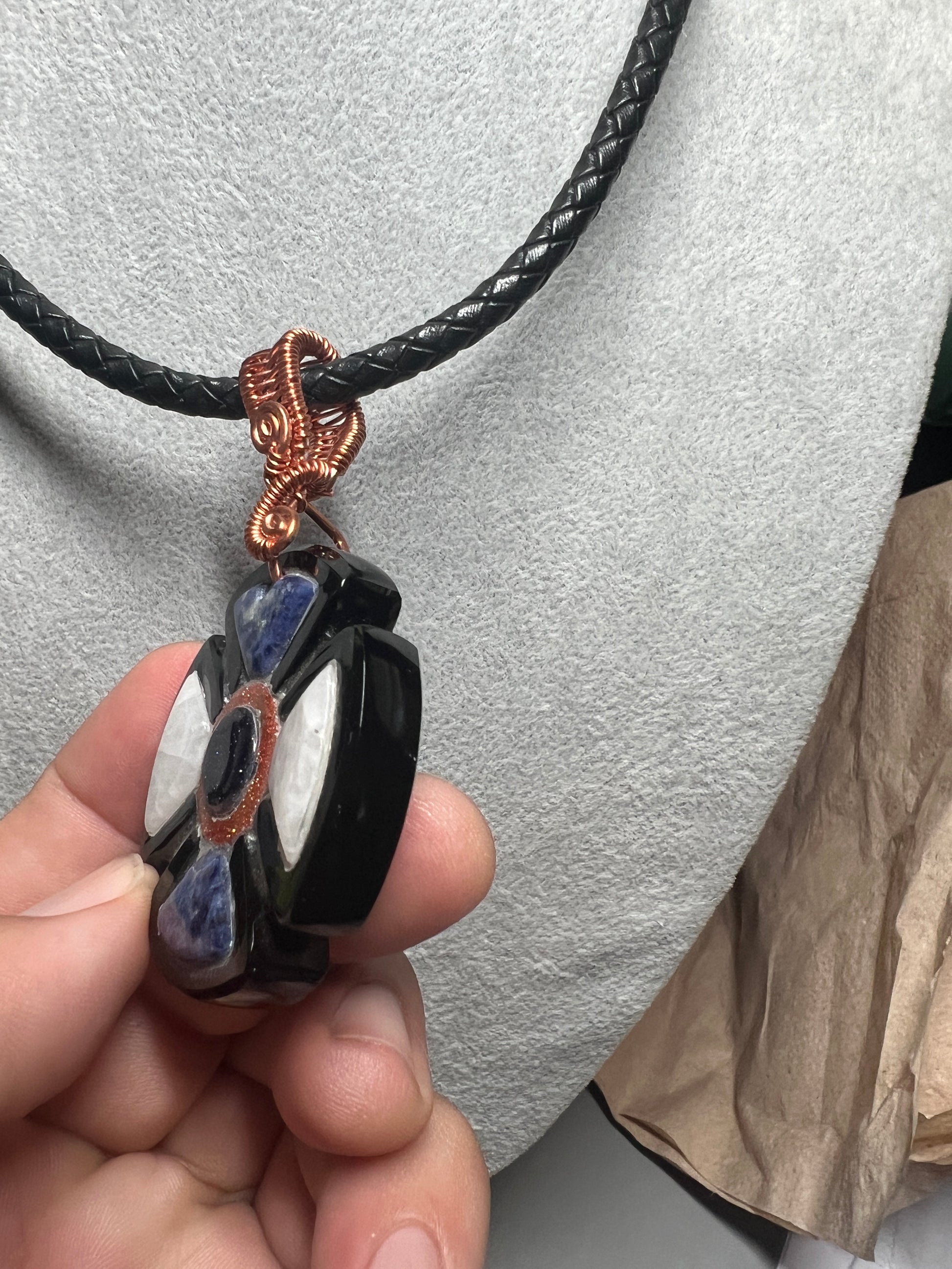 Obsidian Flower Stone Pendant, Choker, Aztec Mexica Maya, 1.75", leather rope necklace, 17" Mexico