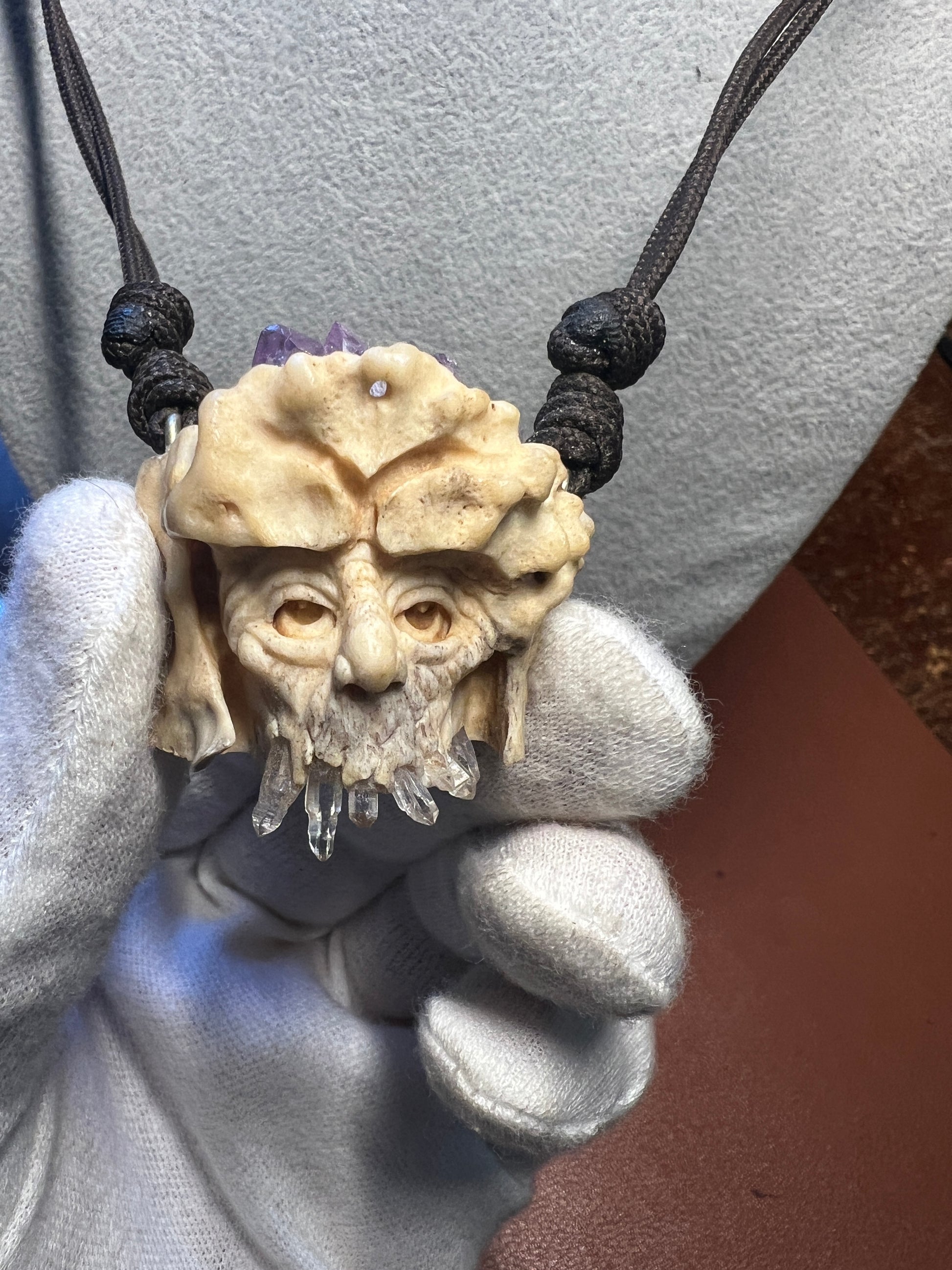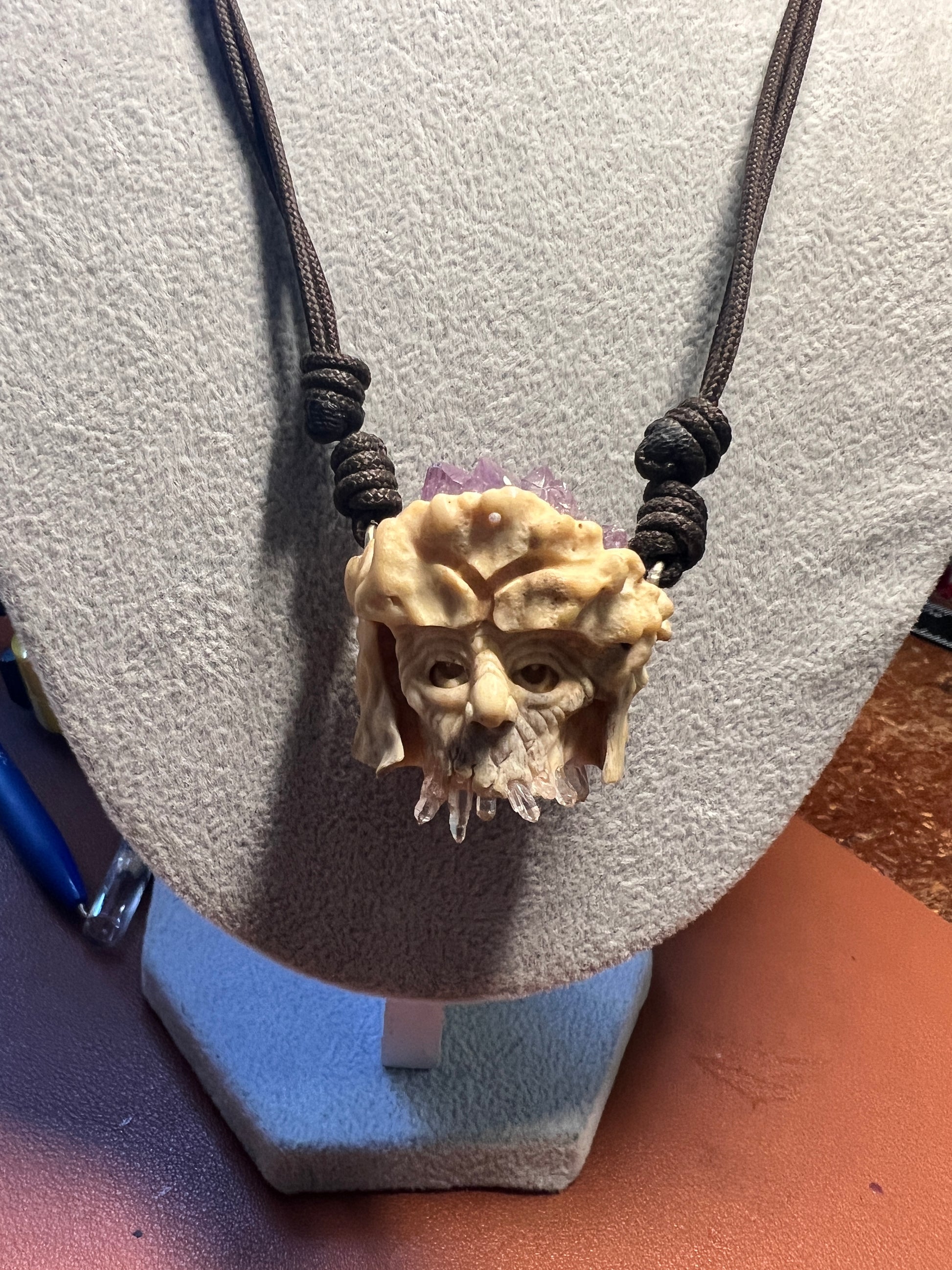 Old Wise Wizard Man Carved Pendant Necklace of Deer Antler and Crystals and Quartz (H)