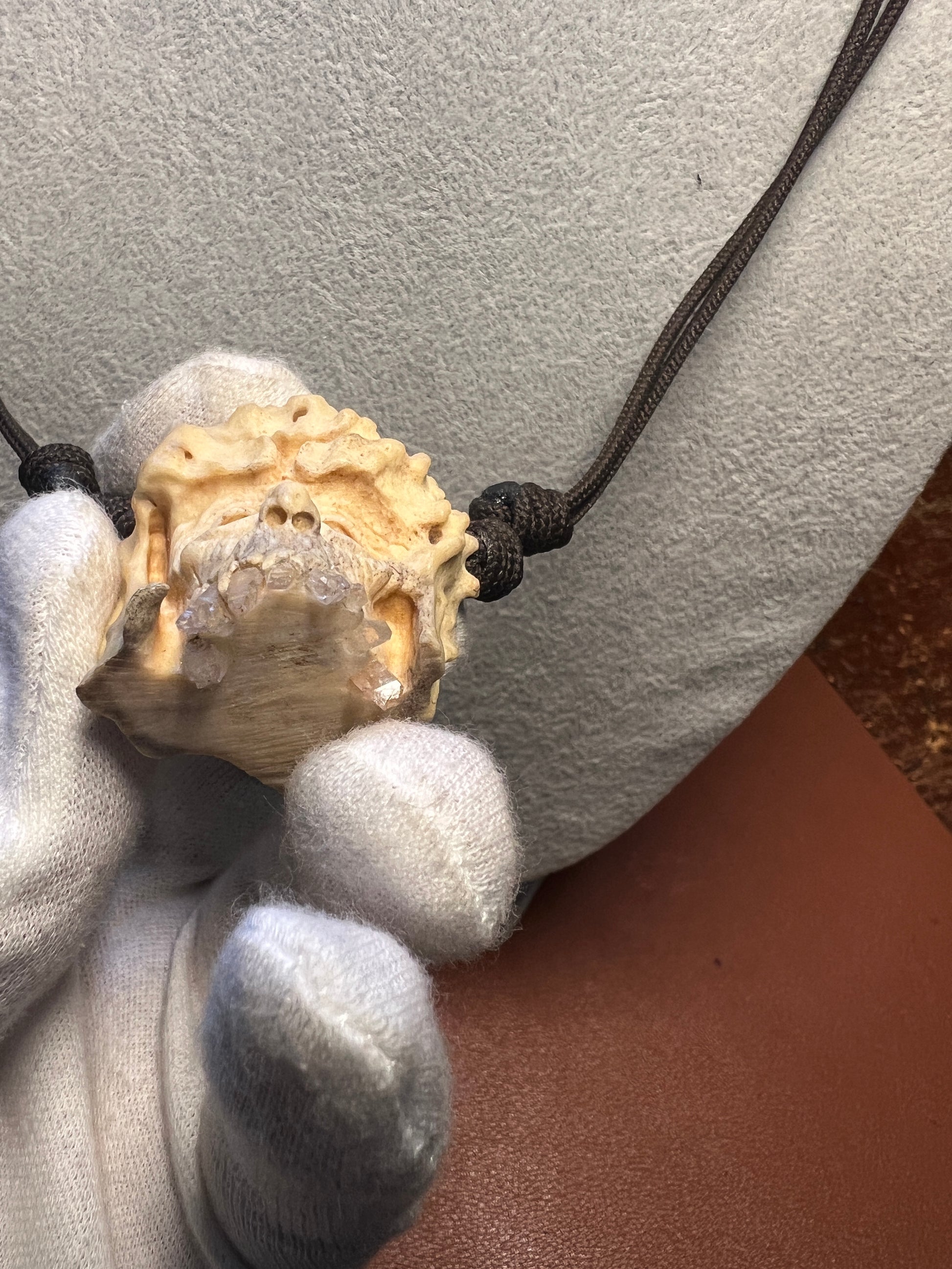 Discover the mystical allure of our Old Wise Wizard Man Carved Pendant Necklace, a piece that marries the natural elegance of deer antler with the captivating glow of crystals and quartz. Each pendant is a unique sculpture, meticulously crafted to capture the essence of wisdom and the wonders of nature. Adorn your ensemble with this extraordinary necklace, a statement piece that transcends the ordinary. The antler's rich, organic beauty is complemented by the shimmering accents of the crystals, creating a pendant that is both mesmerizing and timeless. This accessory is not just a fashion statement, but a tribute to the artisan's skill and the natural world's splendor.
