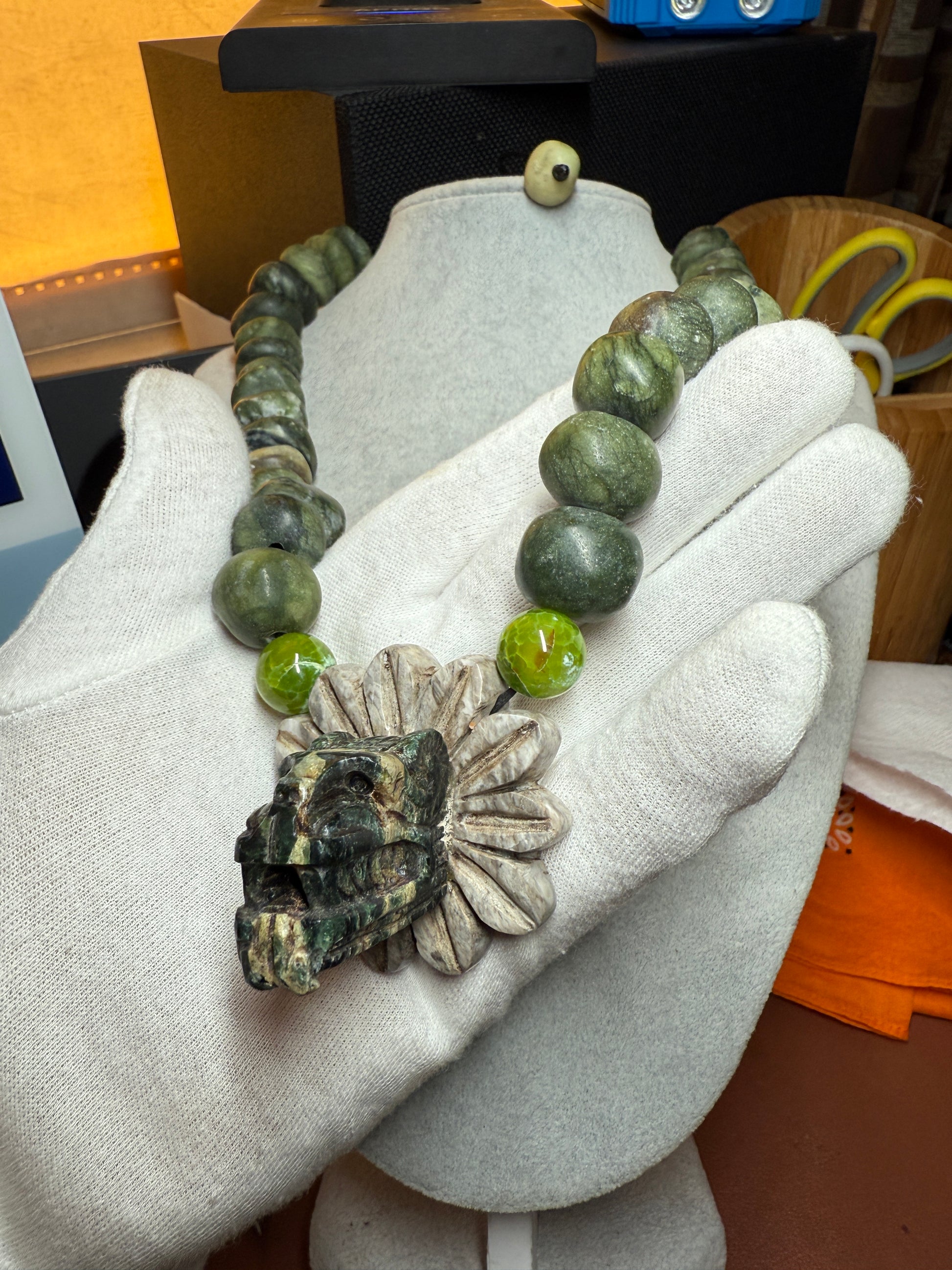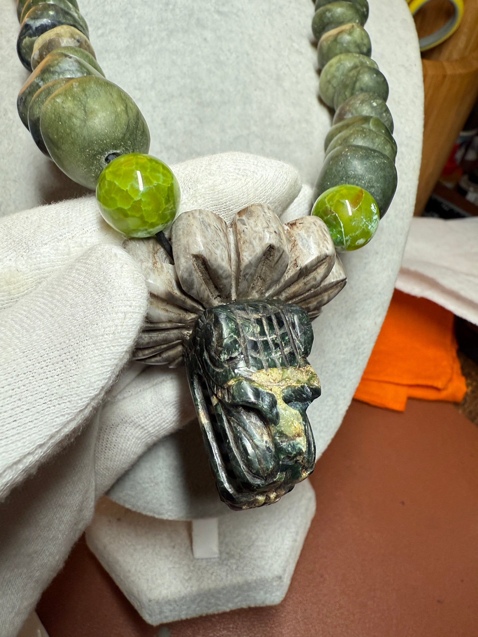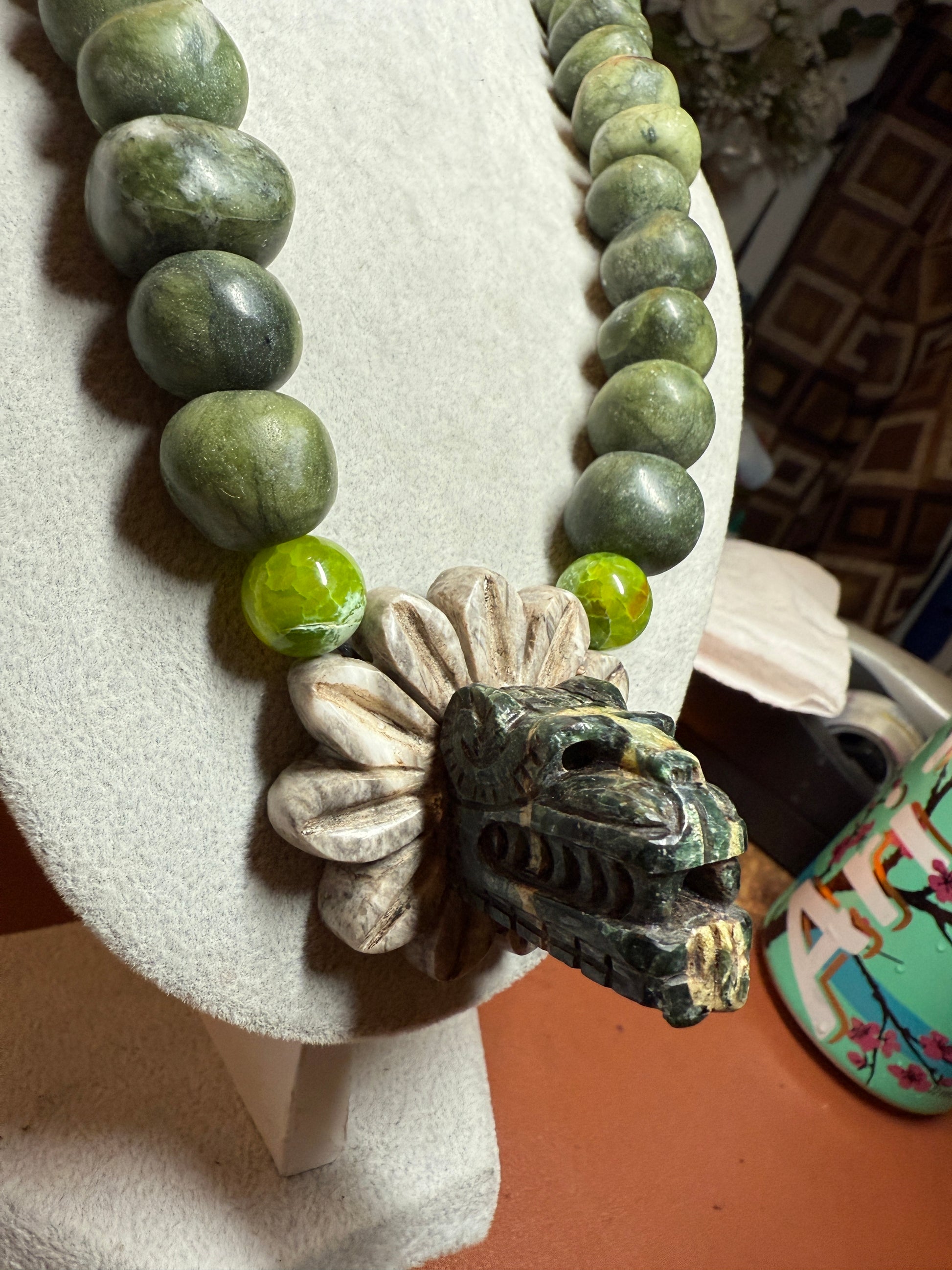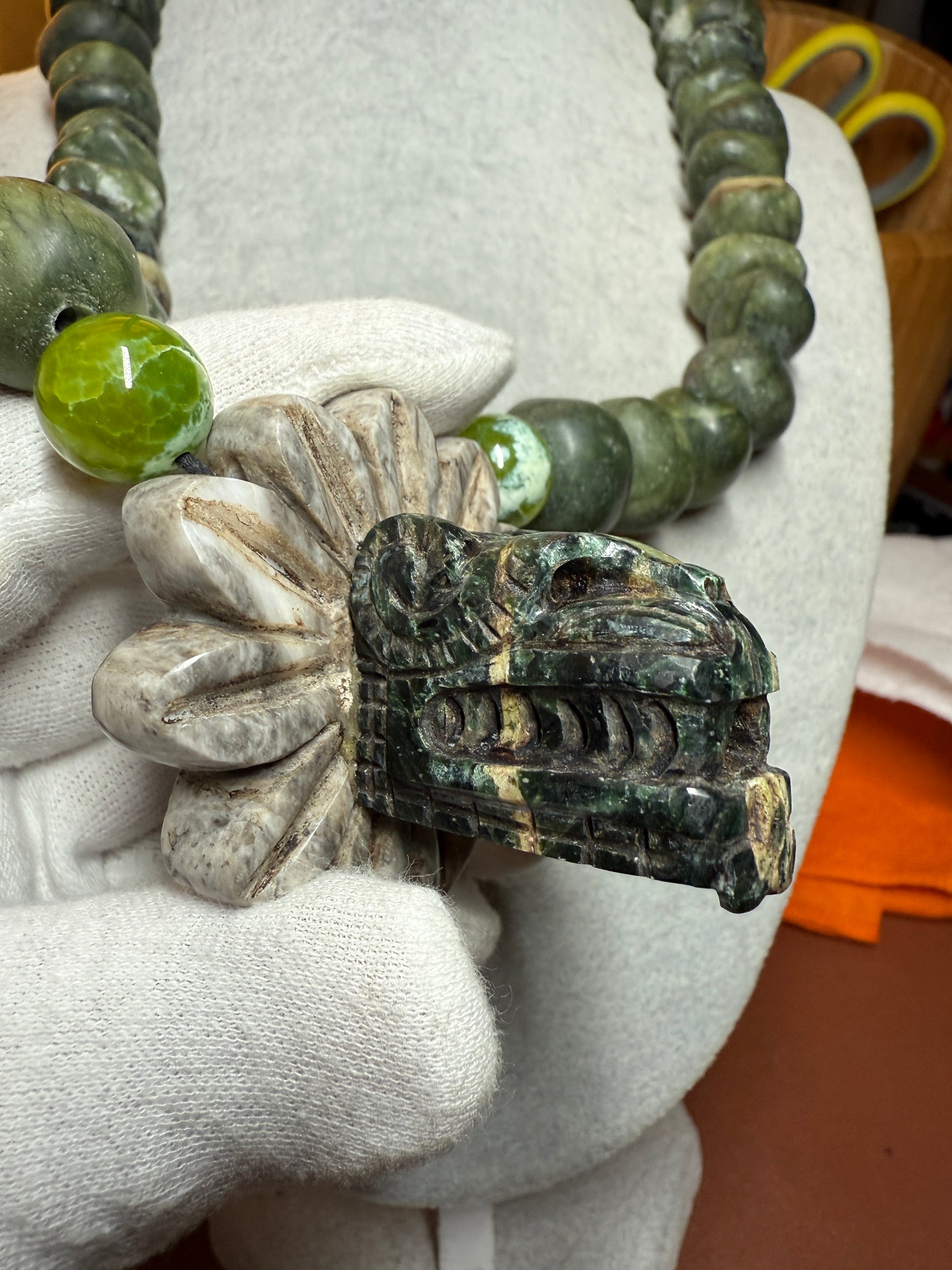 Crafted with meticulous attention to detail, this thick and heavy beaded necklace embodies the mythic Quetzalcoatl, the feathered serpent deity revered in Mexica and Azteca culture. The piece features a striking dragon-shaped main stone, precision-carved from resilient serpentine jade, capturing the essence of the plumed serpent's legend. Accented by bead stones of granite and Guatemalan marble, the necklace offers a unique blend of natural elegance and historical significance. Also known as Kukulkan, Mayan plumed serpent. Adjustable.