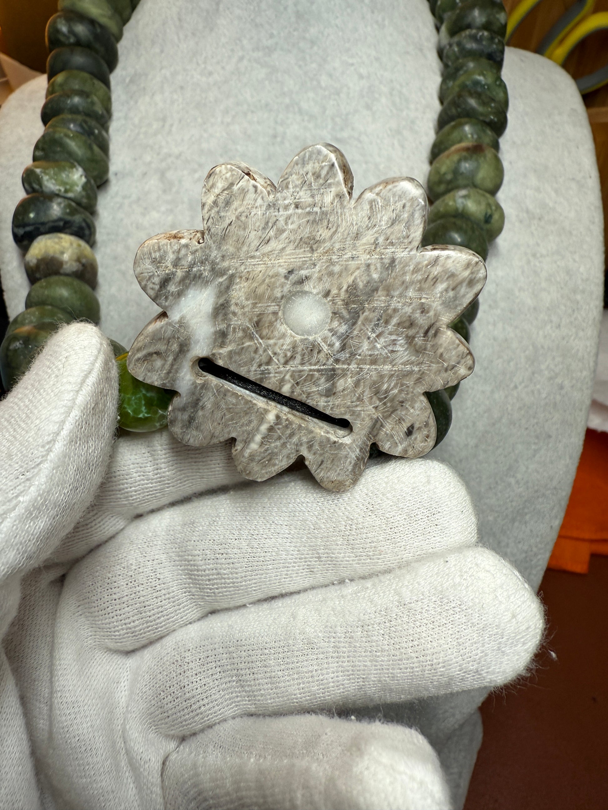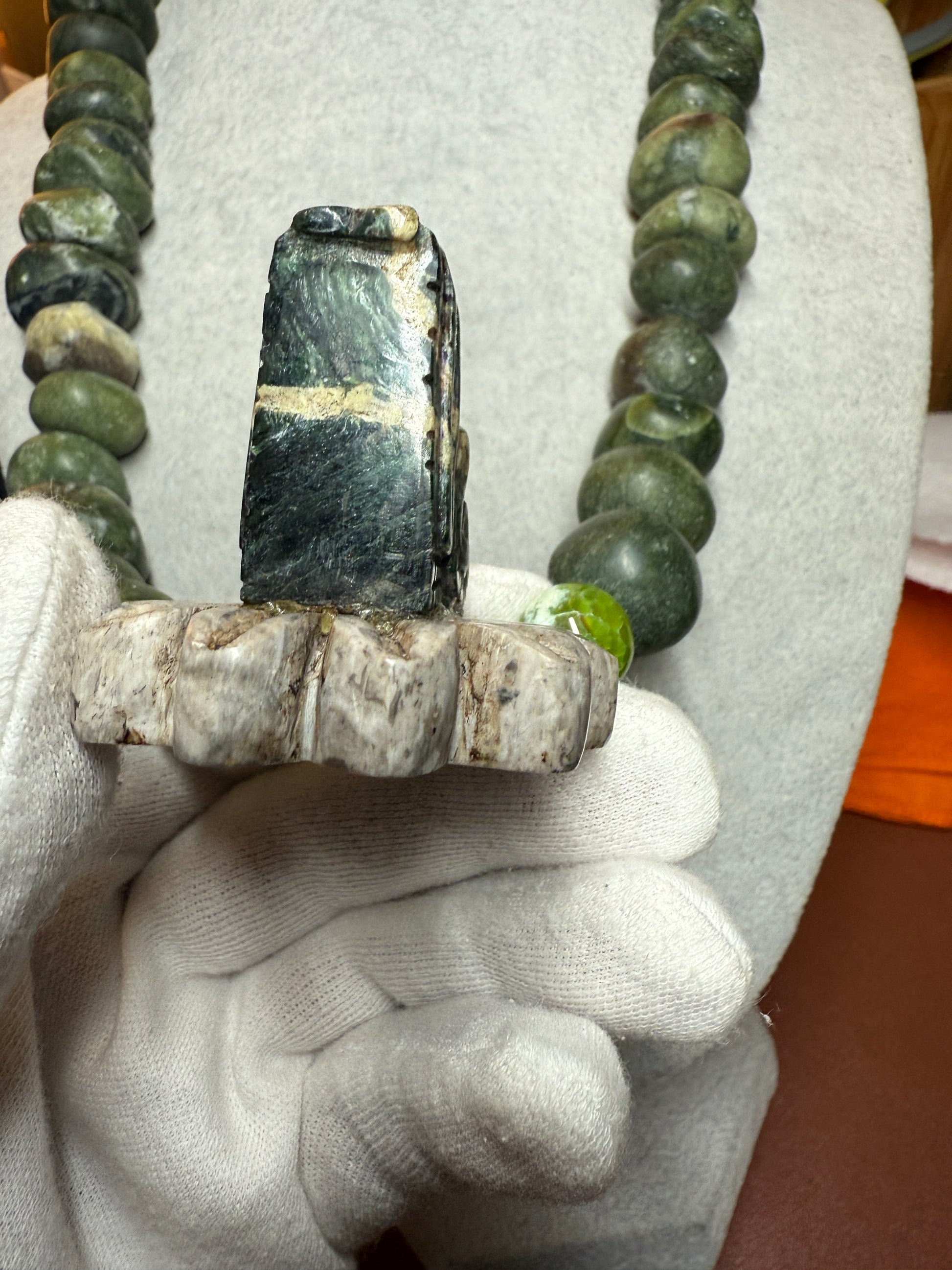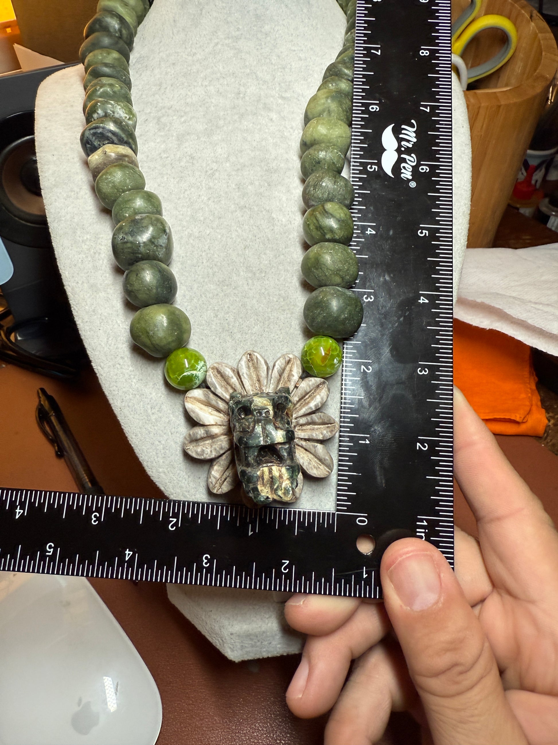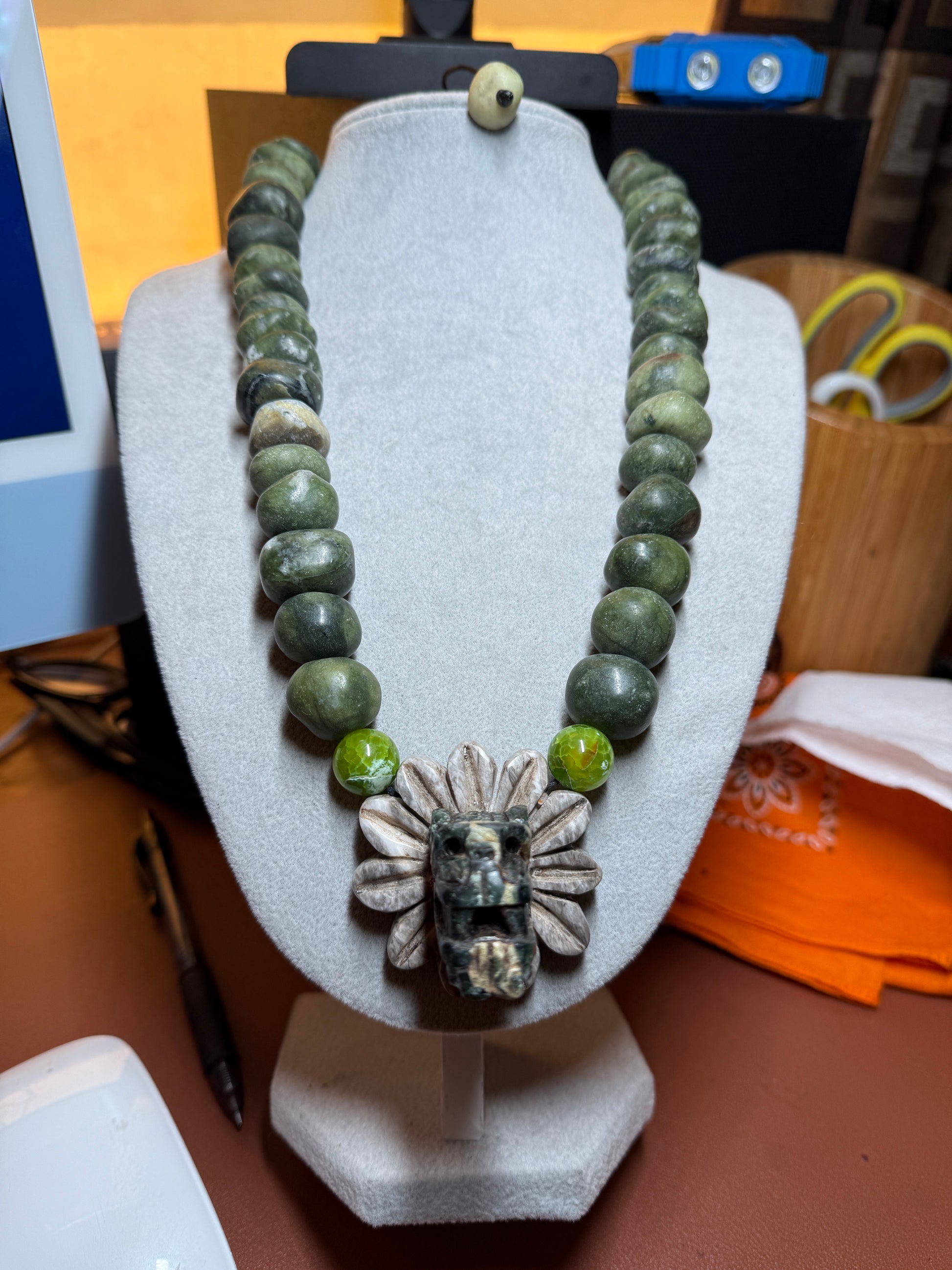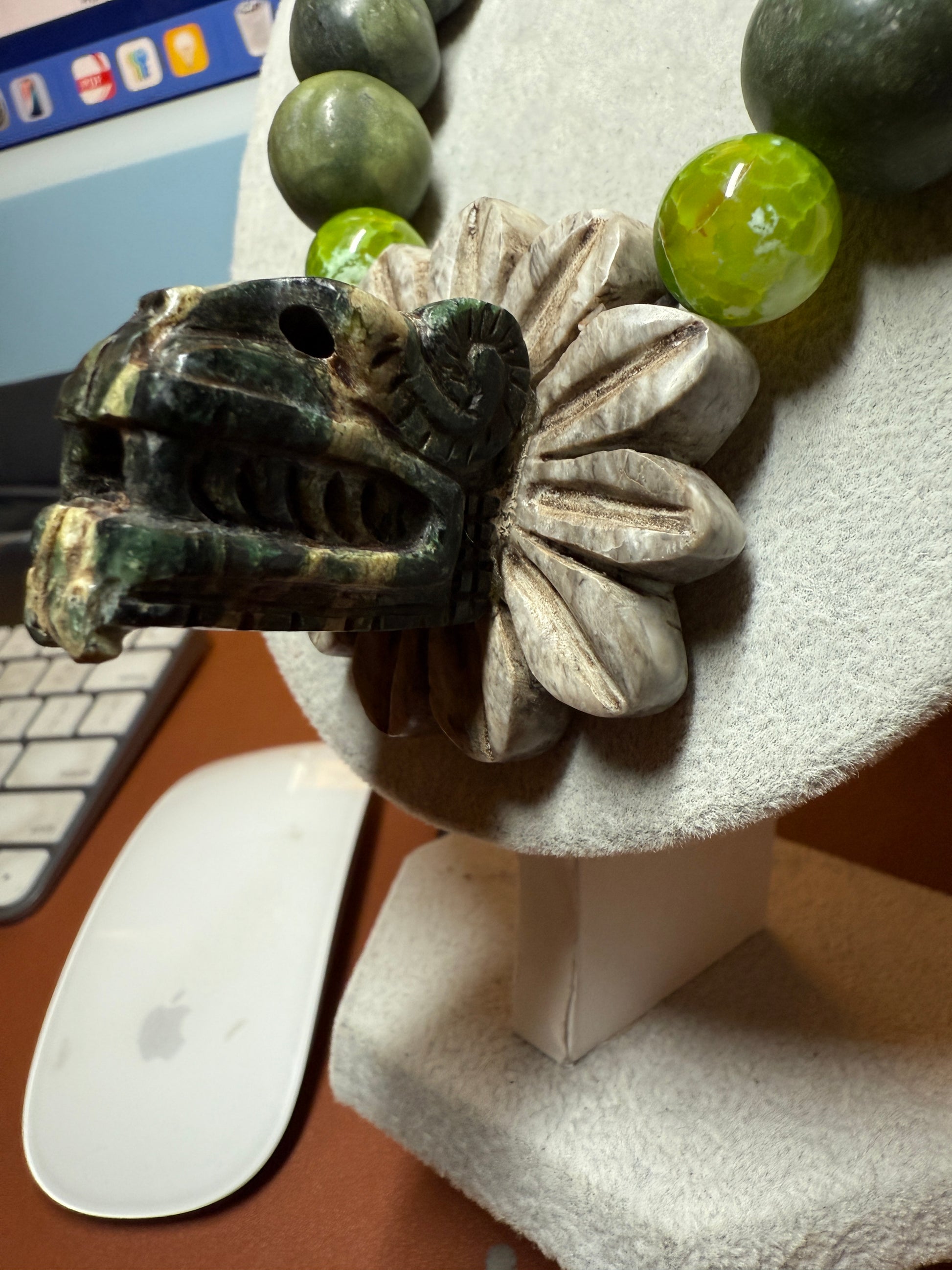Crafted with meticulous attention to detail, this thick and heavy beaded necklace embodies the mythic Quetzalcoatl, the feathered serpent deity revered in Mexica and Azteca culture. The piece features a striking dragon-shaped main stone, precision-carved from resilient serpentine jade, capturing the essence of the plumed serpent's legend. Accented by bead stones of granite and Guatemalan marble, the necklace offers a unique blend of natural elegance and historical significance. Also known as Kukulkan, Mayan plumed serpent. Adjustable.