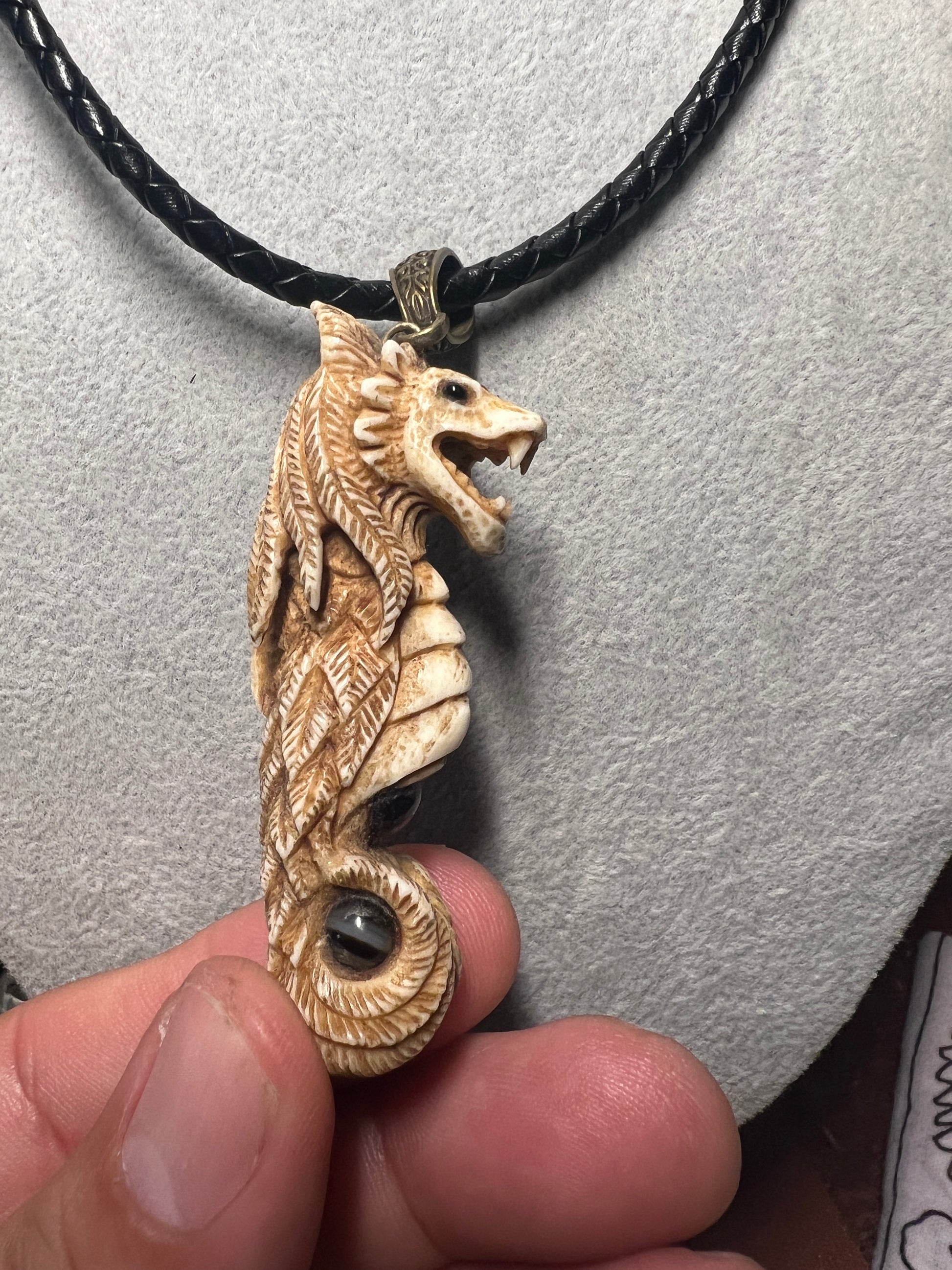 This stunning pendant features a beautifully crafted design of a Quetzalcoatl Kukulkan hybrid with a Sea Horse, a mythical dragon from Mexican folklore. The pendant is from Deer Antler. Its style is perfect for those who enjoy a gothic or fairytale and fantasy look. The pendant was crafted in Mexico and is a great addition to any collection. Its vintage look and feel make it a perfect accessory for anyone who loves unique and one-of-a-kind jewelry. Add this beautiful pendant to your collection today and enjoy the beauty and craftsmanship of Mexican artistry.