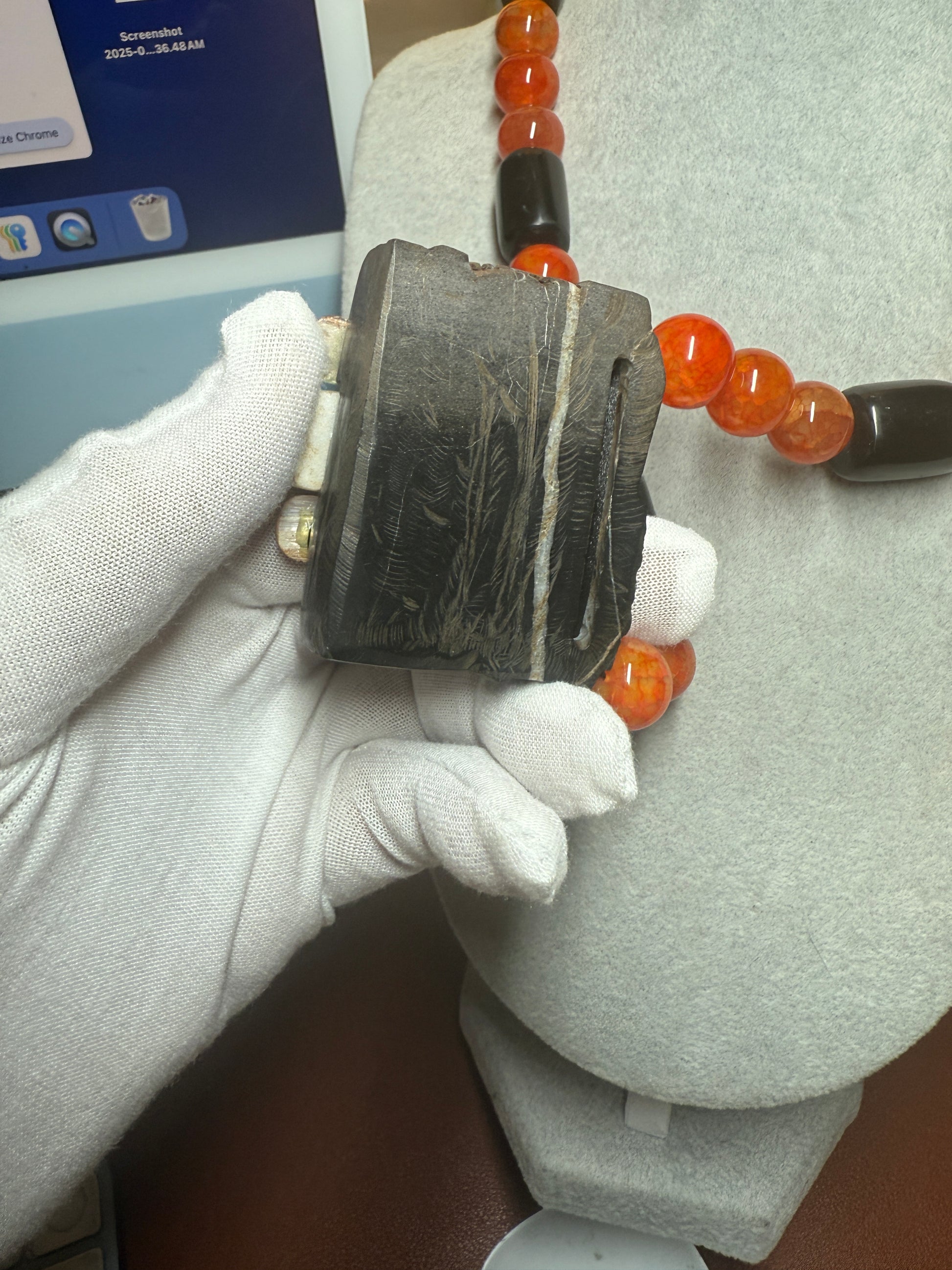 The pendant is made of black onyx with an inlay of carnelian abalone shell and white onyx. The tubes are made of obsidian in different shades and the spheres are carnelian.