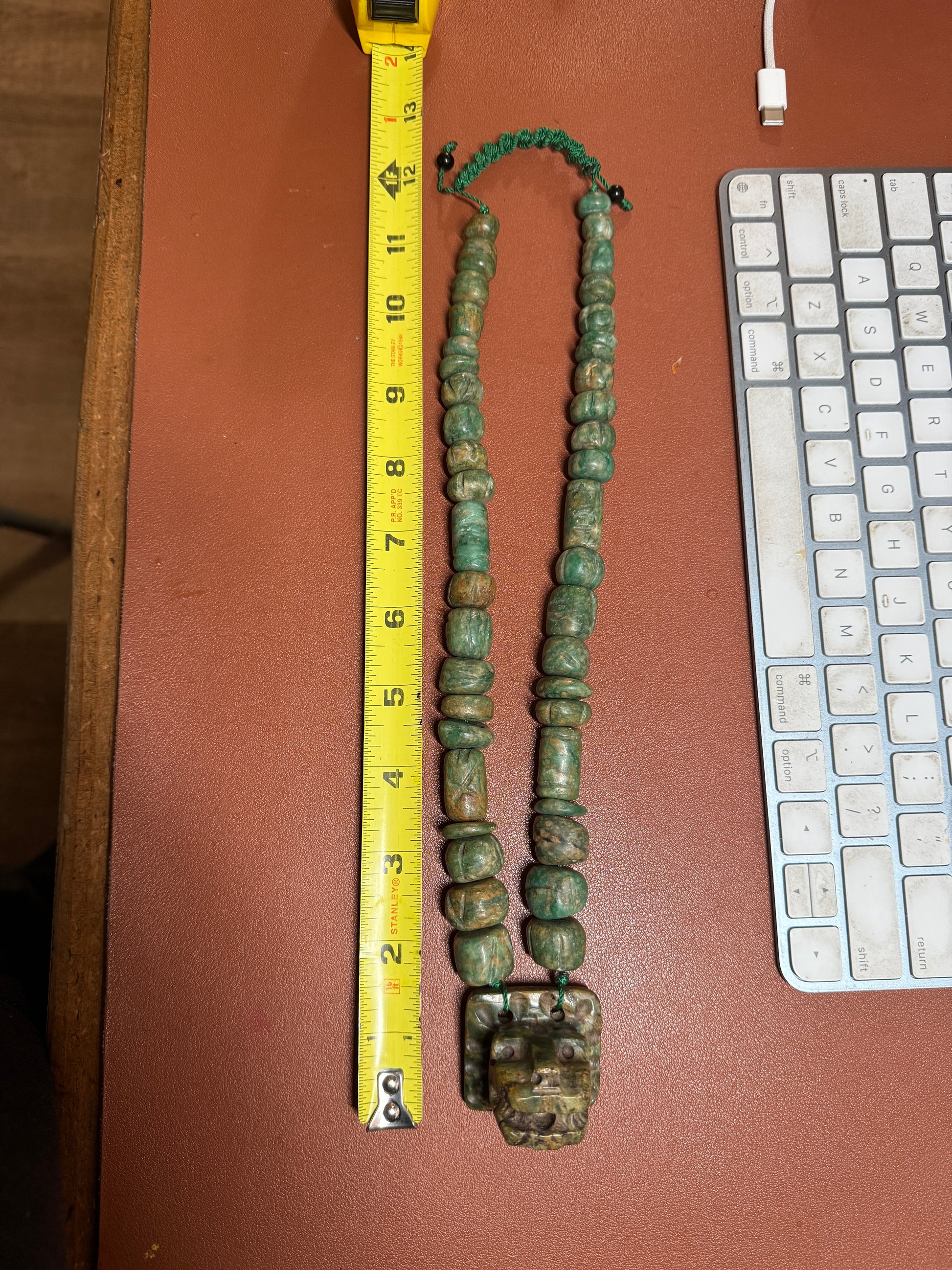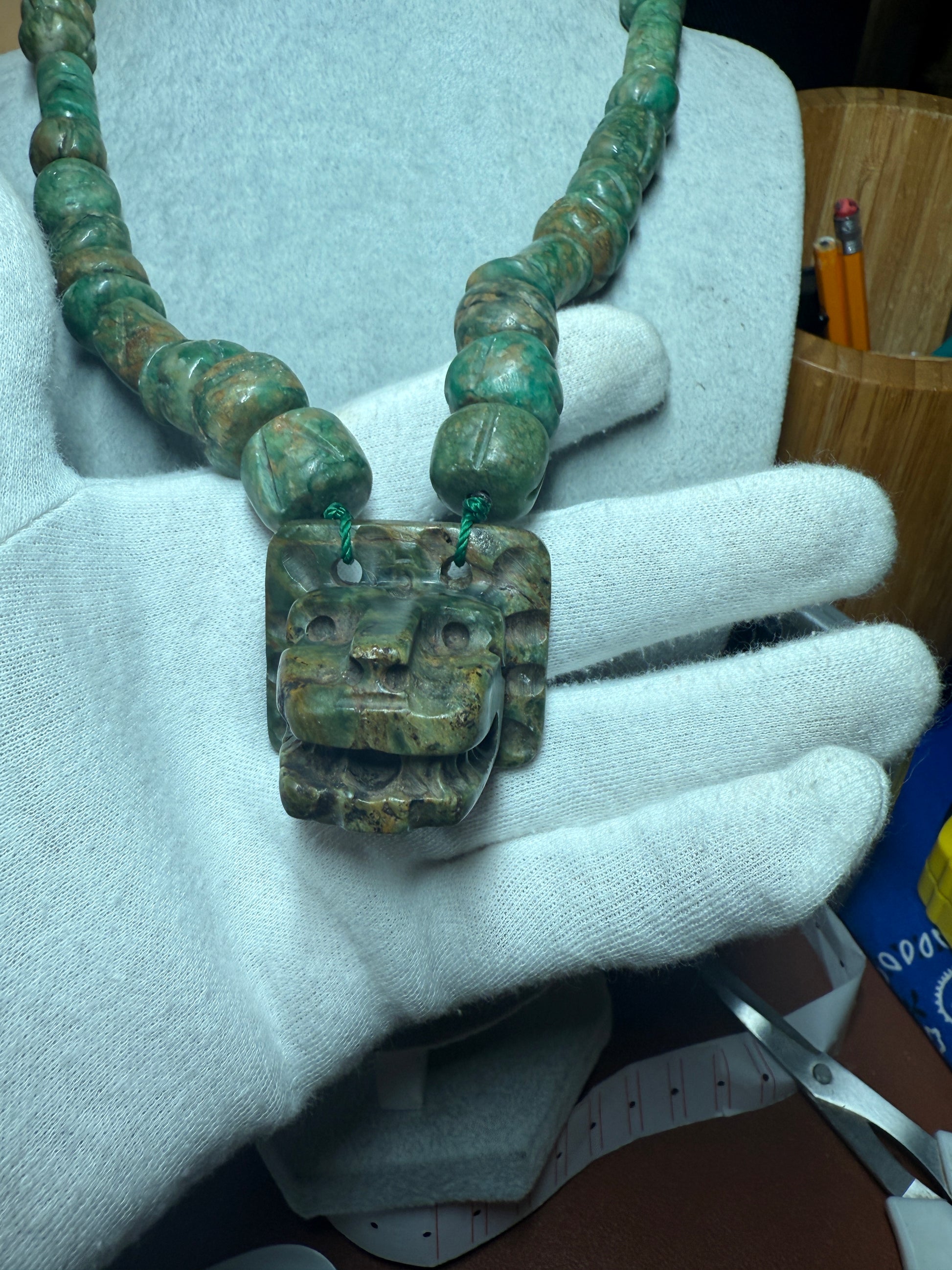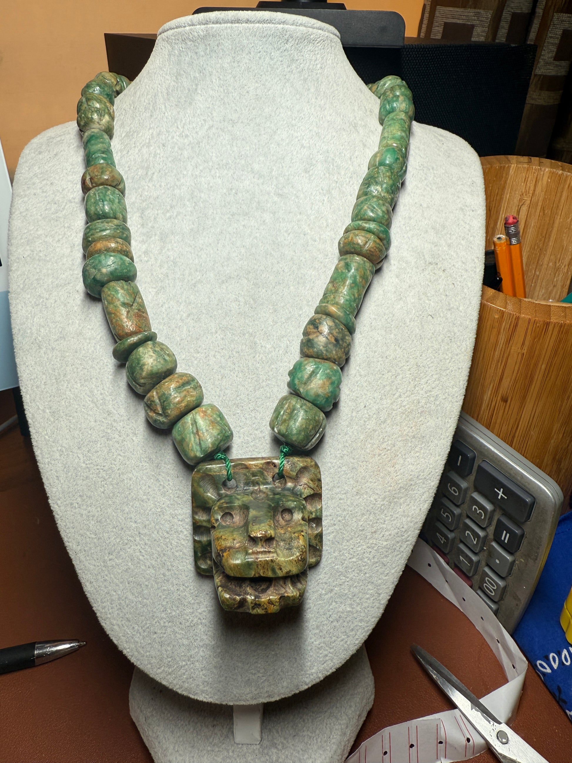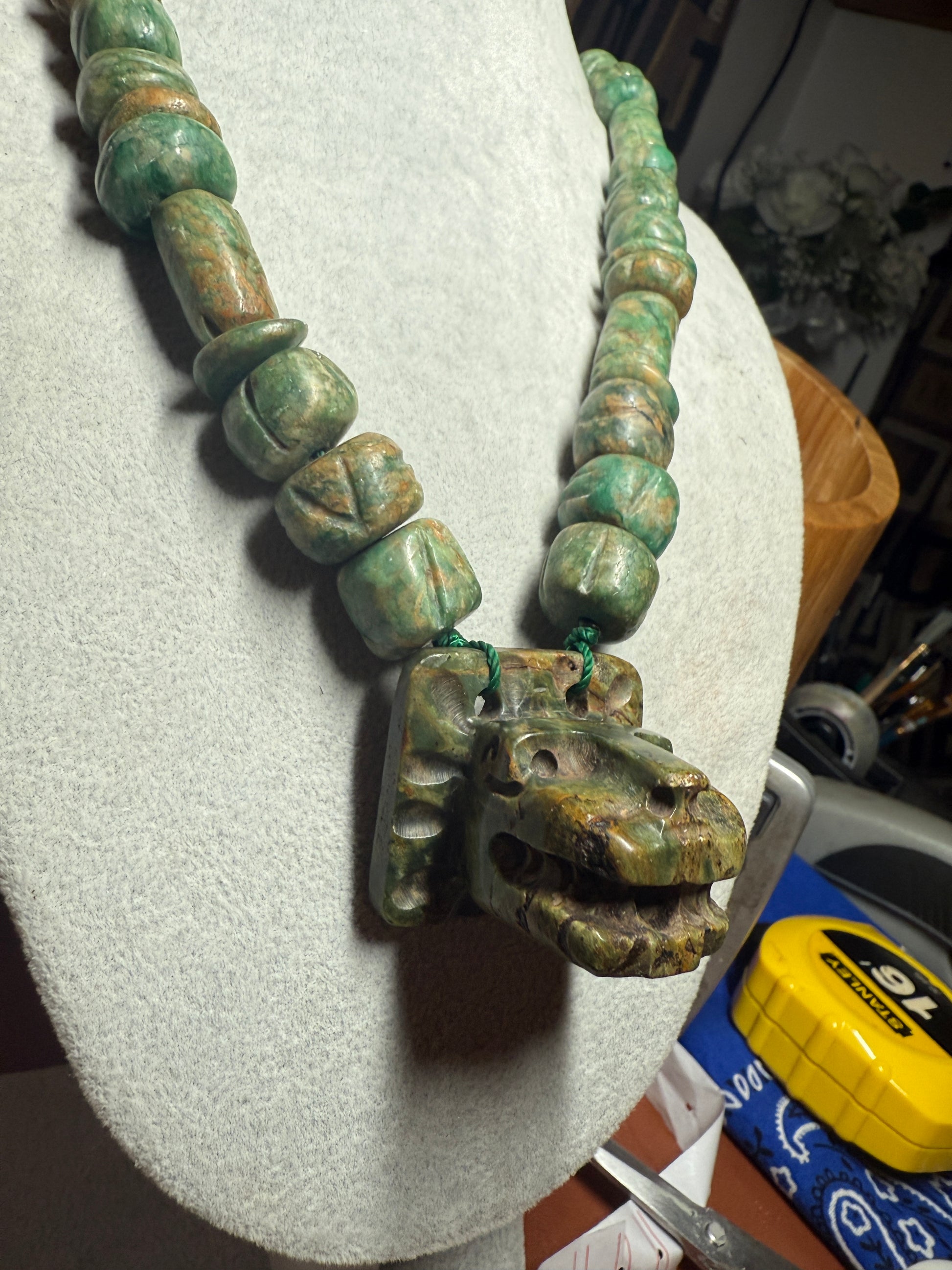 Serpentine Stone Quetzalcoatl Feathered Serpent Necklace, Kukulkan Mayan Plumed Serpent Necklace with parakeet jade Beads.