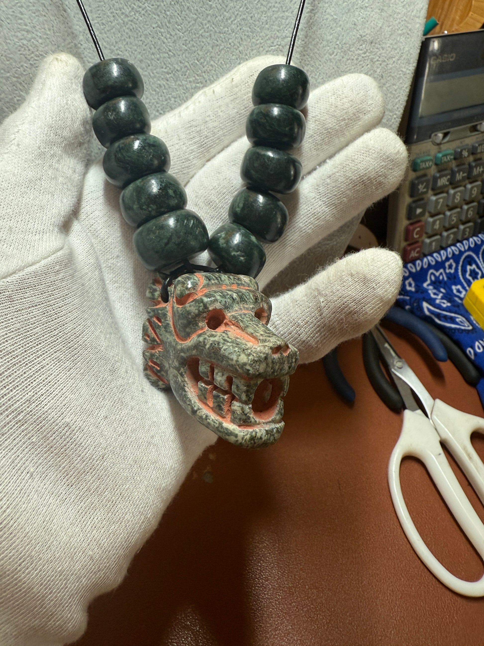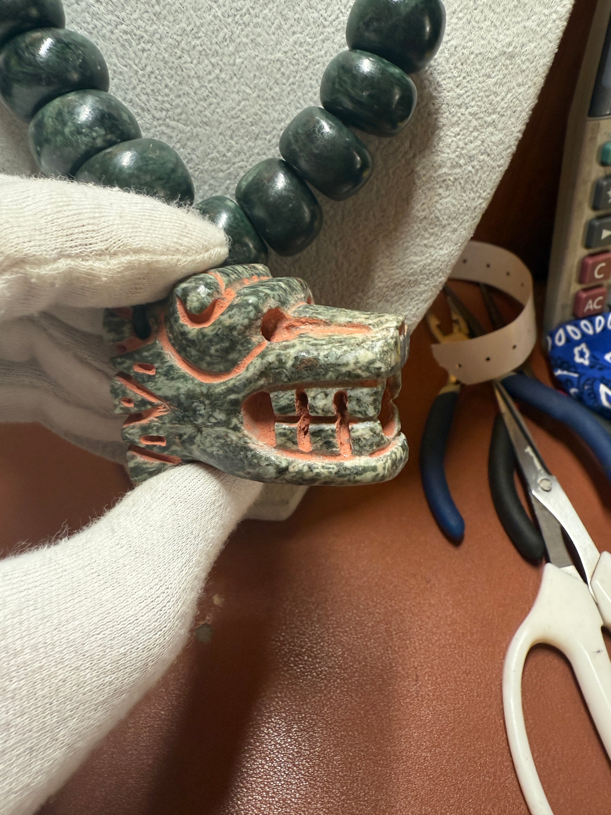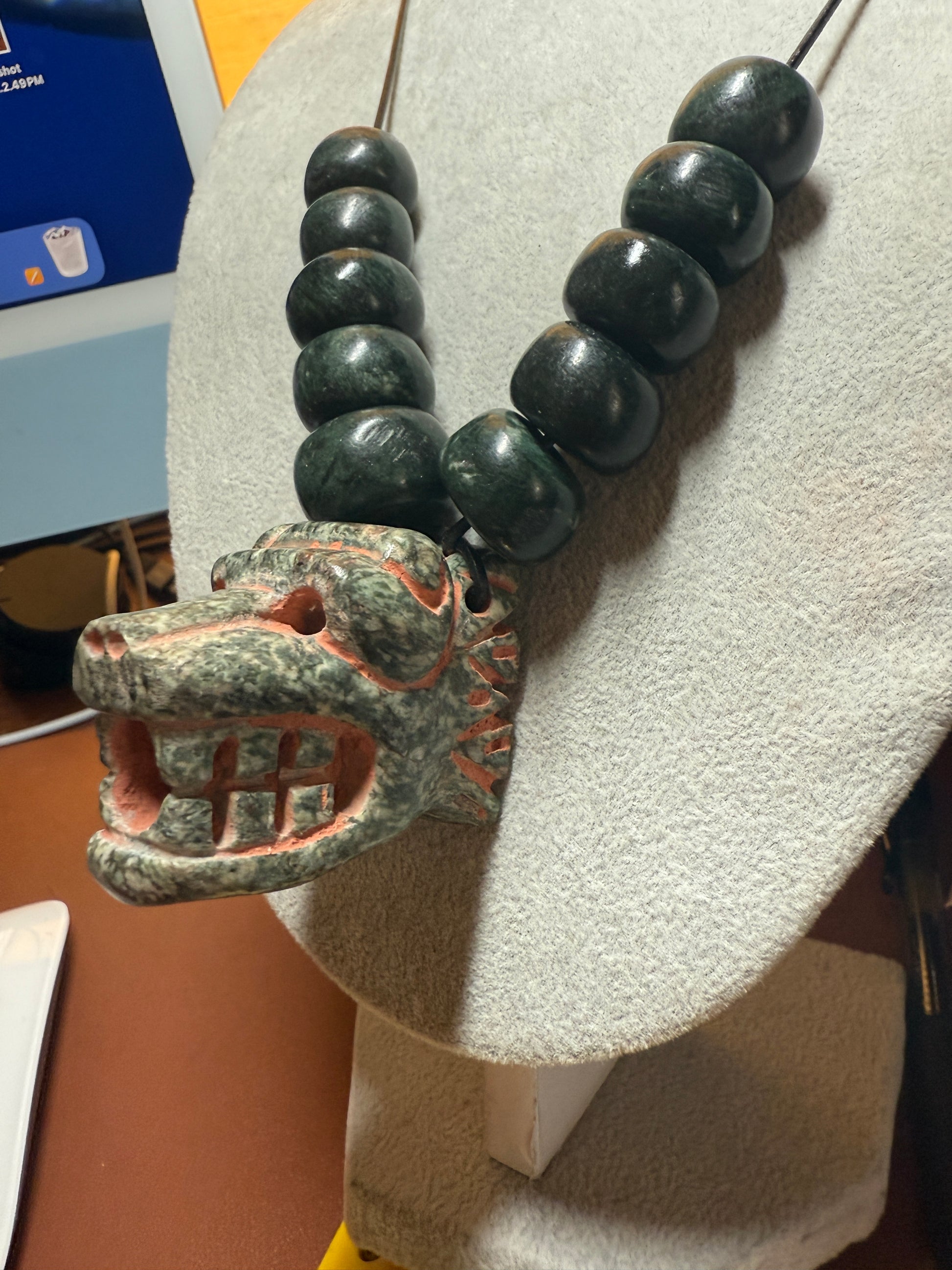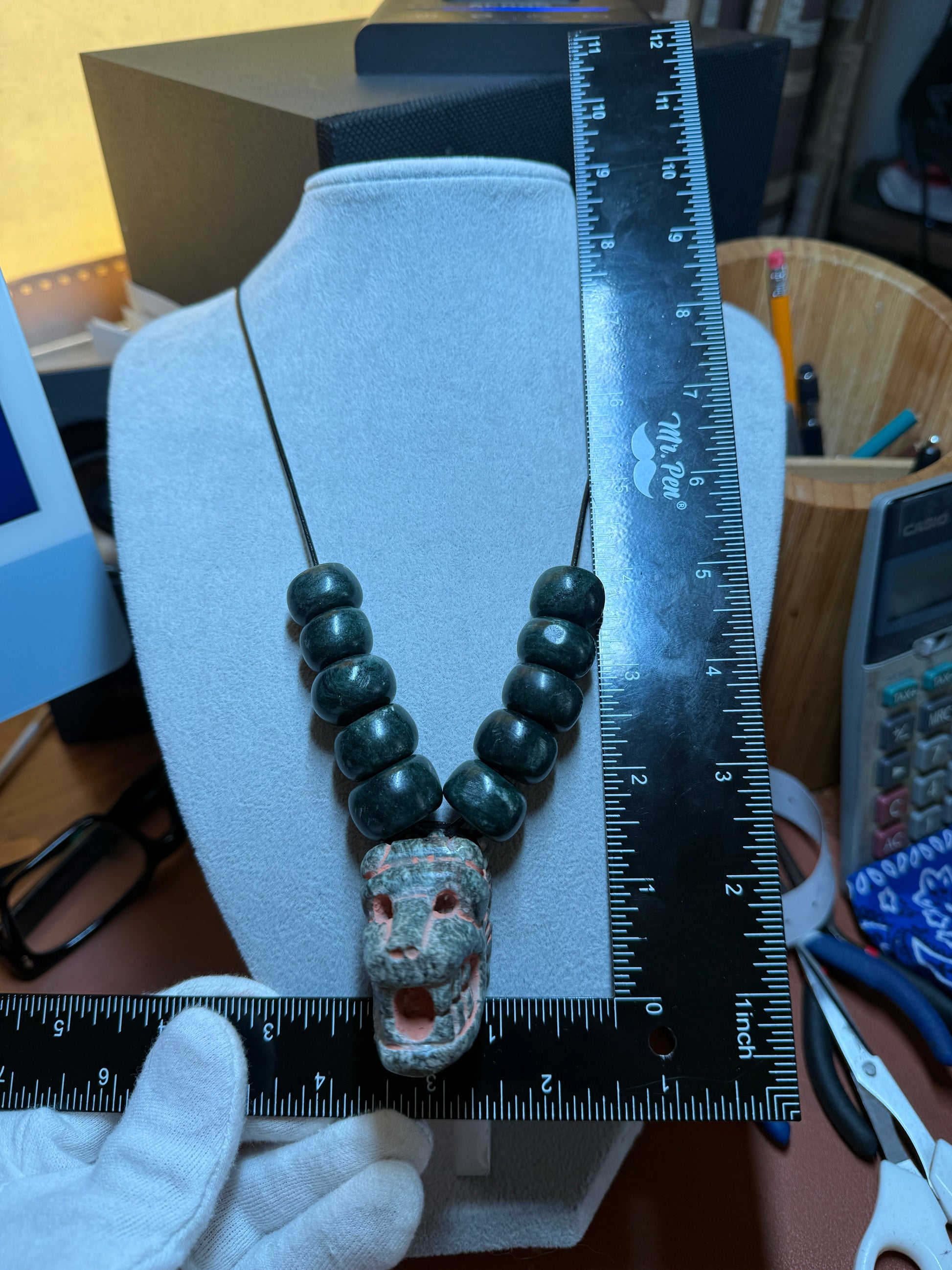 Serpentine Stone Quetzalcoatl Feathered Serpent Necklace, Kukulkan Mayan Plumed Serpent Necklace with Guatemalan Marbel Beads.