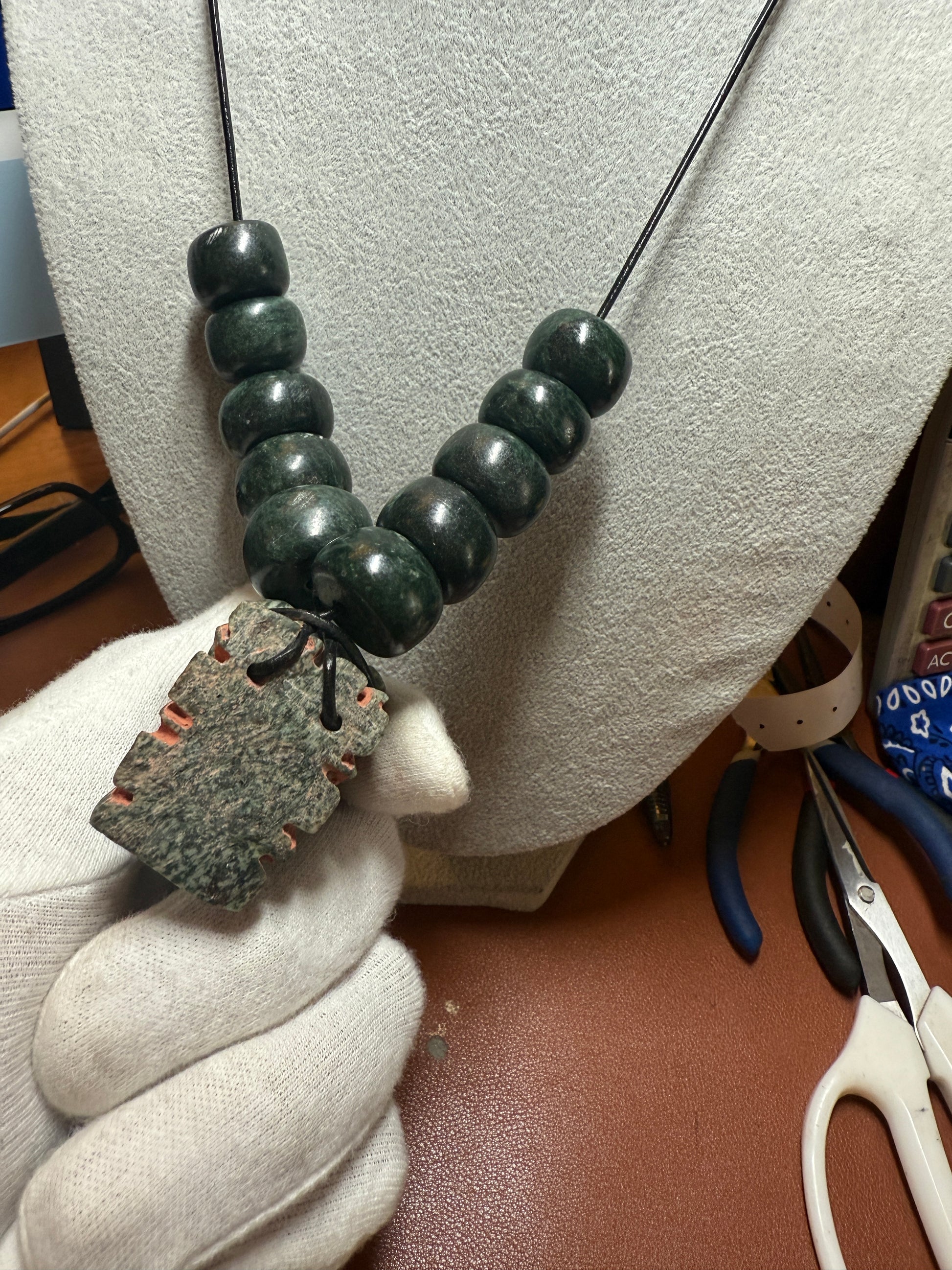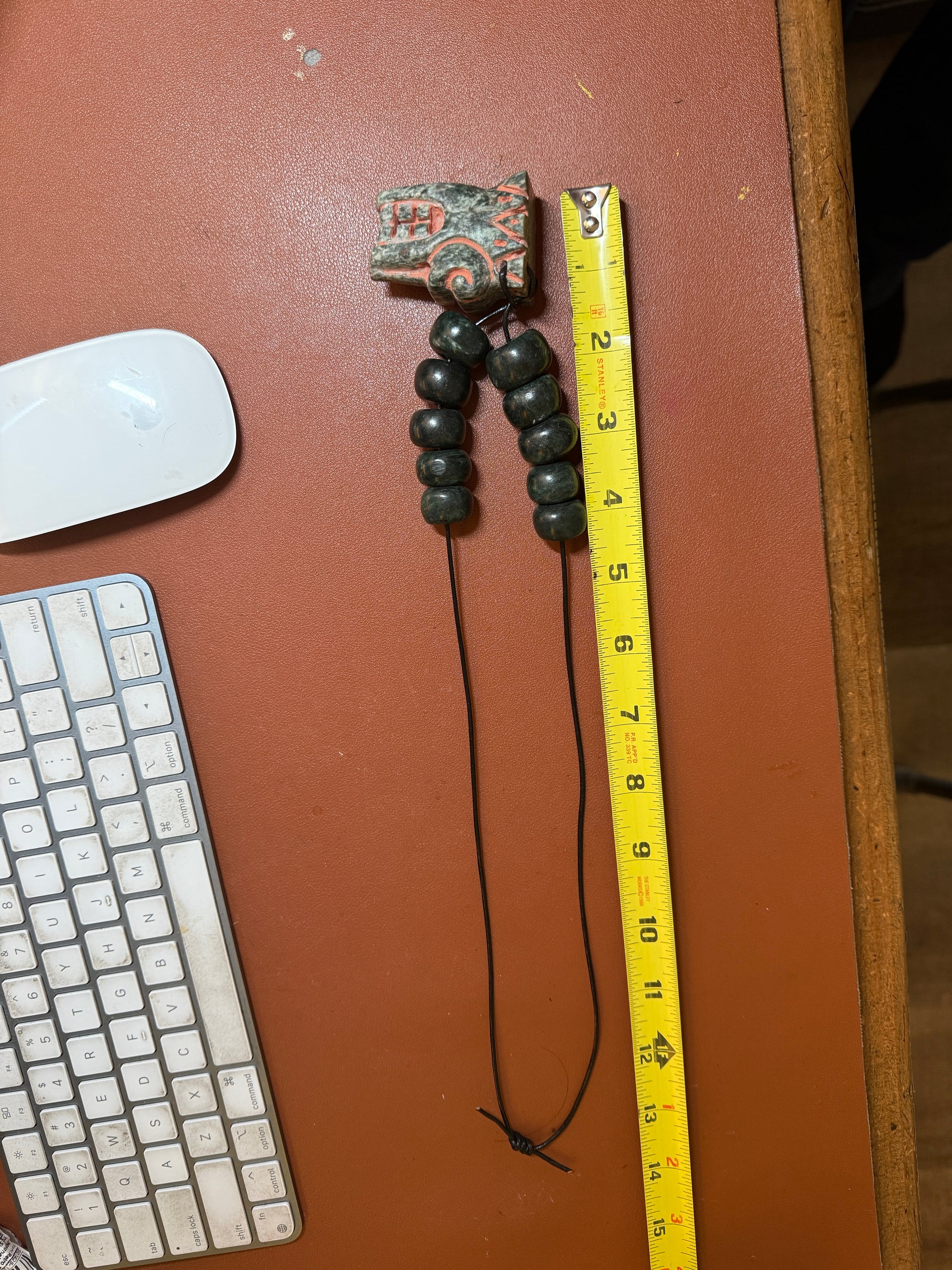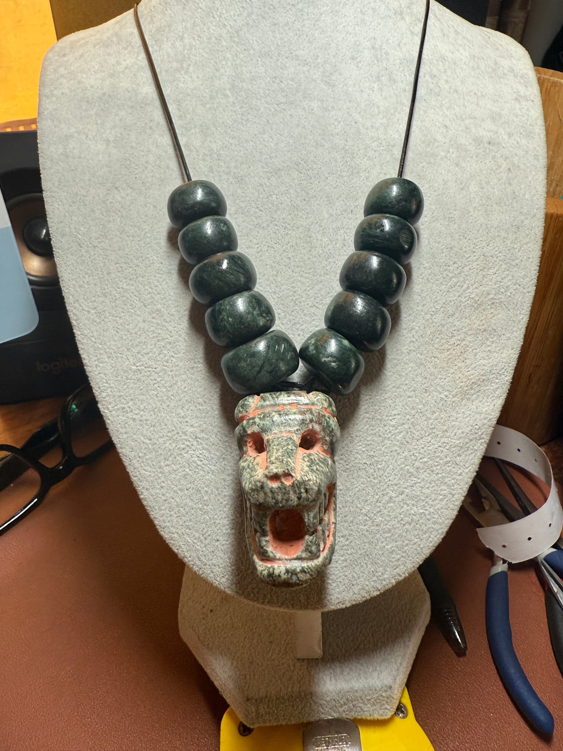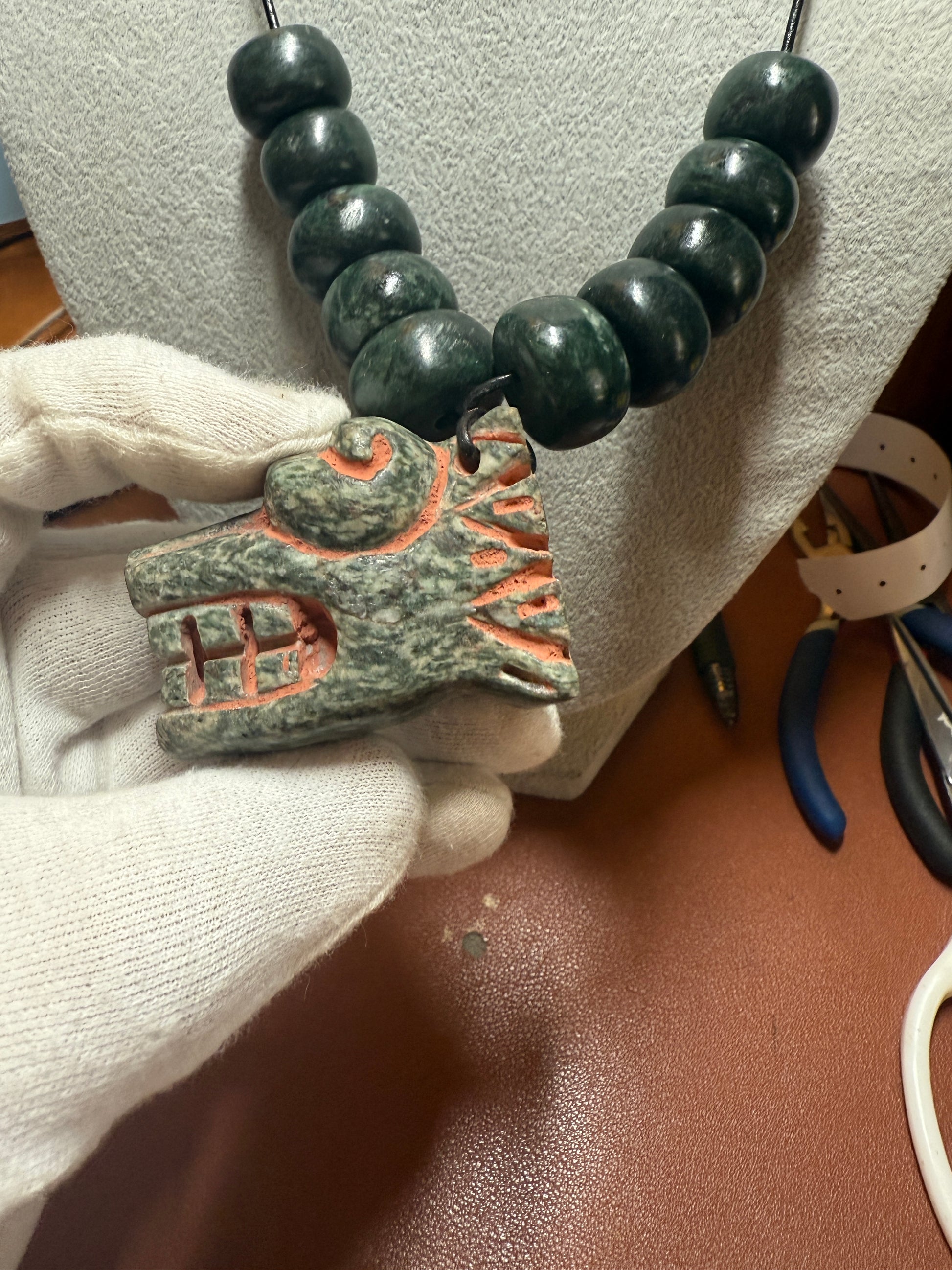 Serpentine Stone Quetzalcoatl Feathered Serpent Necklace, Kukulkan Mayan Plumed Serpent Necklace with Guatemalan Marbel Beads.