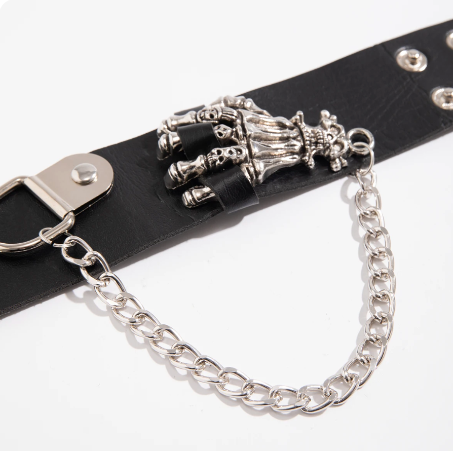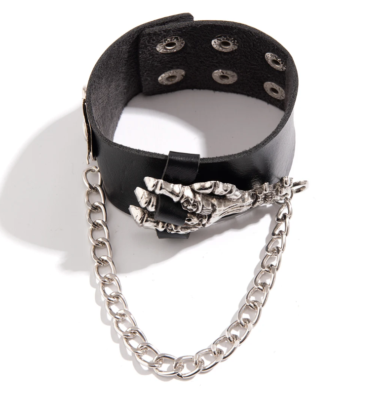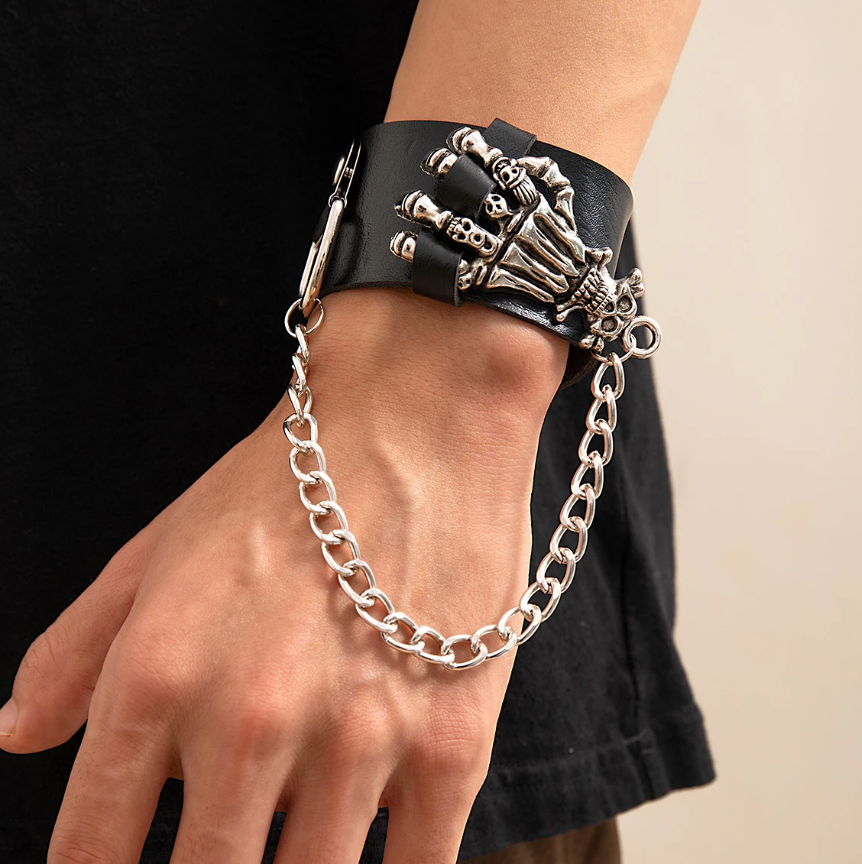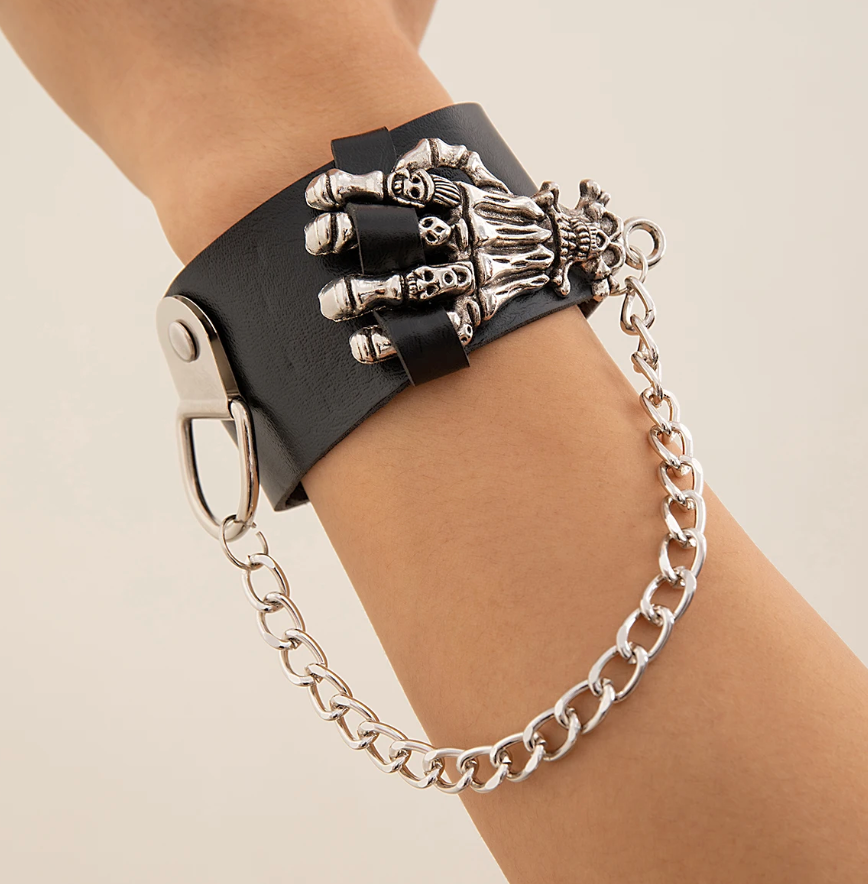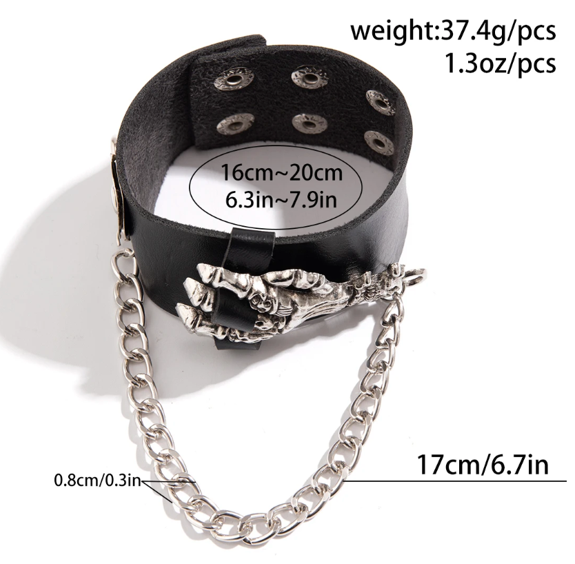 Men's Gothic Skull Hand PU Leather Bracelet Punk Silver Color Cuban Long Chain Tassel Bracelet Hip Hop Jewelry Gifts (#19)