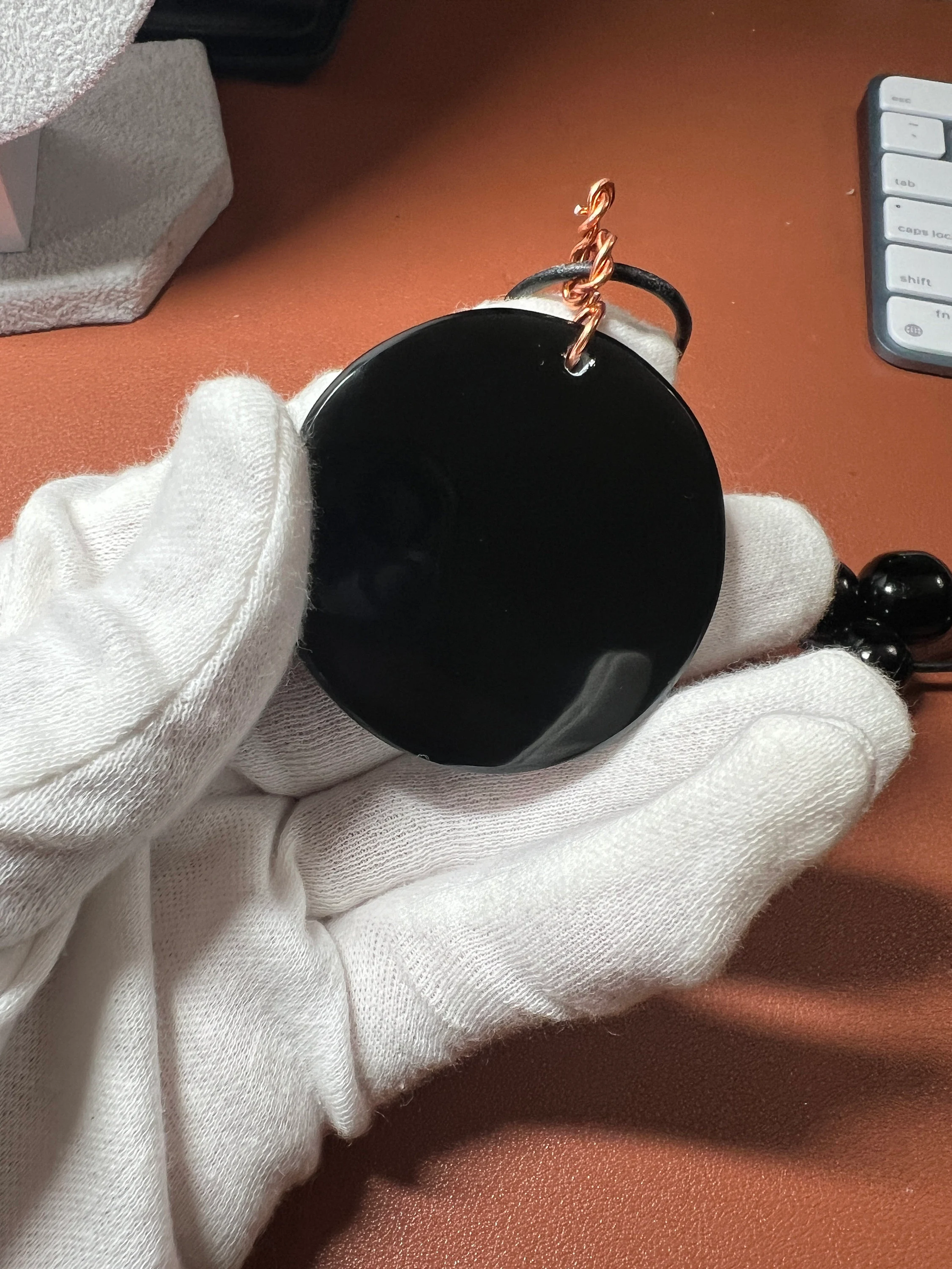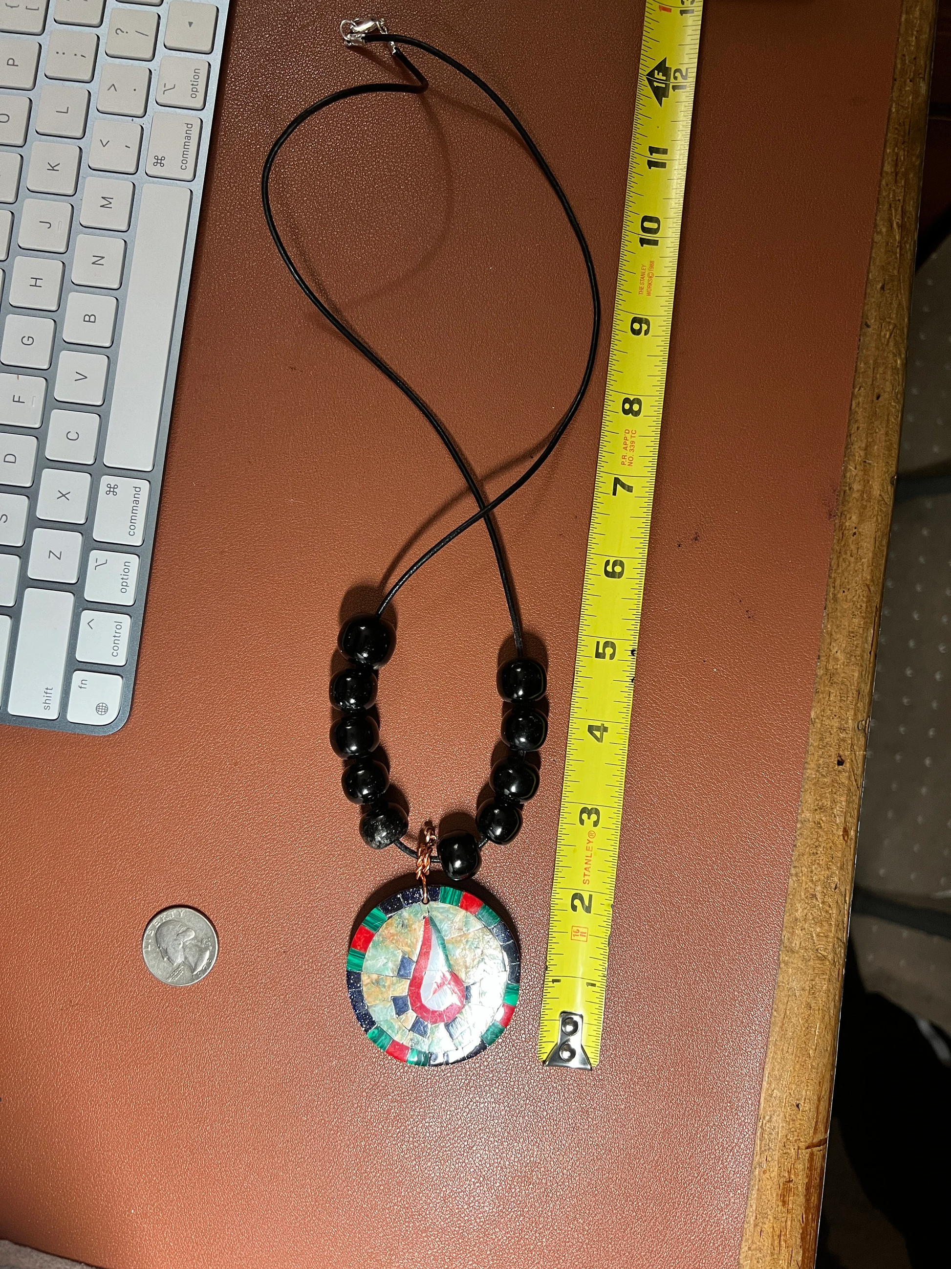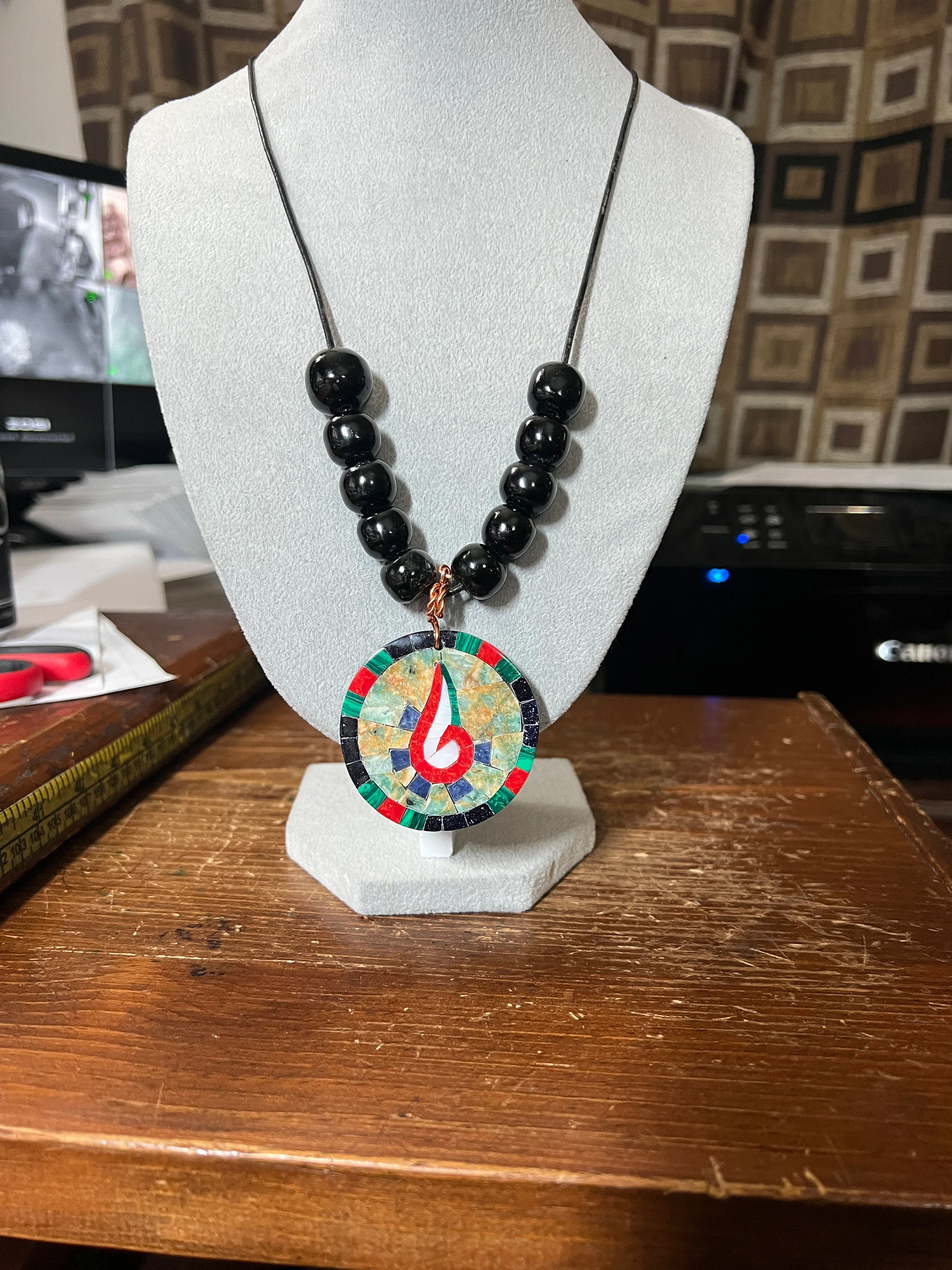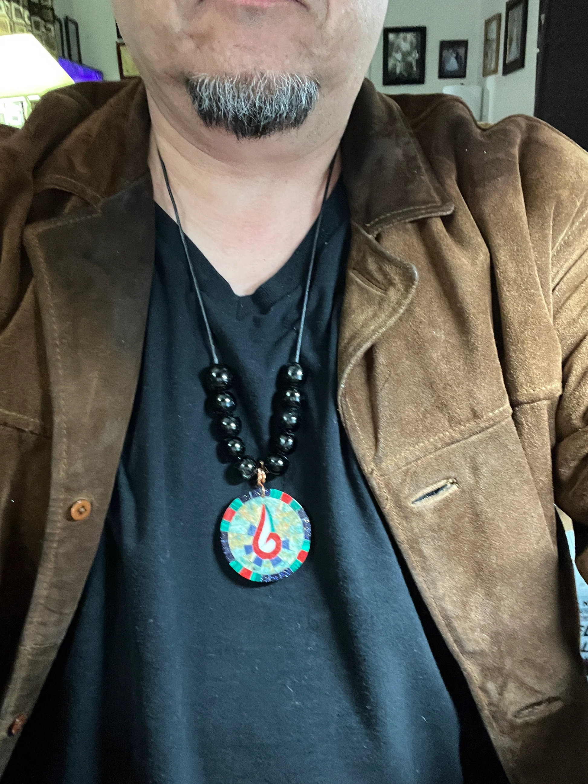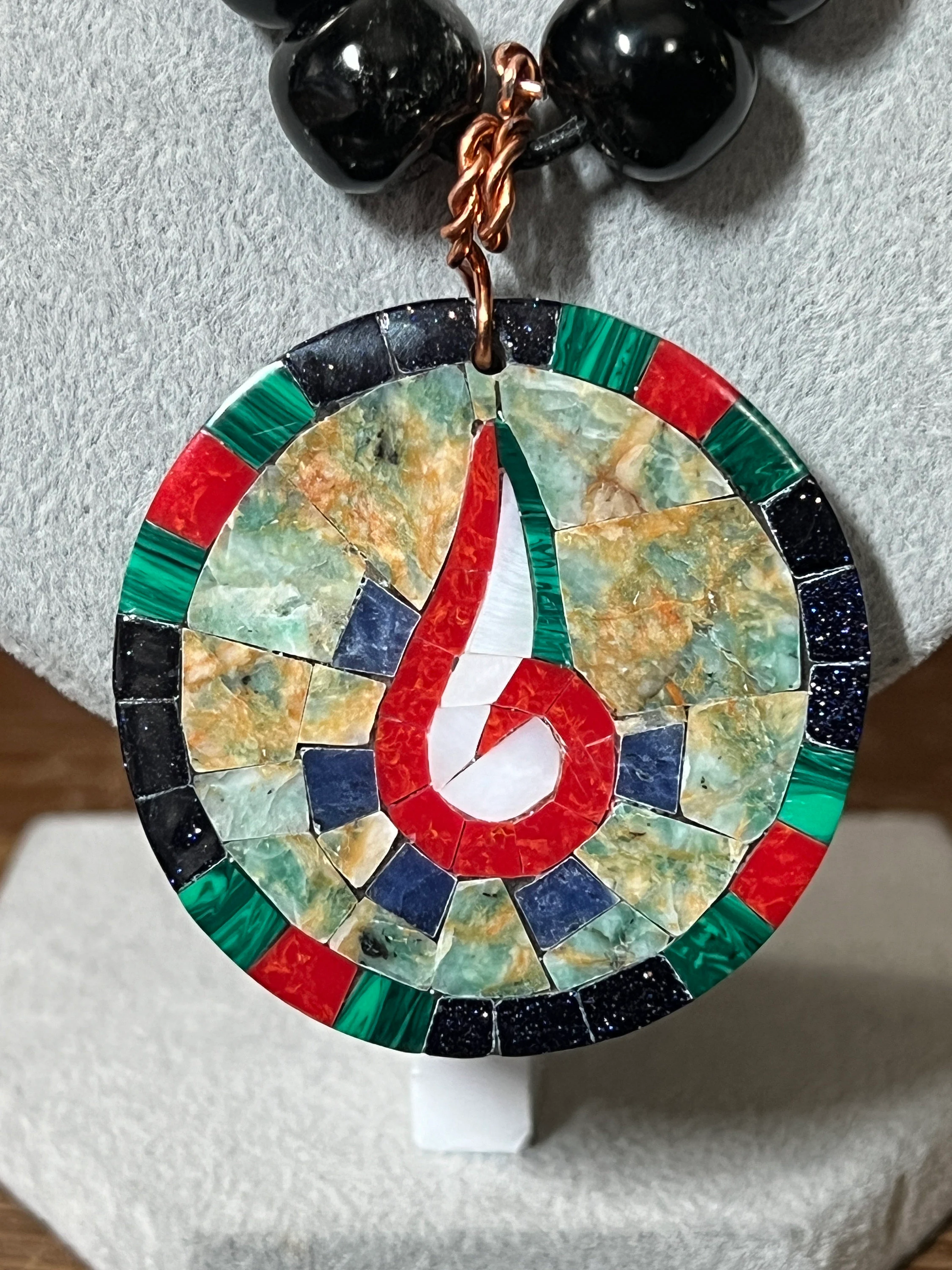 Tenochtitlan Ute-Azteca Nahuatl Speech Symbol Pendant Necklace, Obsidian, Beads, Parakeet Turquoise, Nacre, Coral, Handmade in Mexico (#15)