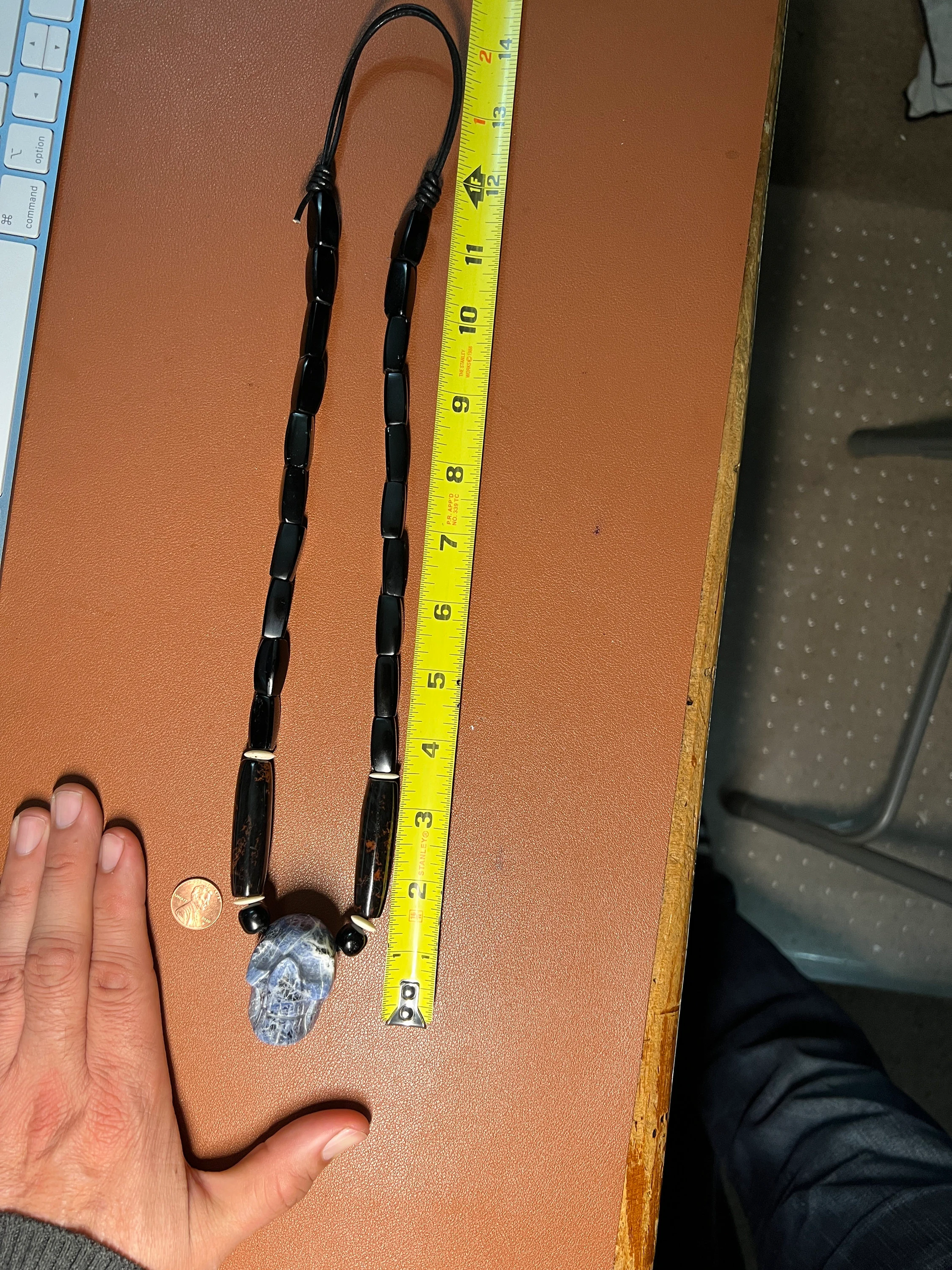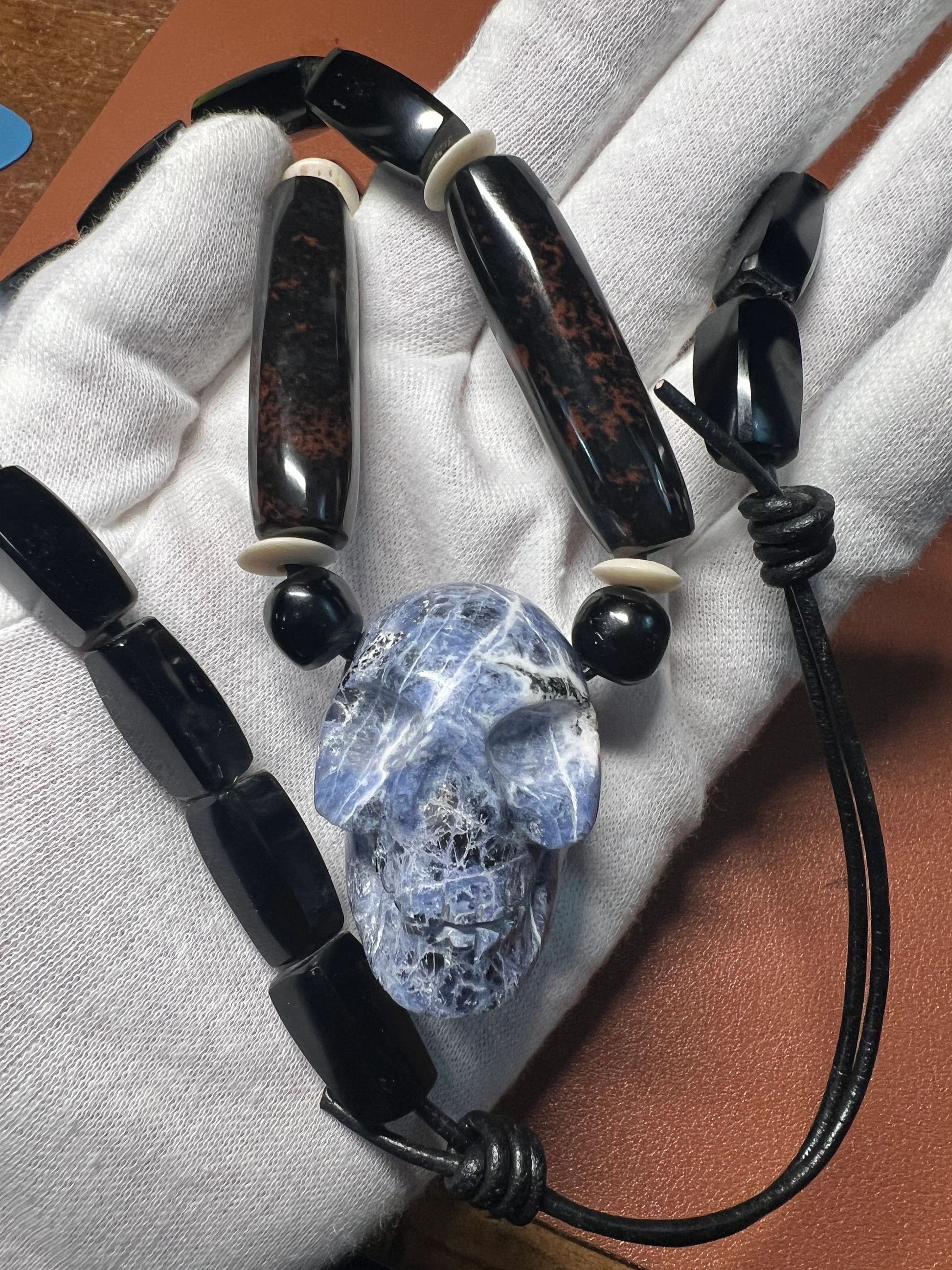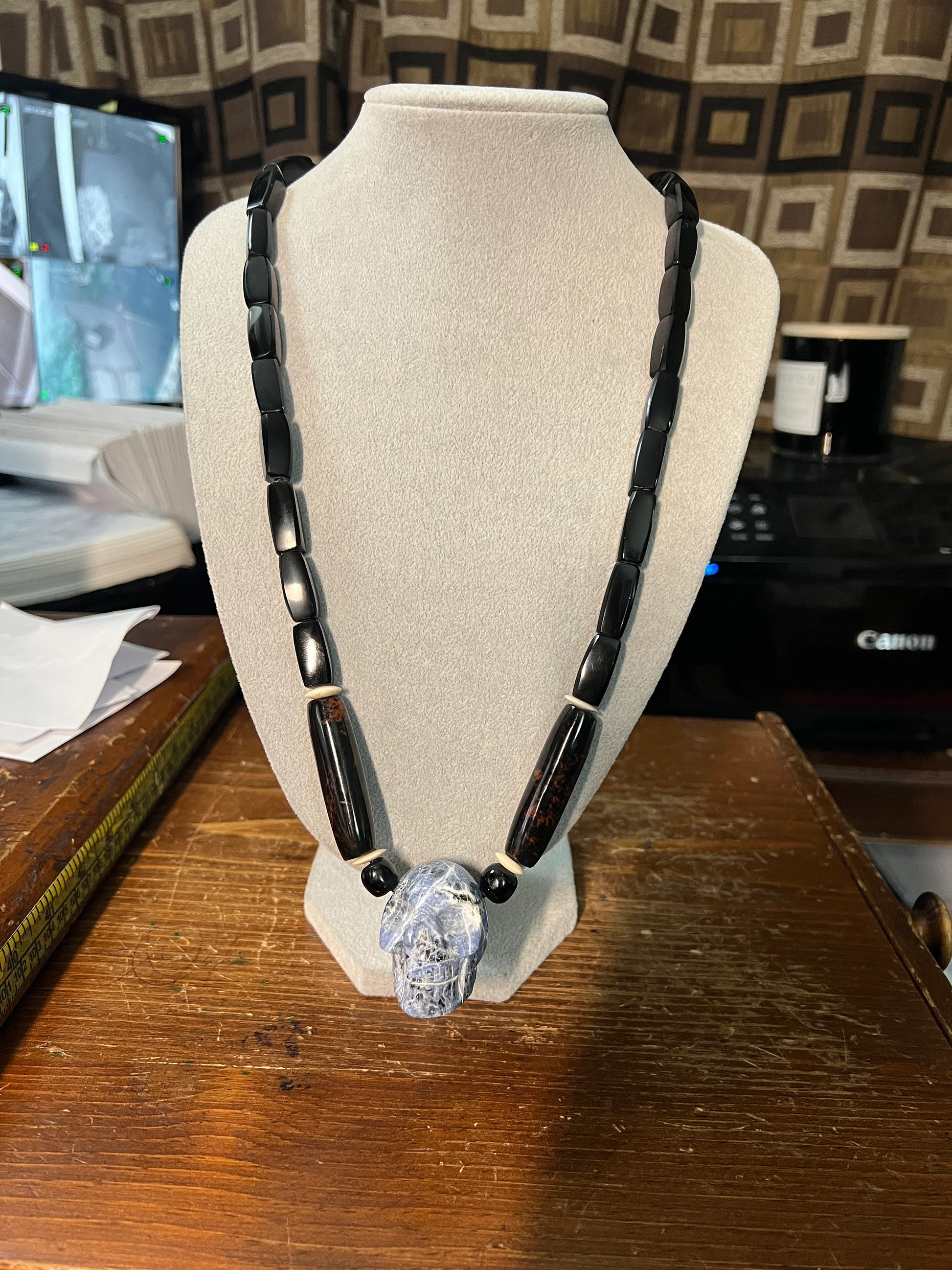 The Blue Skull Pendant, Sodalite Azul, Mahagany and Black Obsidian, one of a kind Necklace, indigenous made in Mexico, 28 plus in.