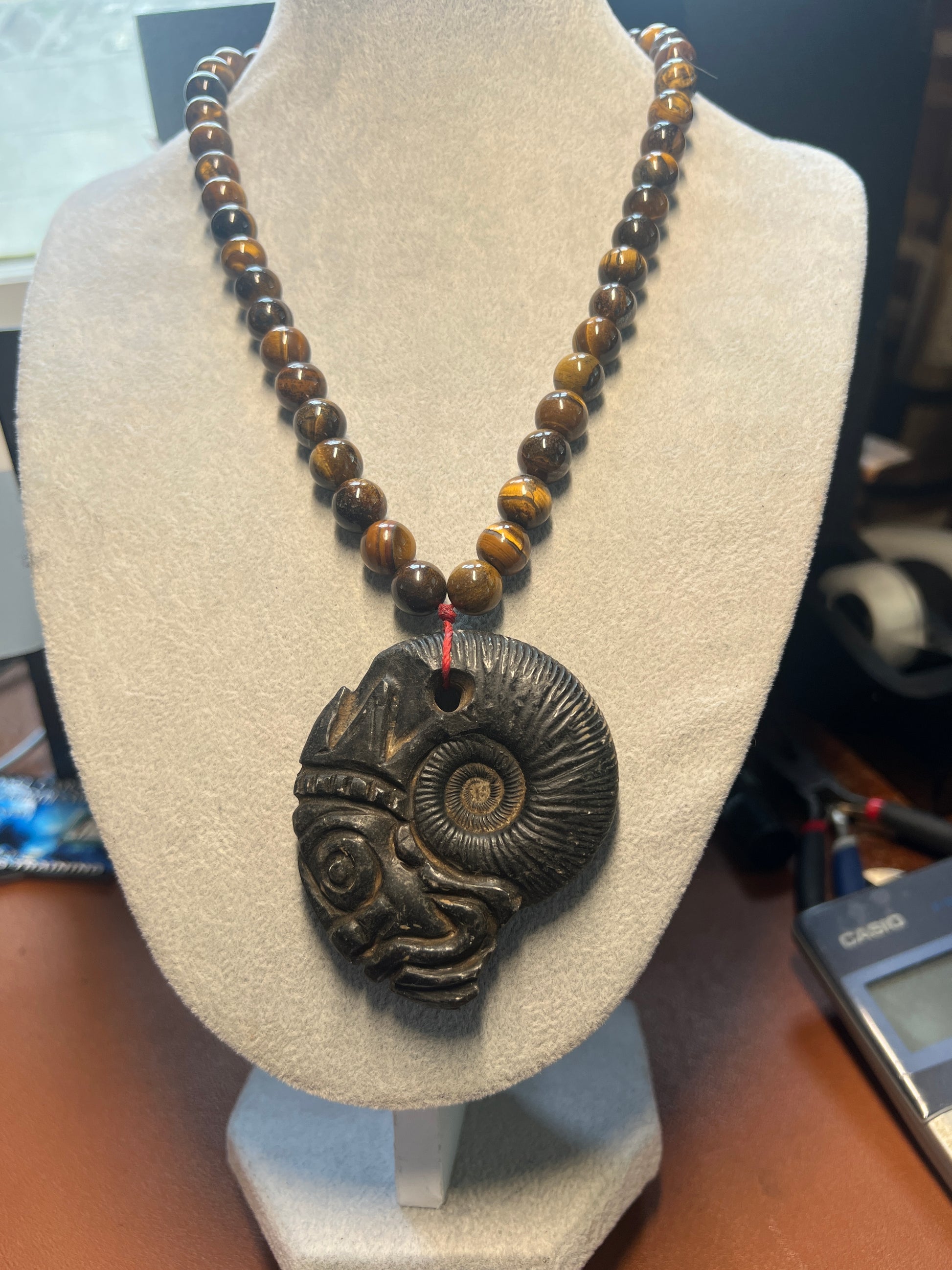 Discover the allure of ancient Mexico with the Tlaloc Aztec Rain God Carved Ammonite Fossil Necklace with Tiger Eye Beads, all natural. This pendant, a masterpiece from the Mexica Tribe, captures the essence of mythical tales and gothic charm. Crafted with meticulous attention to detail, the necklace is a tribute to the storied past, perfect for those enchanted by fairytale and fantasy themes. Ammonite, known for its captivating patterns, provides a unique focal point, while the intricate design showcases the artisan's skill. This piece is a contemporary take on traditional Mexican craftsmanship, making it an exceptional find for collectors and admirers of unique, handcrafted jewelry.