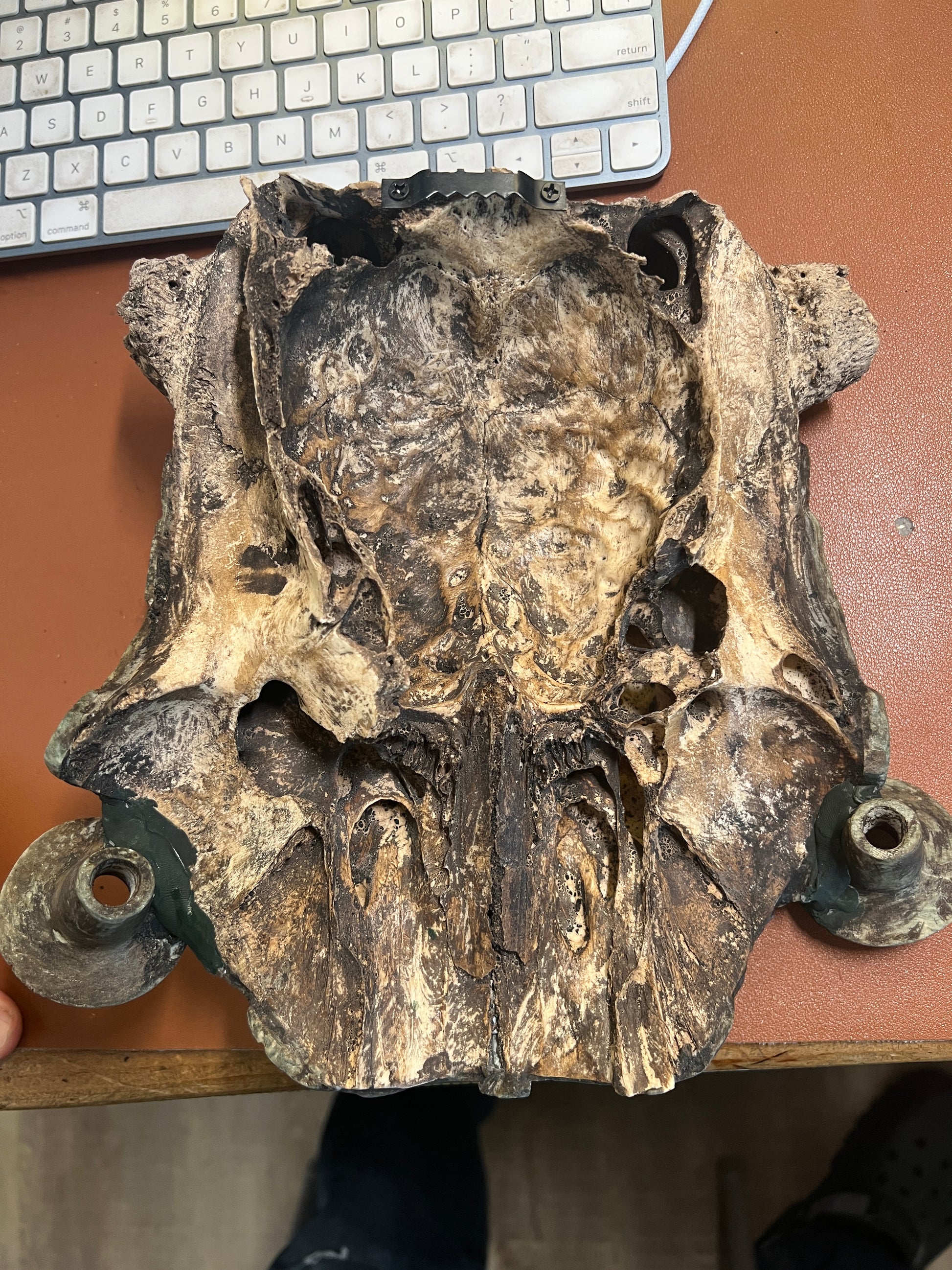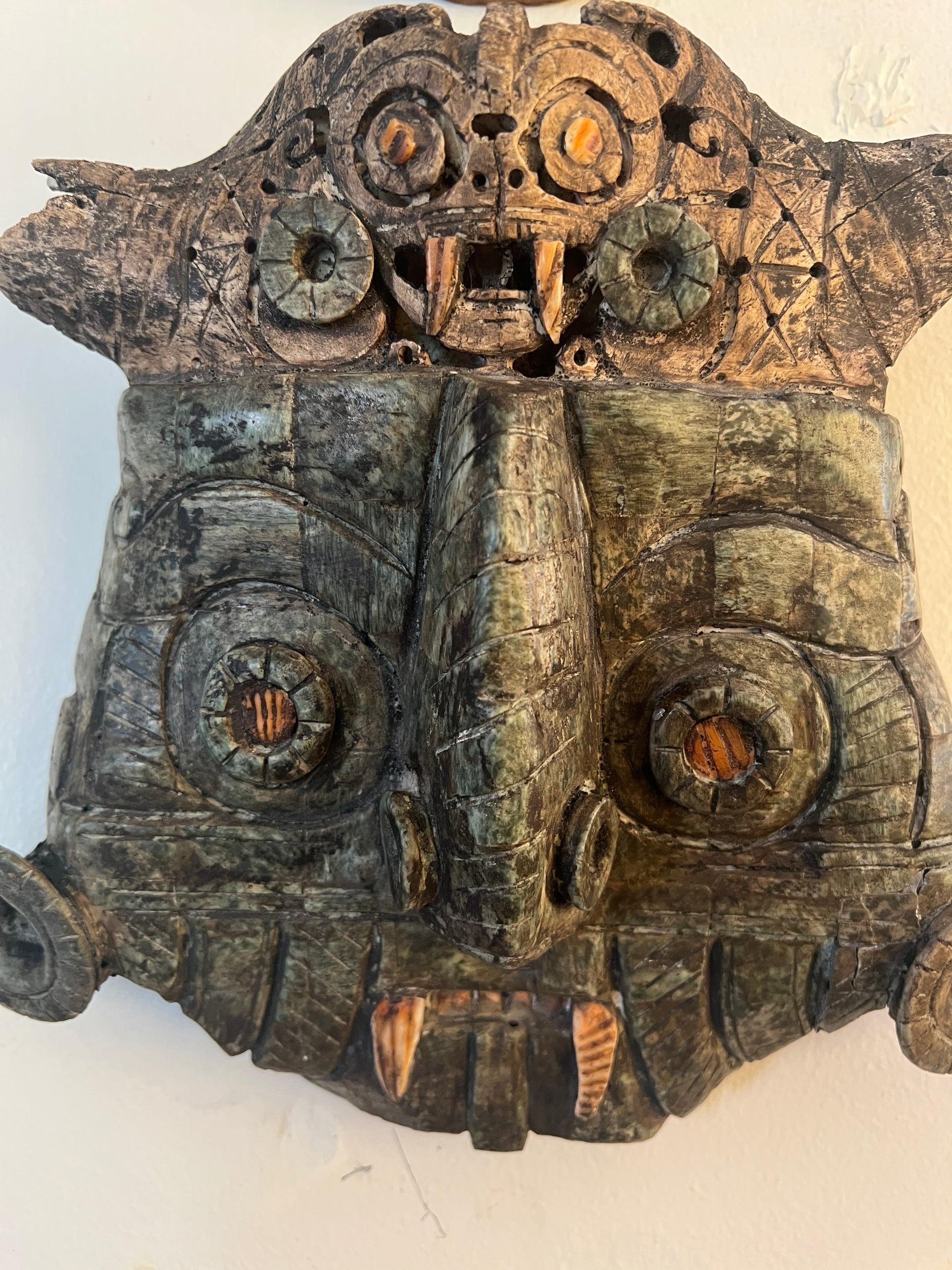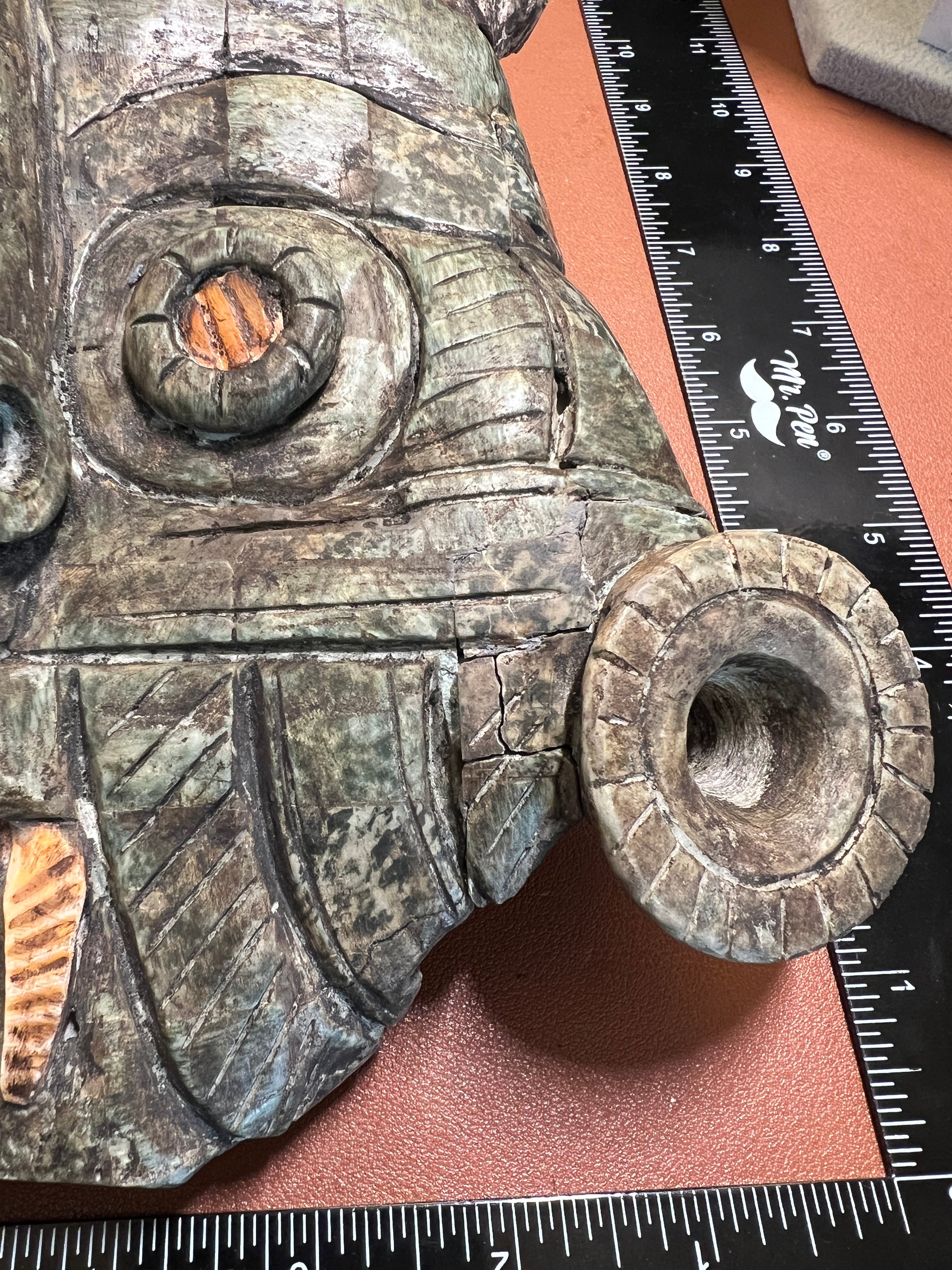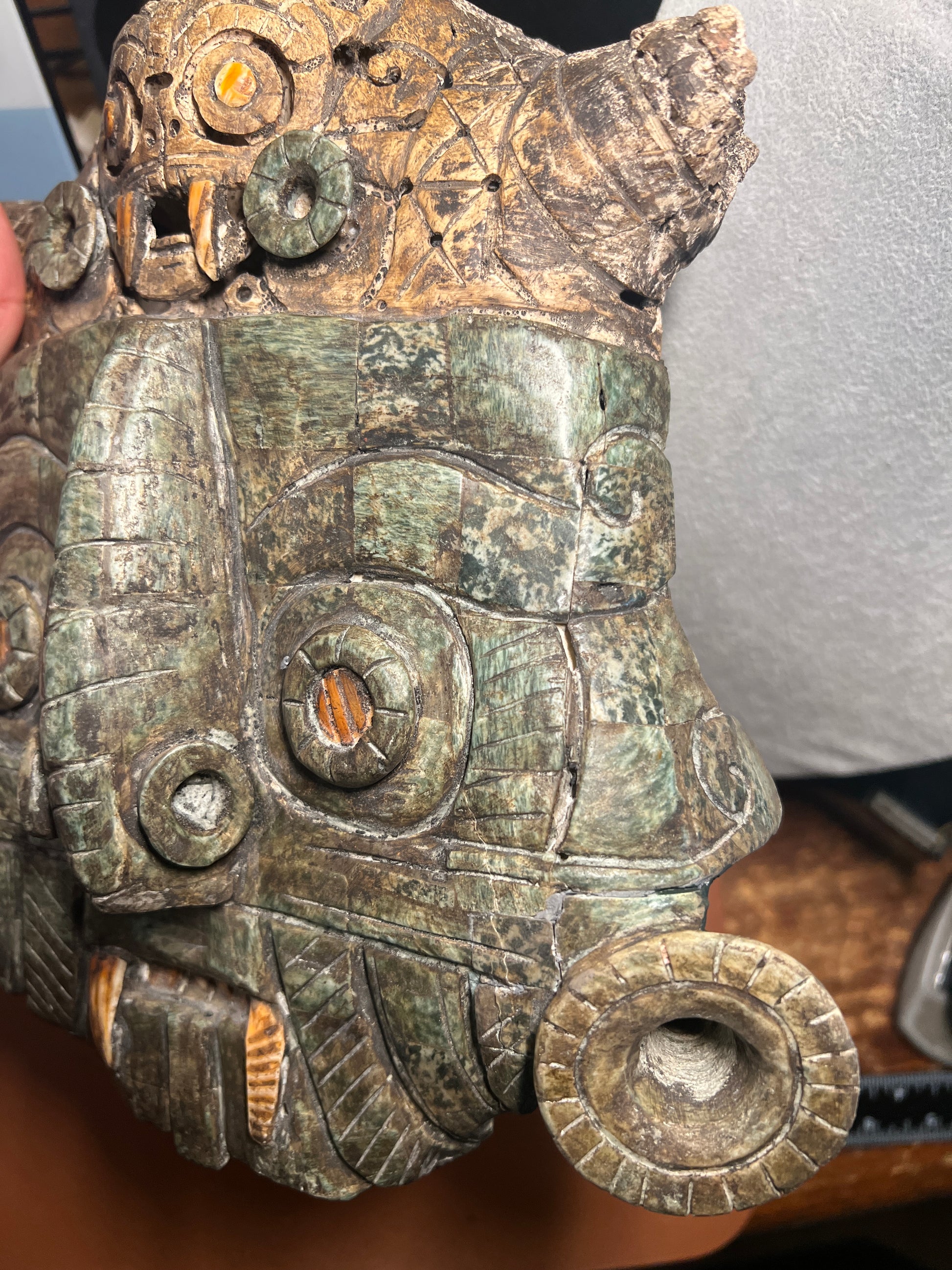 Tlaloc made from a bull skull, the bone is carved on the top, the entire face is carved and inlaid with granite. The fangs and eyes are inlaid with coral, a very unique piece with a lot of work!