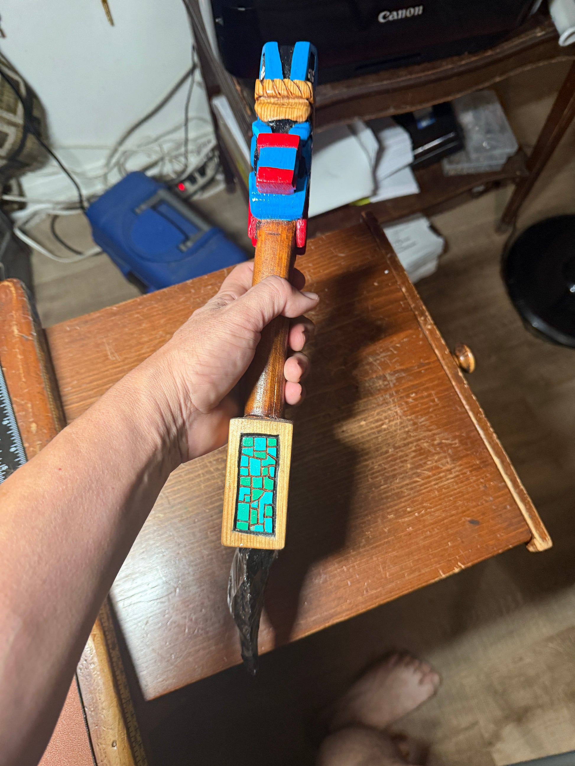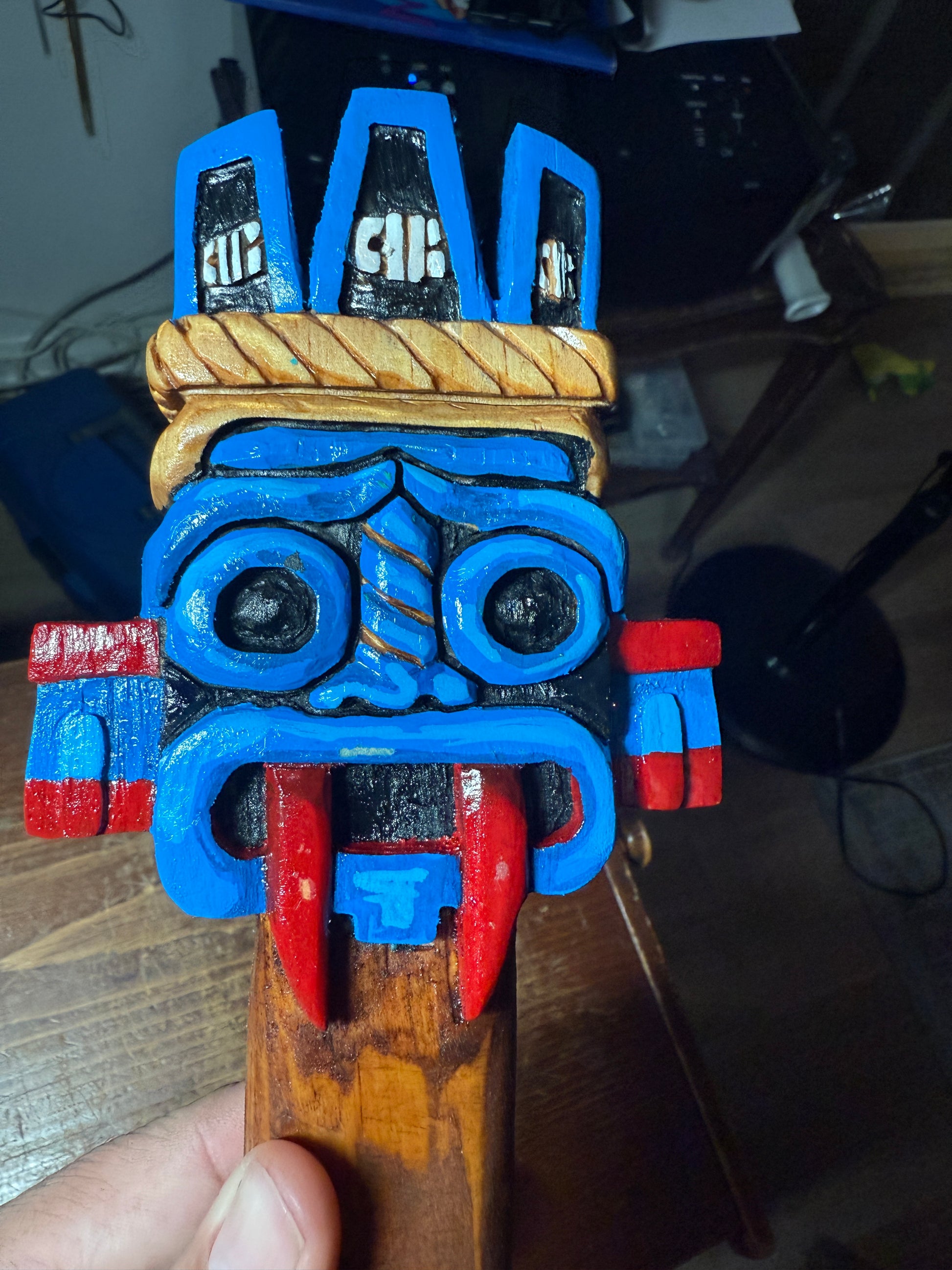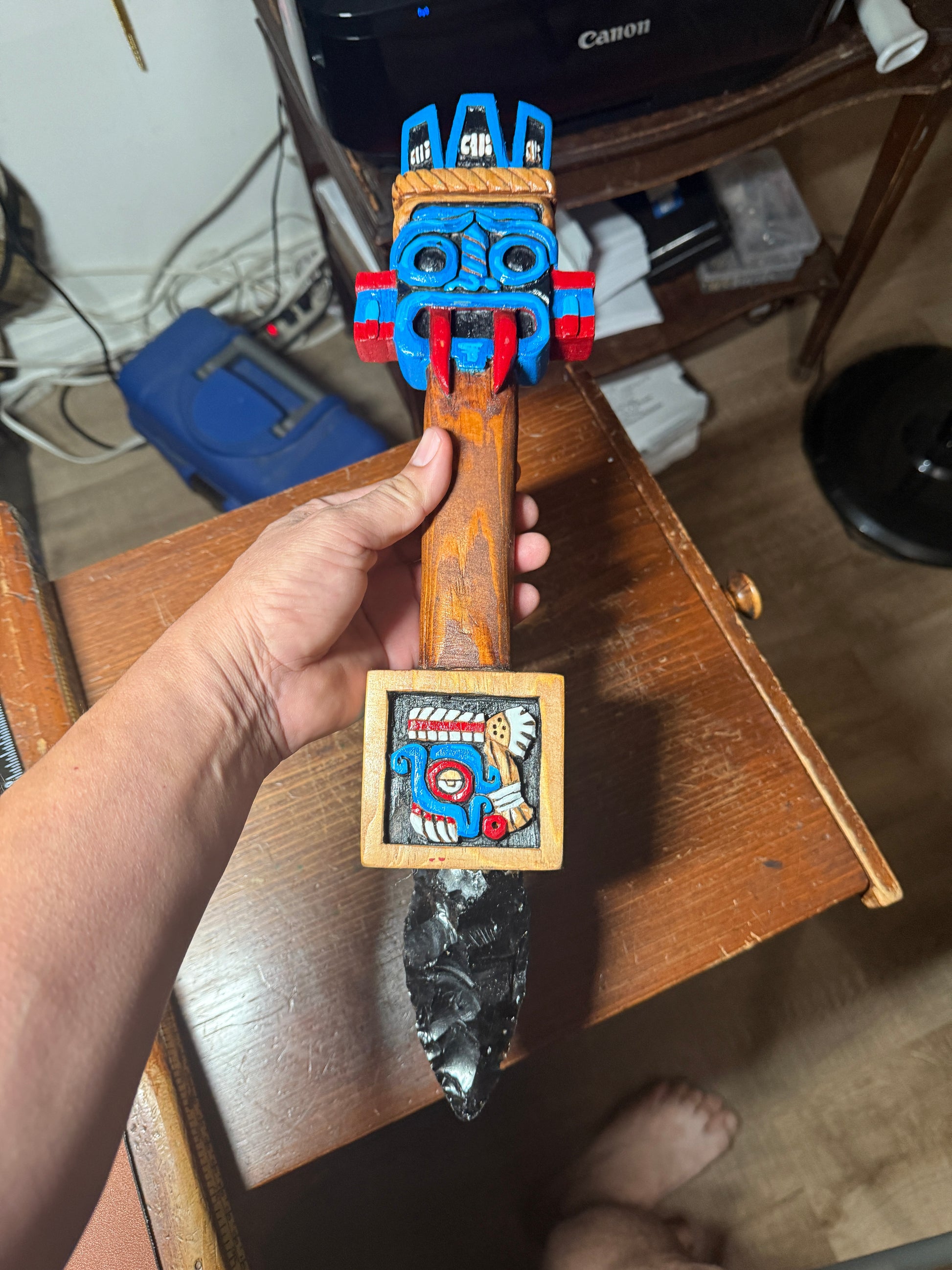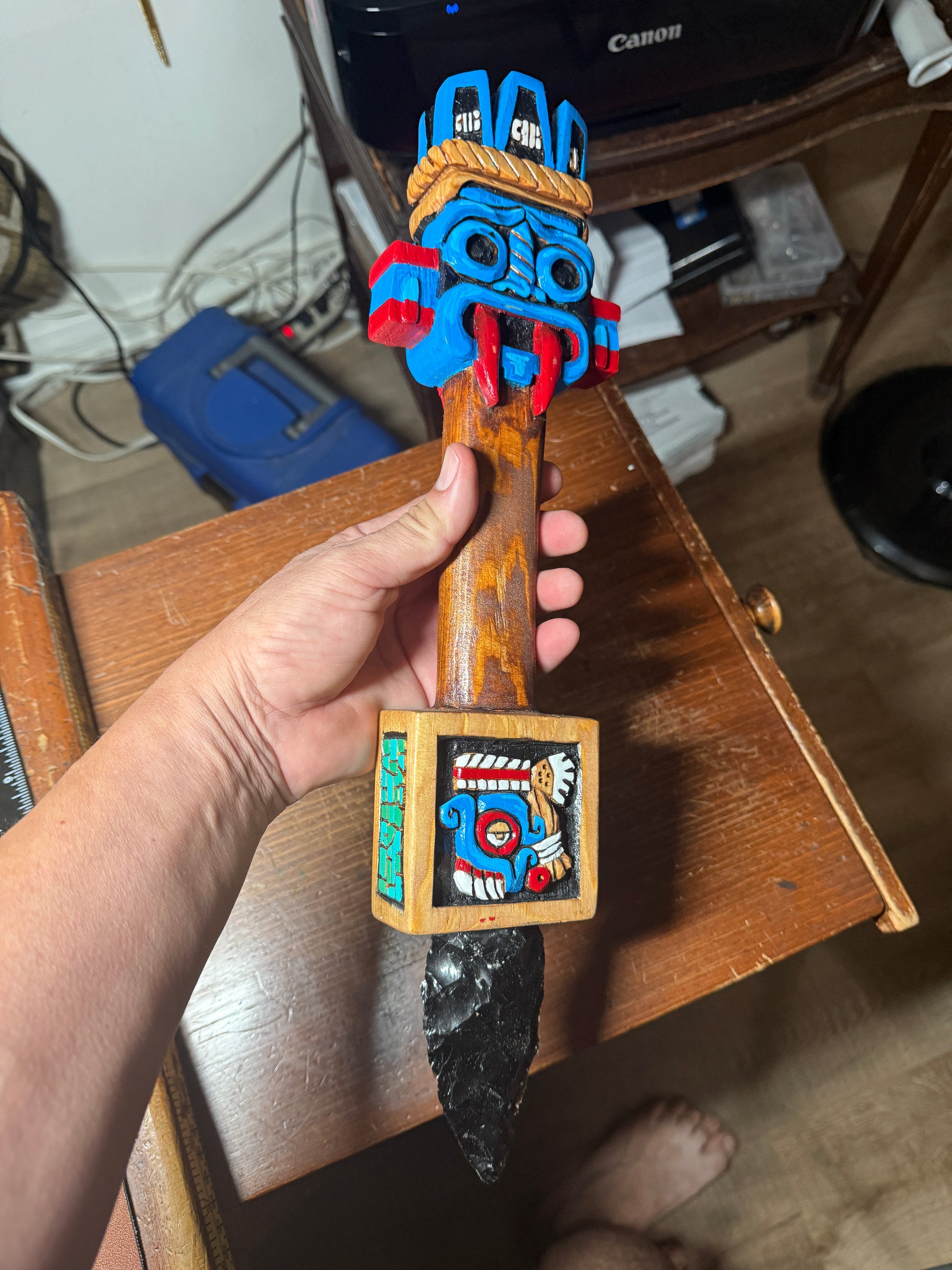 Tlaloc Dagger, Azteca Obsidian Knife, Mexica Sacrificial Daga 17", Deep Wood Carved, Painted