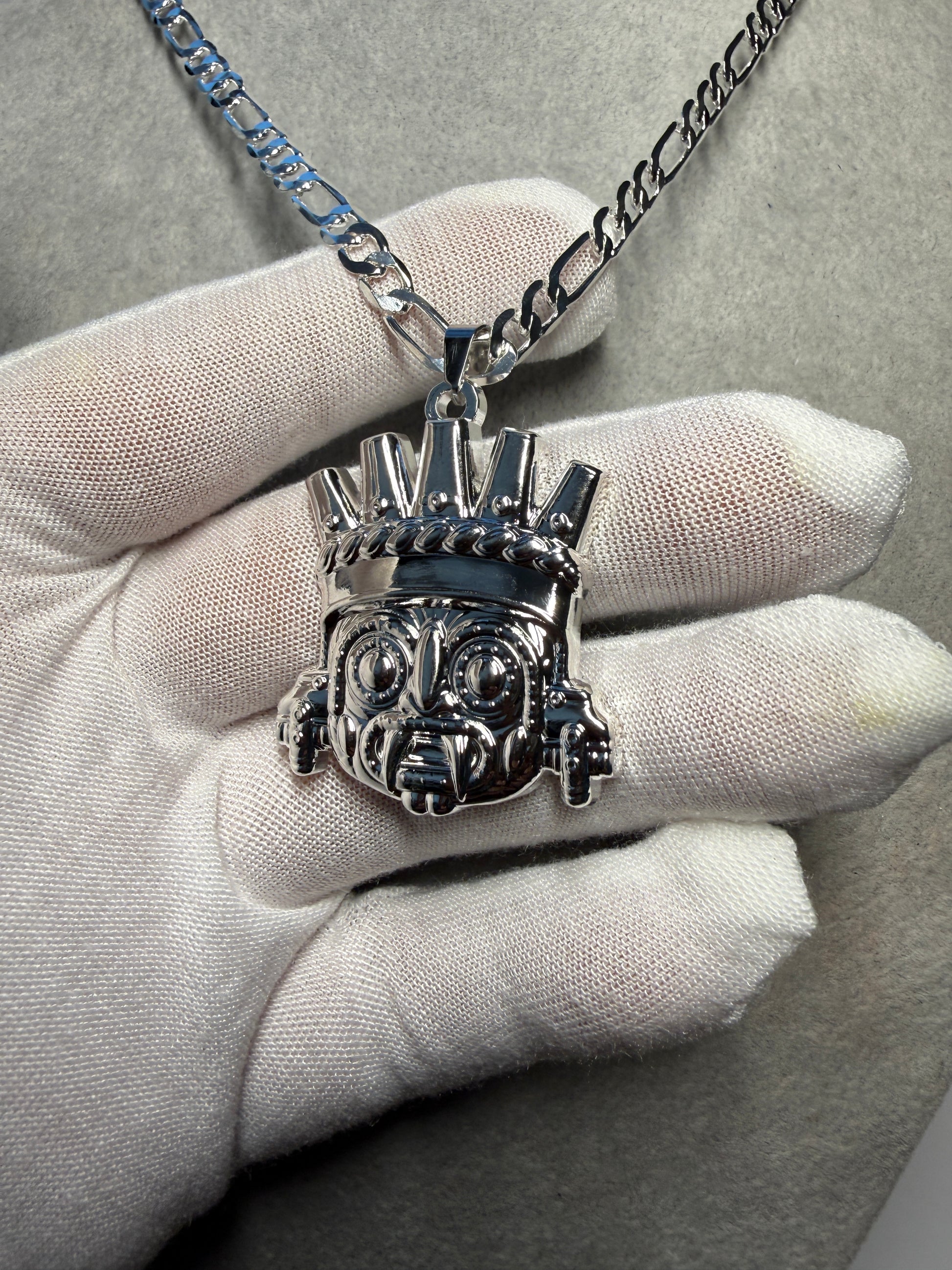 Tlaloc Pendant, Silver Tone, Aztec Rain God, Chain 22.5", Metal Alloy #H