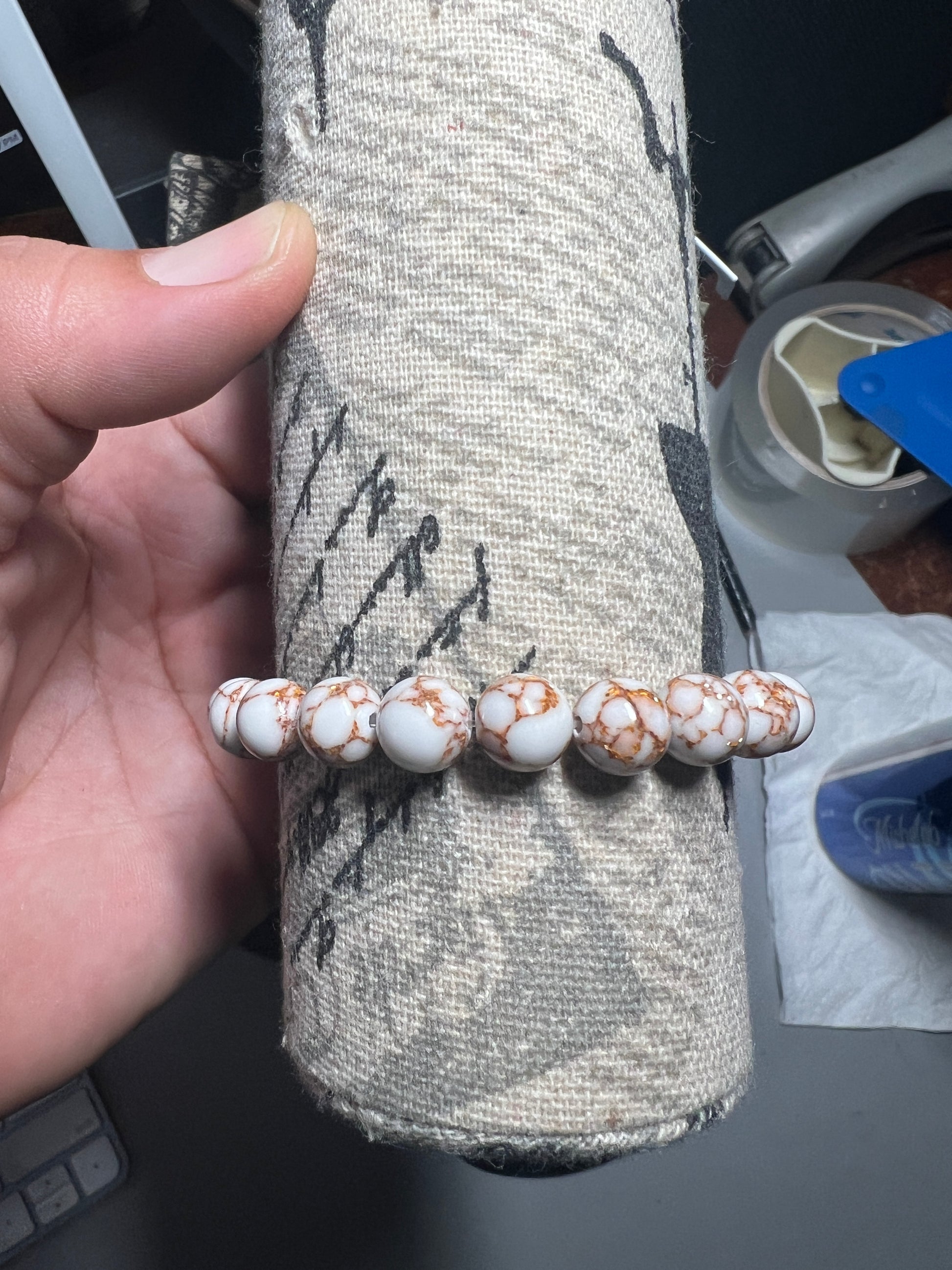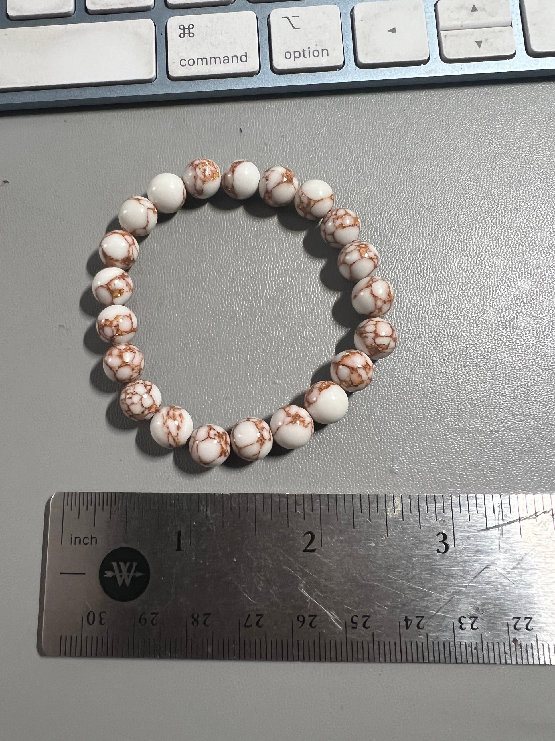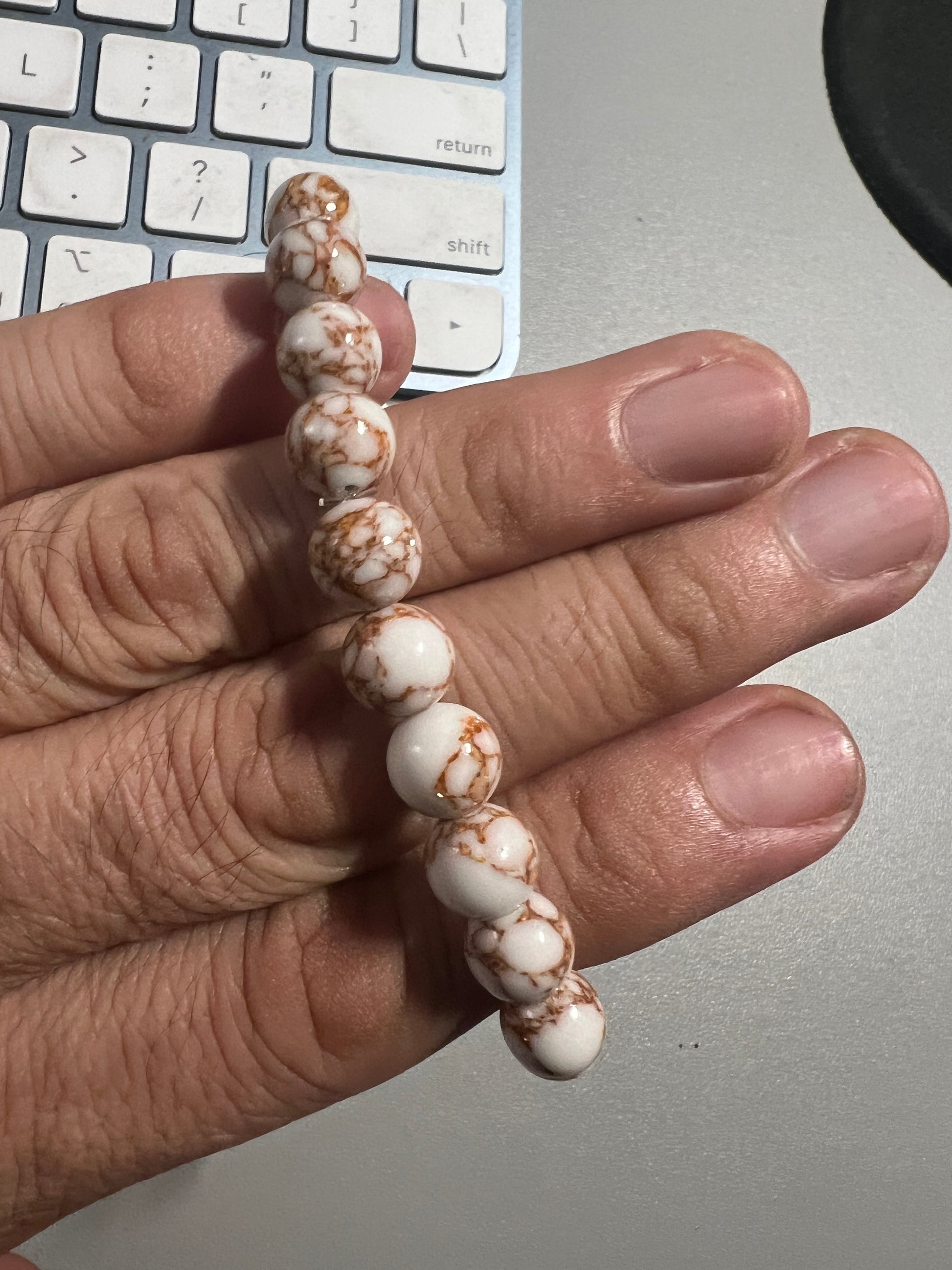 White Howlite Spun Gold Tone Bracelet Stone Round Beaded Mexican Aztec, 6" 8mm #7